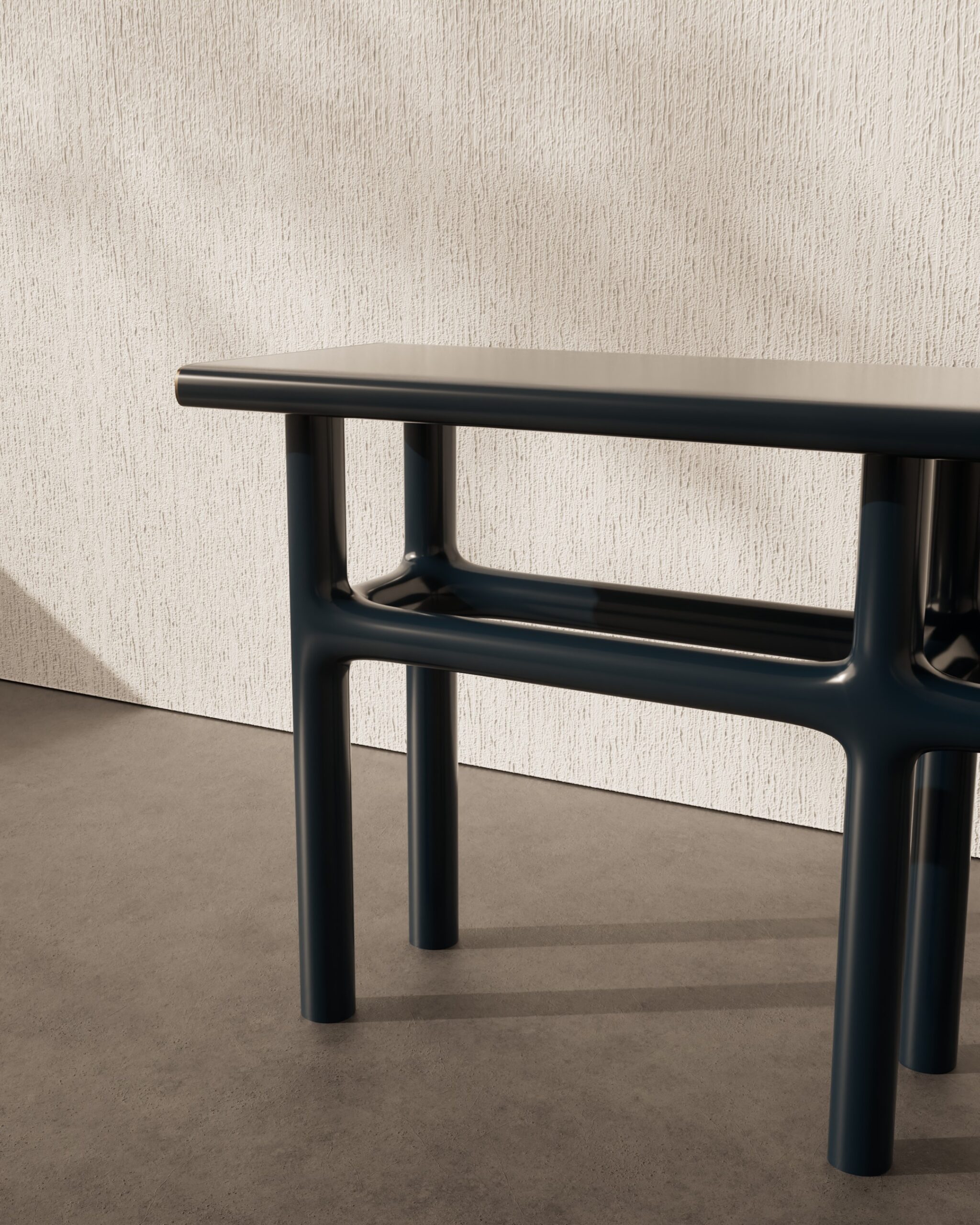 The FLOW console is a study in fluid minimalism and architectural continuity. Part of our Design Studio Collection, the piece is characterized by its slender, tubular framework finished in a deep midnight blue lacquer. The design features an integrated “H-frame” support system where the legs and horizontal cross-beams merge with seamless precision, creating a sense of a singular, uninterrupted line. This streamlined base supports a matching high-gloss top, accented by subtle satin brass end-caps that provide a refined material transition. The FLOW balances a lightweight, airy silhouette with a bold color statement, making it a sophisticated anchor for contemporary hallways and minimalist living spaces.
