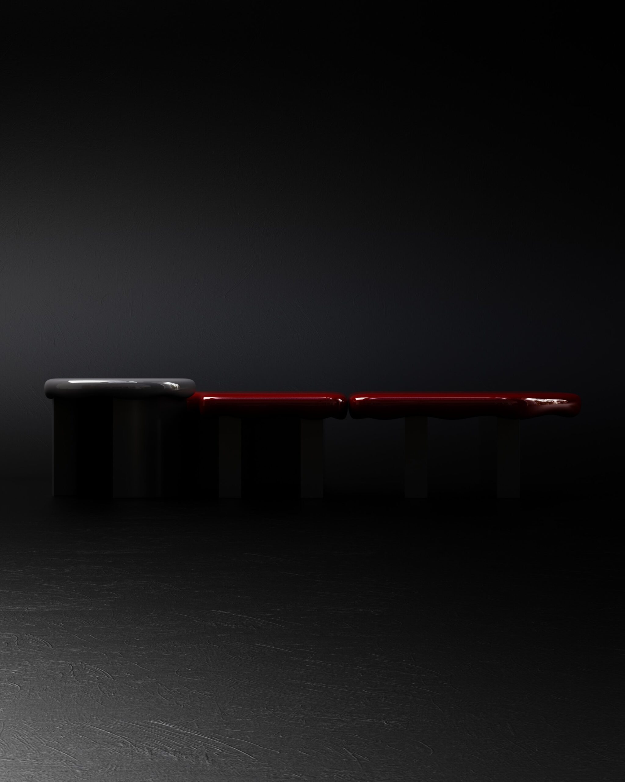 Slate-toned concrete, antiqued bronze, deep oxblood