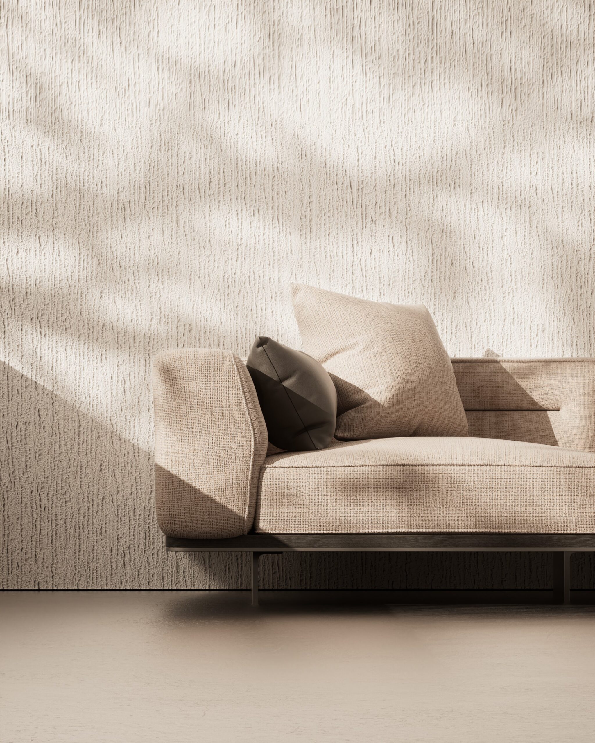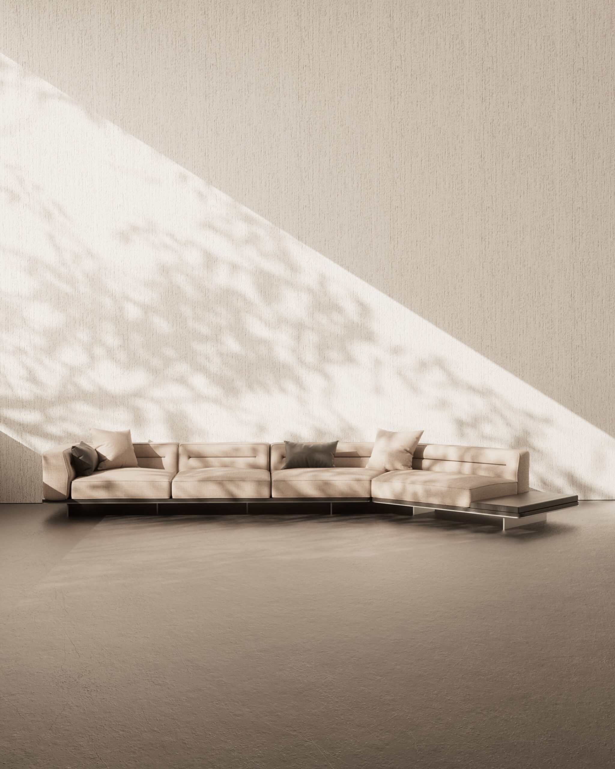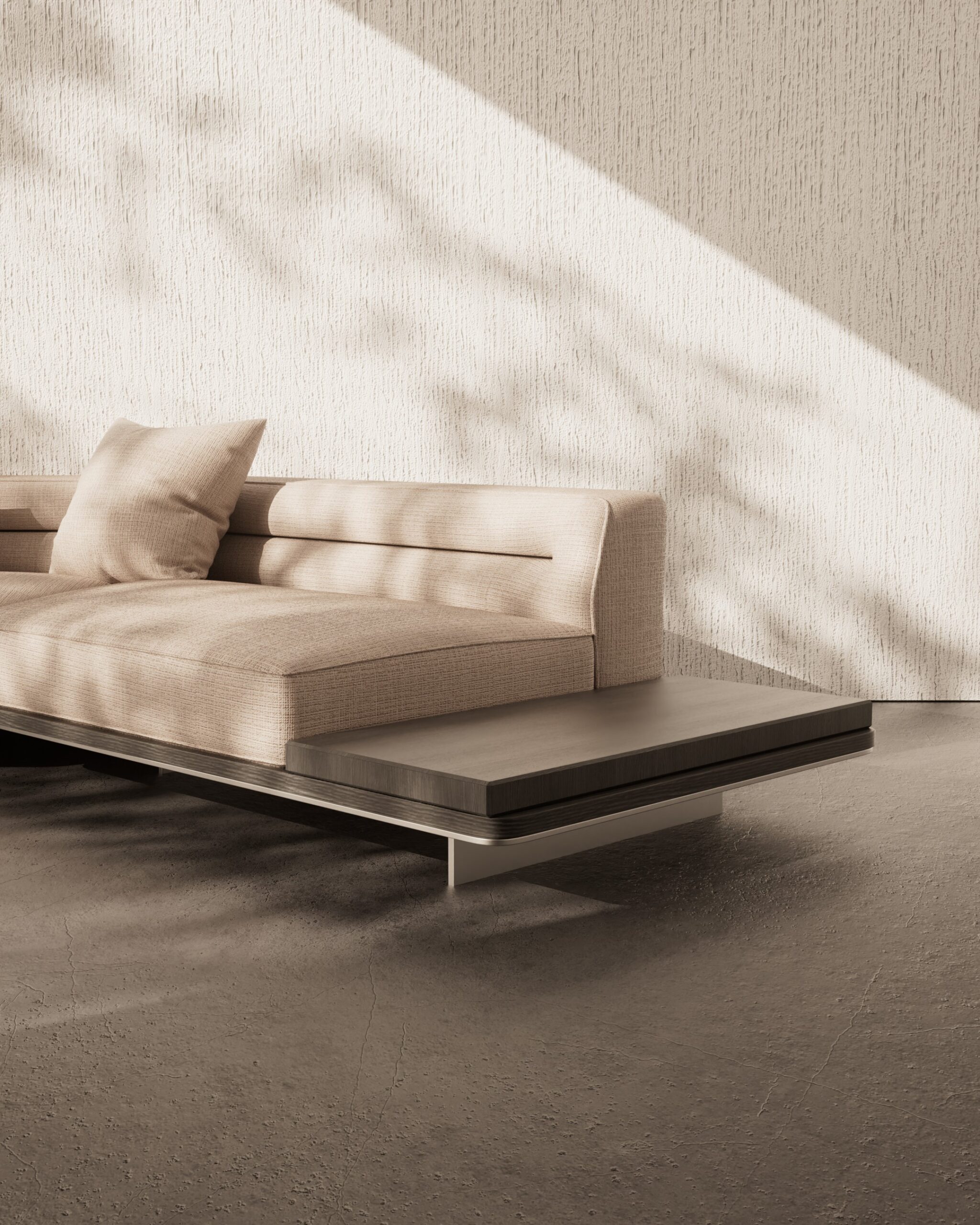 The FYNN sofa seamlessly blends functionality with modern aesthetics. Its low-slung, floating silhouette is anchored by an integrated dark wood platform table that extends distinctively from the frame, merging seating with surface space. Upholstered in a tactile beige fabric, the design is elevated by precise horizontal stitching across the back cushions, adding a tailored, linear element to the relaxed form.