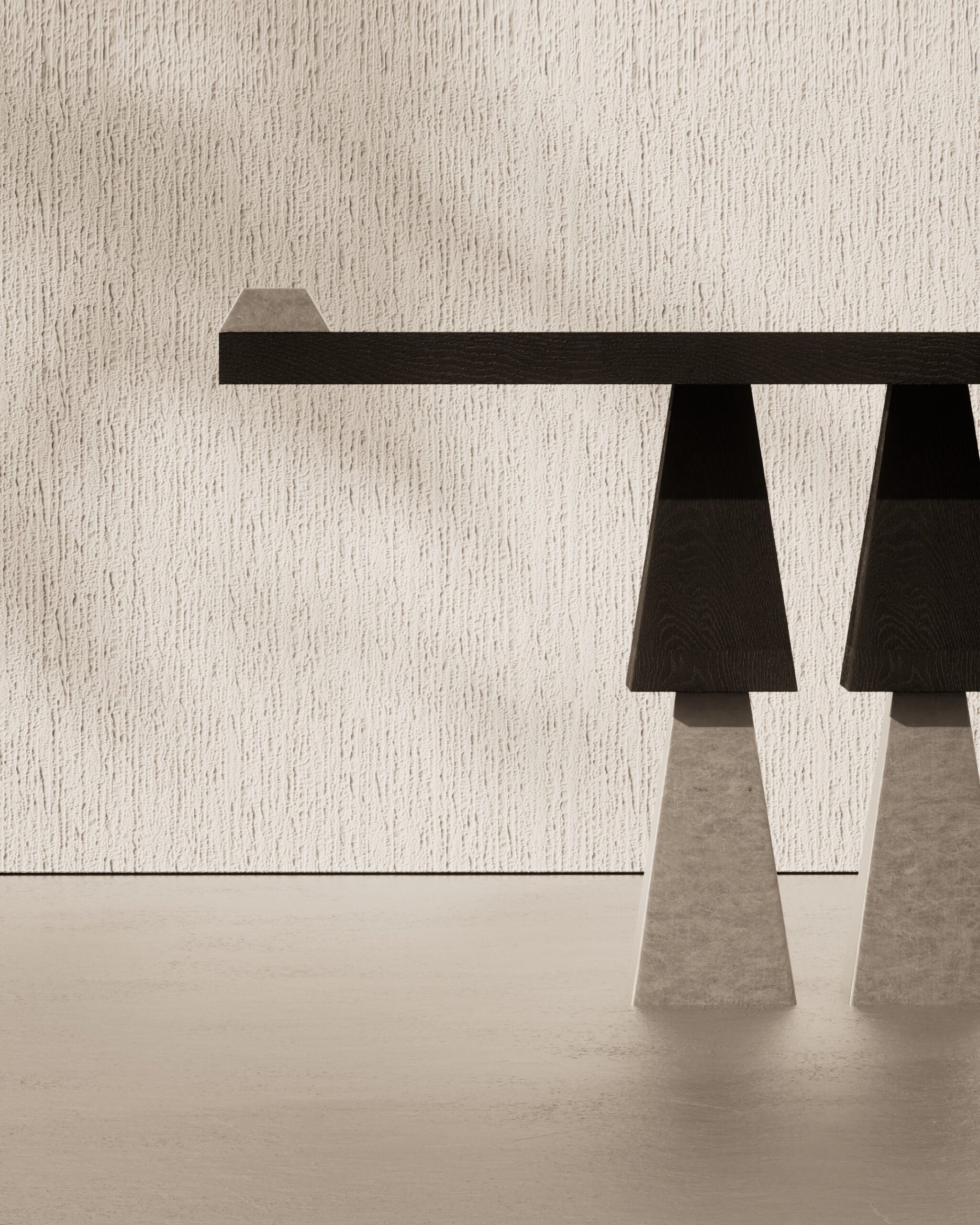 The HALO console is a study in tectonic balance and formal intersection. Part of our Design Studio Collection, the piece is characterized by its substantial, cantilevered top crafted from textured charcoal wood, which displays a deep, tactile grain. The architectural narrative is defined by two central, tapering pedestals that rise from a matching wooden base to “pierce” through the primary horizontal plane. This heavy timber volume is punctuated at either end by recessed matte champagne metallic accents—geometric, wedge-like caps that provide a refined material transition and a sense of protective weight. The HALO balances a bold, monolithic footprint with clean industrial details, offering a powerful sculptural anchor for contemporary entryways and gallery spaces.