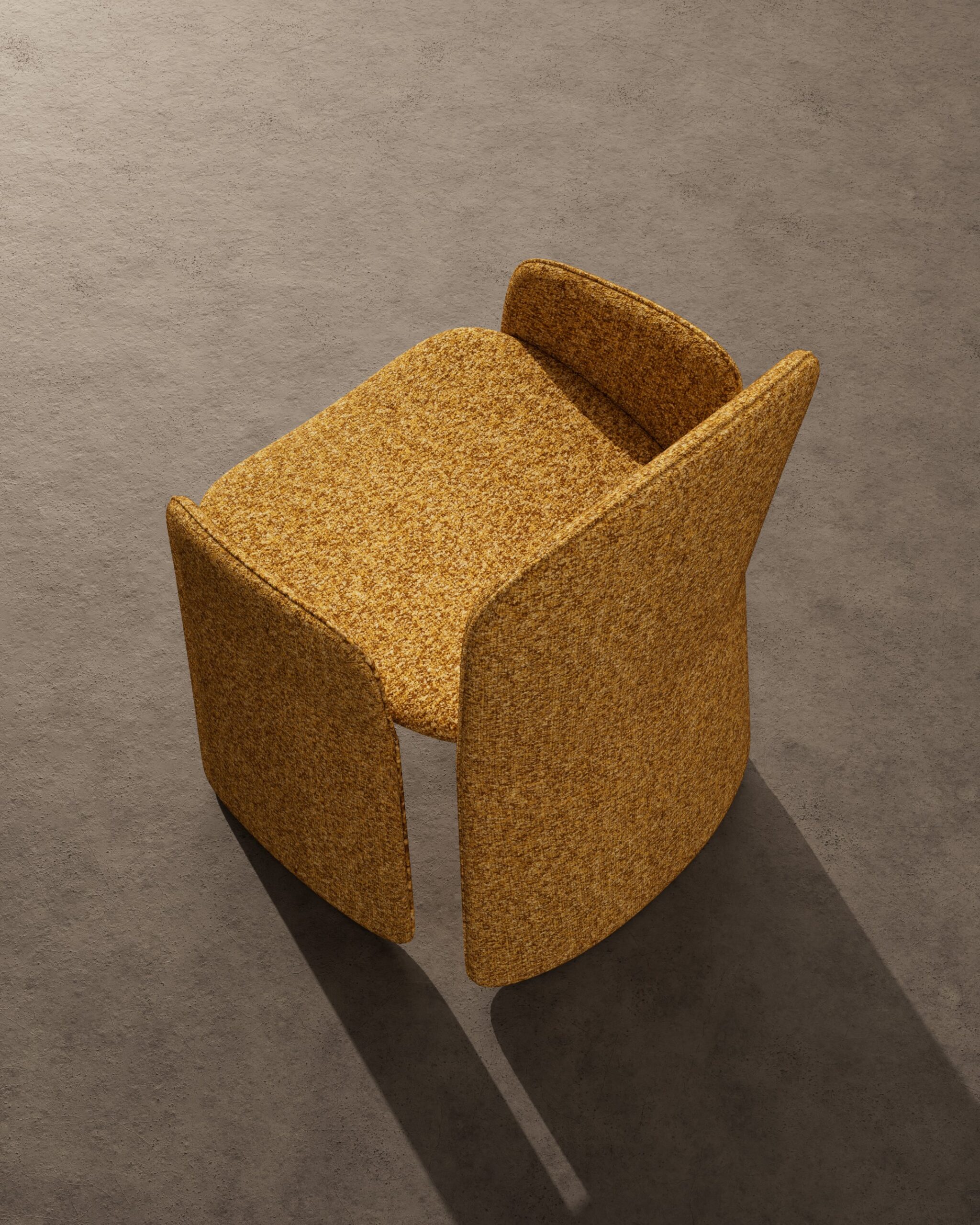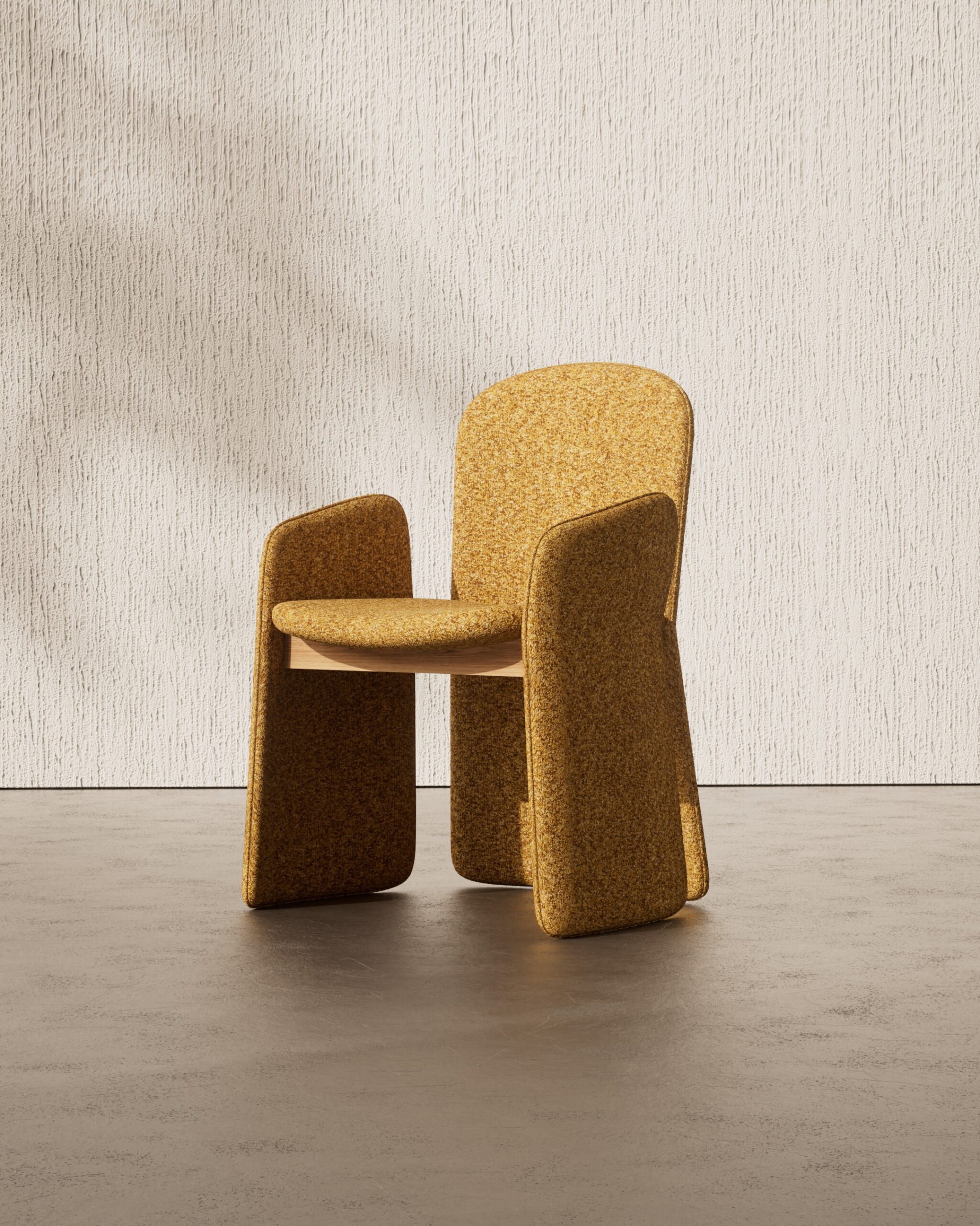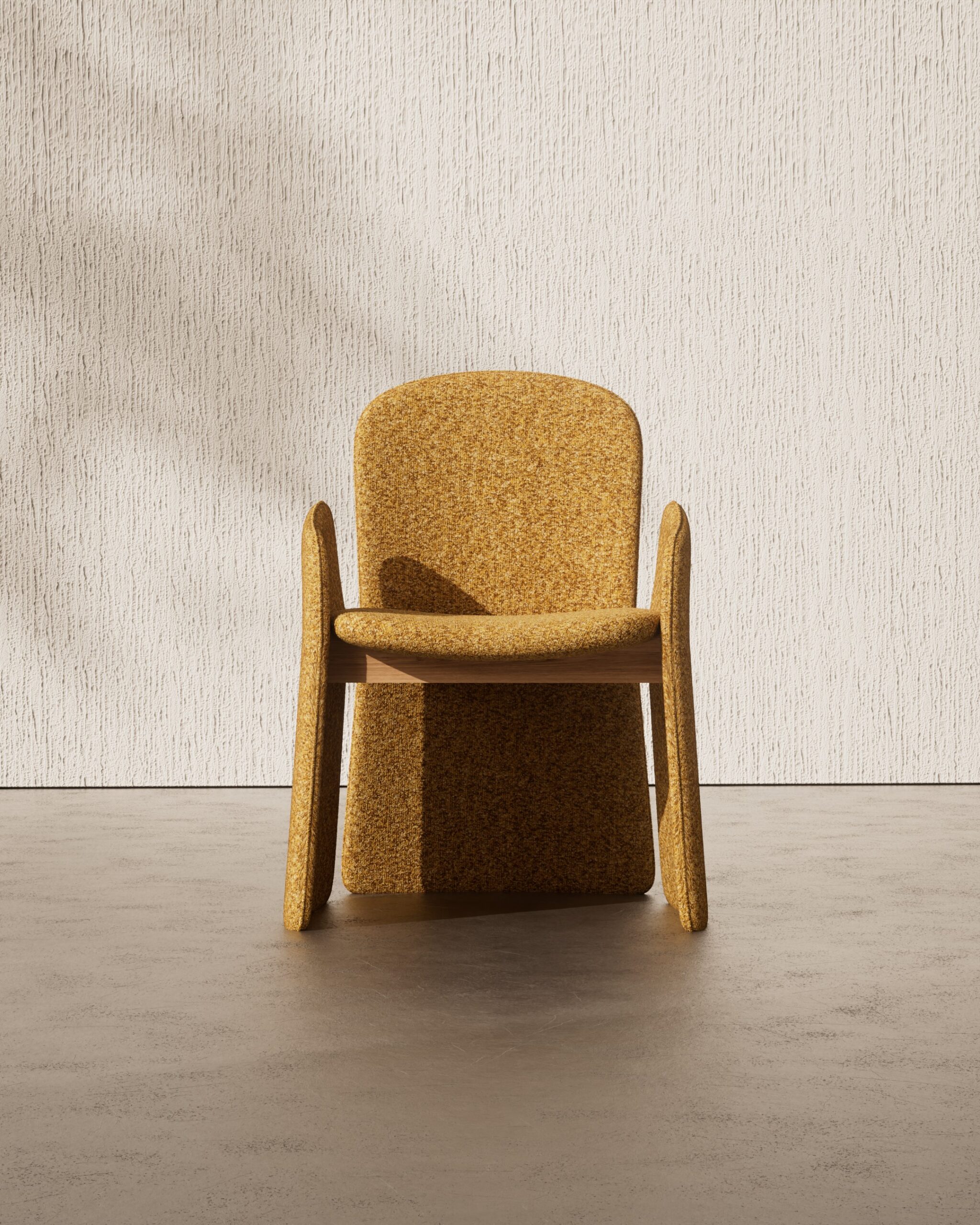 The HENLEY dining chair is a study in tonal warmth and protective geometry. Part of our Design Studio Collection, it features a distinctive three-point shell upholstered in a rich ochre bouclé, providing an enveloping sense of comfort. The chair’s architectural presence is defined by its wide, flat-profile legs that extend upward to form the armrests, seamlessly flanking a tall, rounded backrest. A subtle natural oak rail is visible beneath the seat, offering a refined material transition that grounds the vibrant textile within a clean, modern framework.