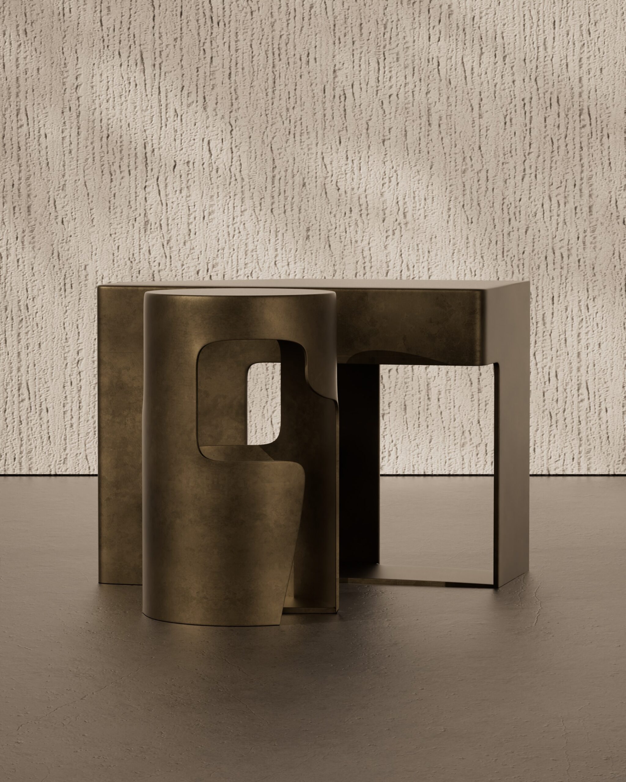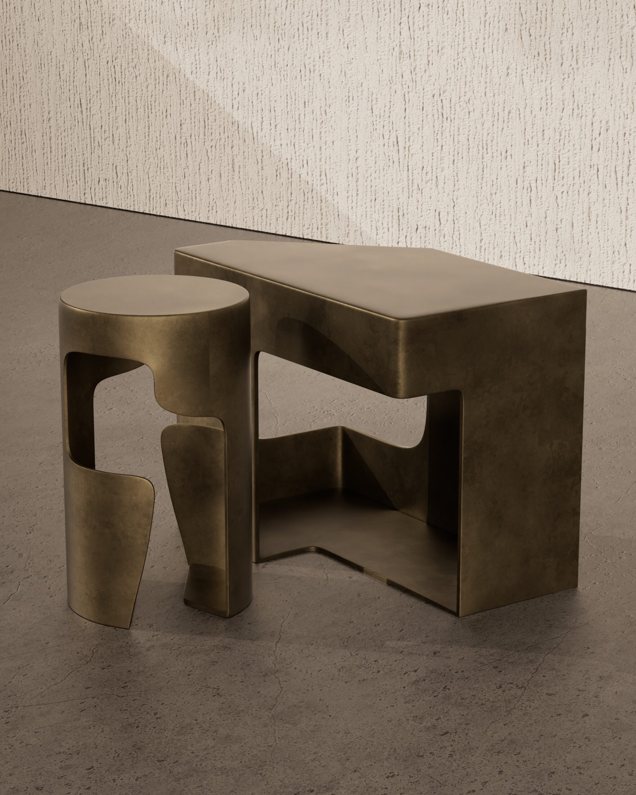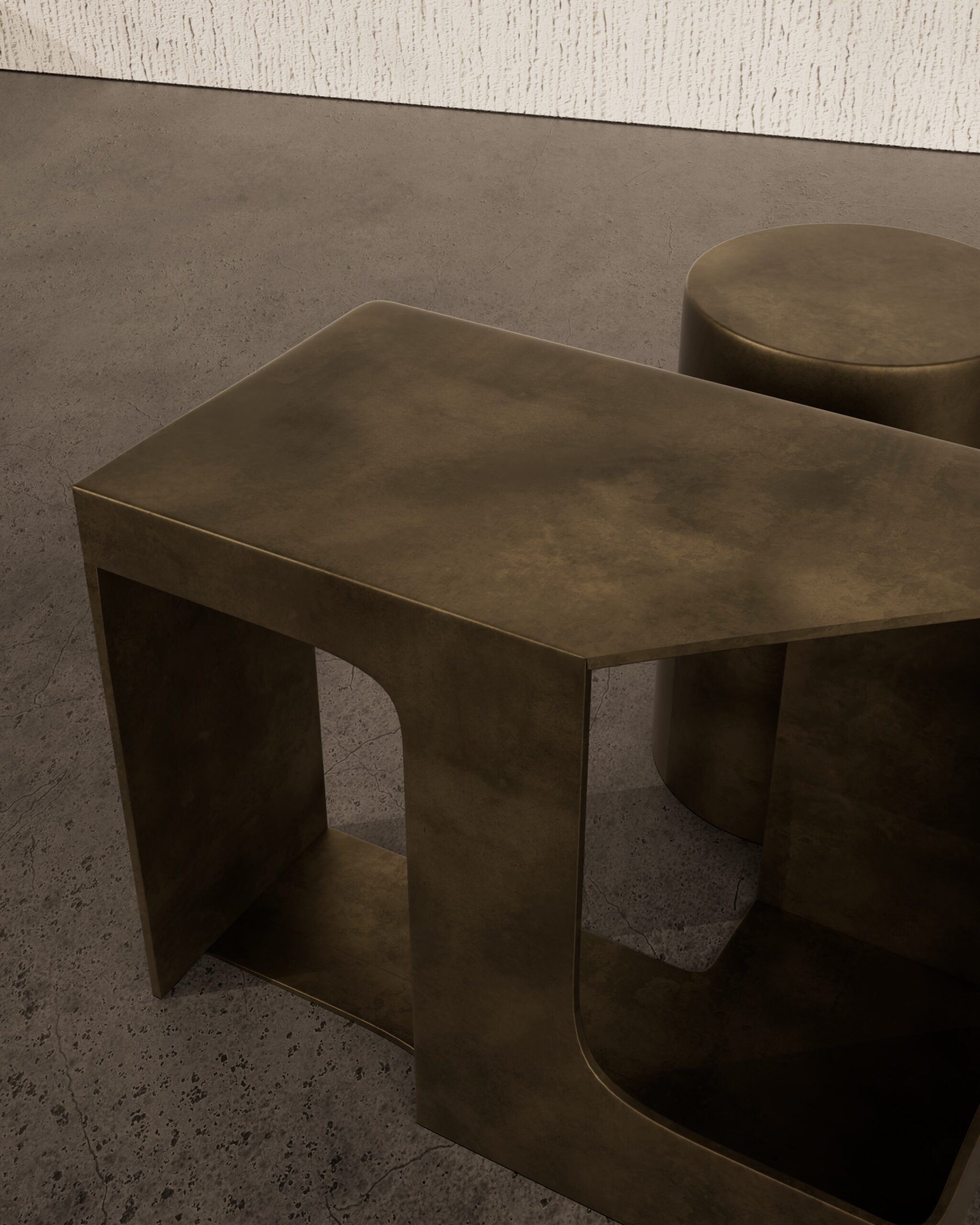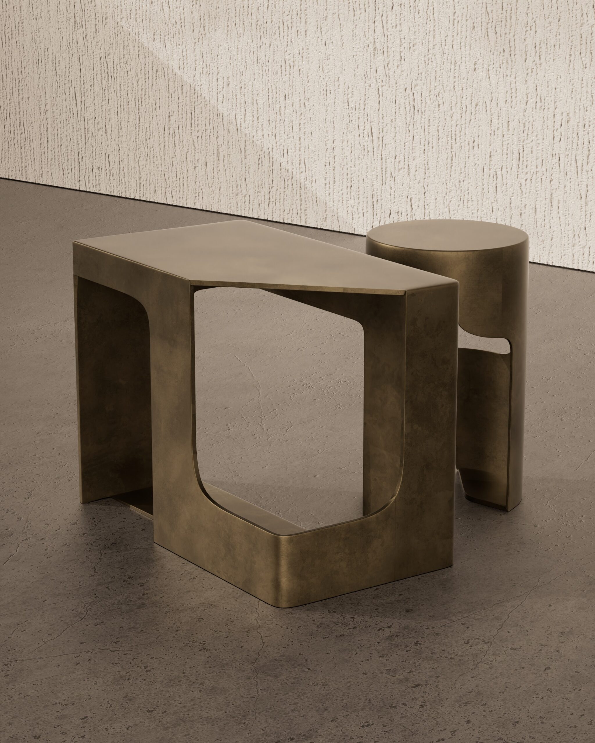 The HOLLOW BLUR side table is an exploration of subtractive geometry and industrial patina. Part of our Design Studio Collection, this set is composed of two distinct volumes that interact through their shared architectural language. The taller element is a clean cylindrical stool, while the primary table features a faceted, irregular footprint. Both pieces are defined by large, radiused rectangular cutouts that remove significant mass from their centers, creating a “hollow” effect that emphasizes the thinness of the metallic walls. Finished entirely in a rich aged bronze, the surfaces display a complex, mottled patina that softens the rigid lines and captures light across the flat planes and curved edges. The HOLLOW BLUR functions as a modular sculptural ensemble, offering a sophisticated balance of solid volume and negative space for contemporary lounge or gallery environments.