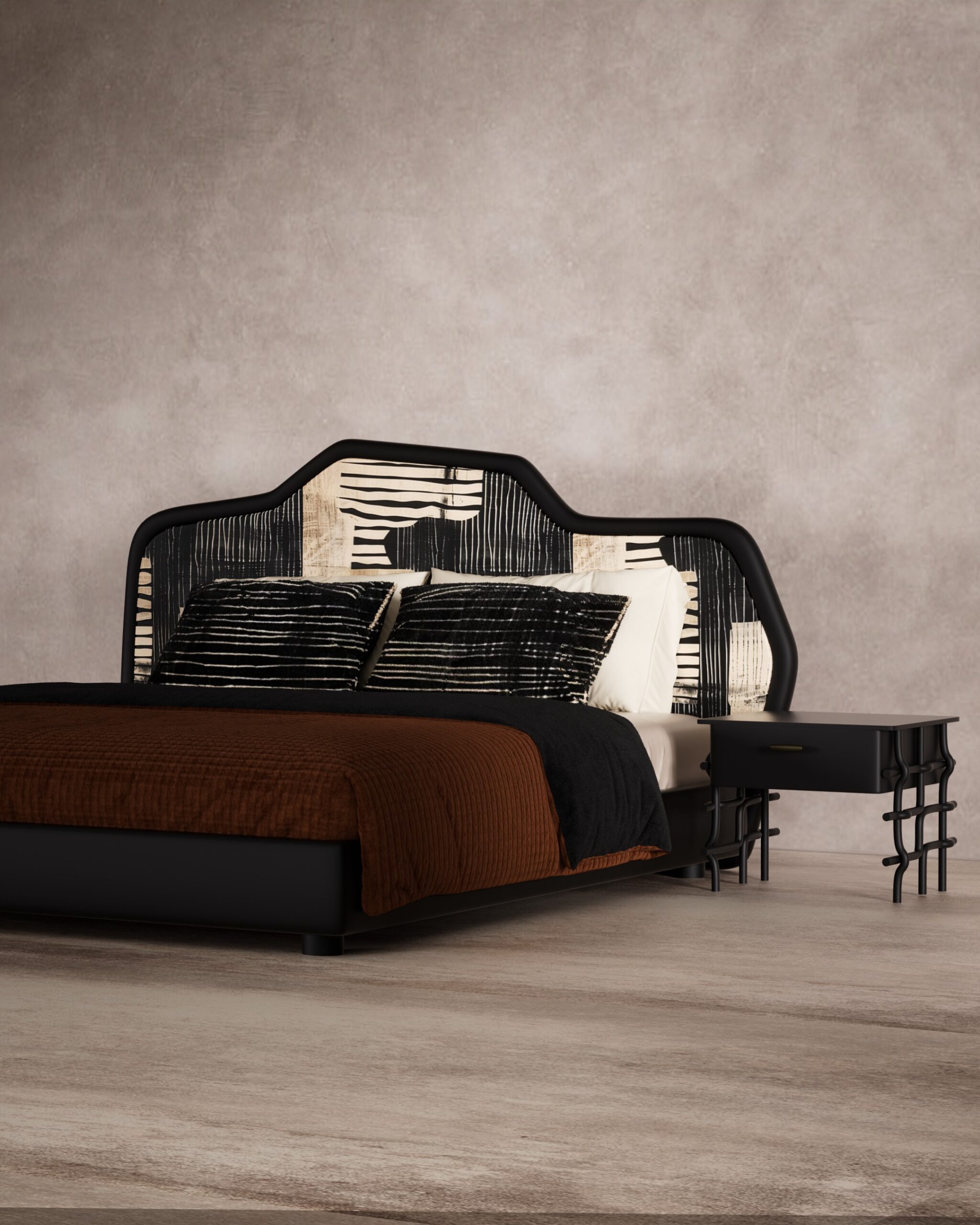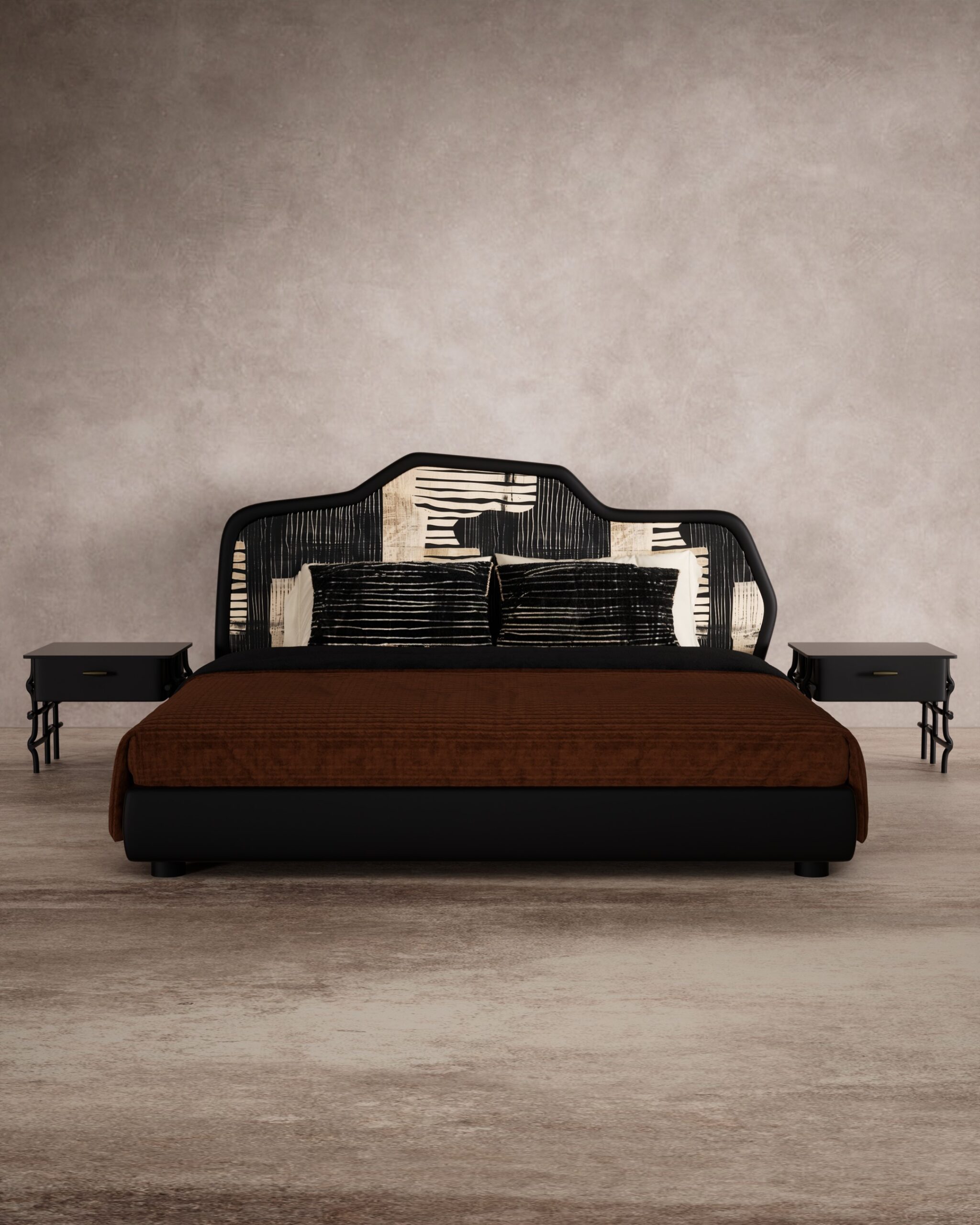The INK & OAK bed is a bold, artistic statement that merges graphic modernism with organic forms. Its focal point is the dramatic, undulating headboard framed in matte black, upholstered in a striking black and cream fabric featuring an abstract, ink-brush style pattern. This expressive backdrop is paired with matching matte black nightstands that float on unique, sculptural legs resembling wavy ironwork, finished with sleek brass drawer pulls for a touch of refined contrast.