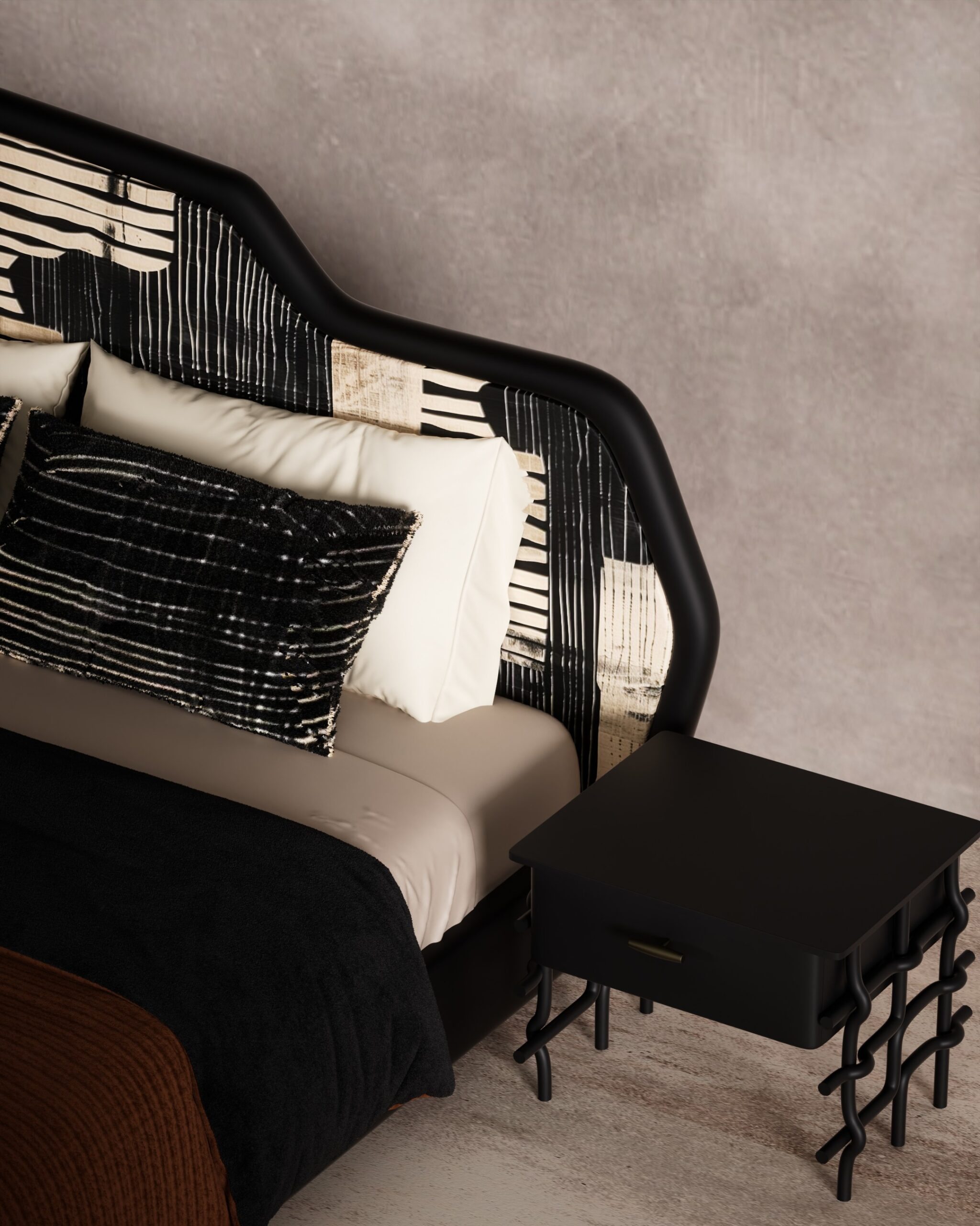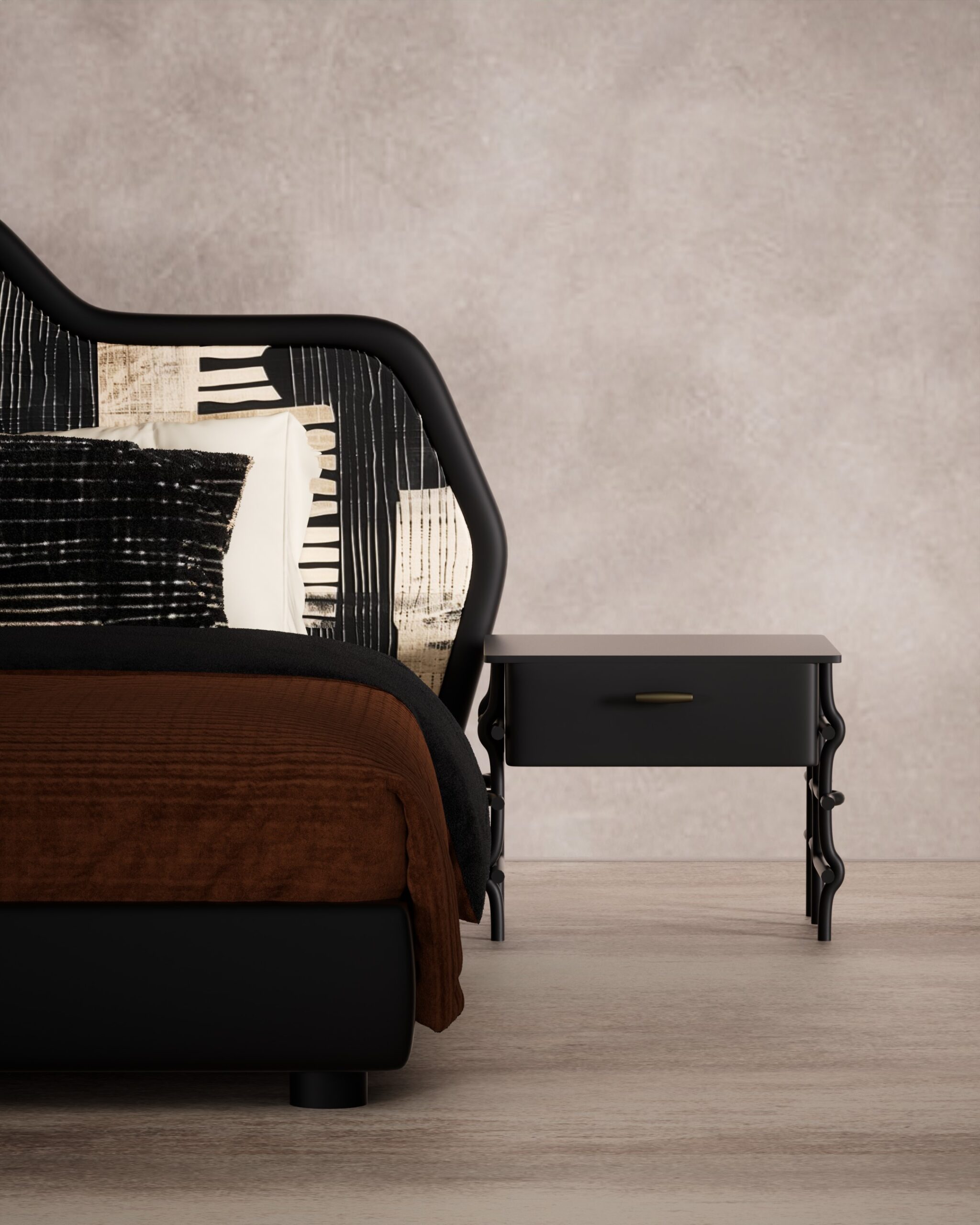 Asymmetric undulating headboard silhouette, sculptural “squiggle” leg nightstands, brass drawer accents