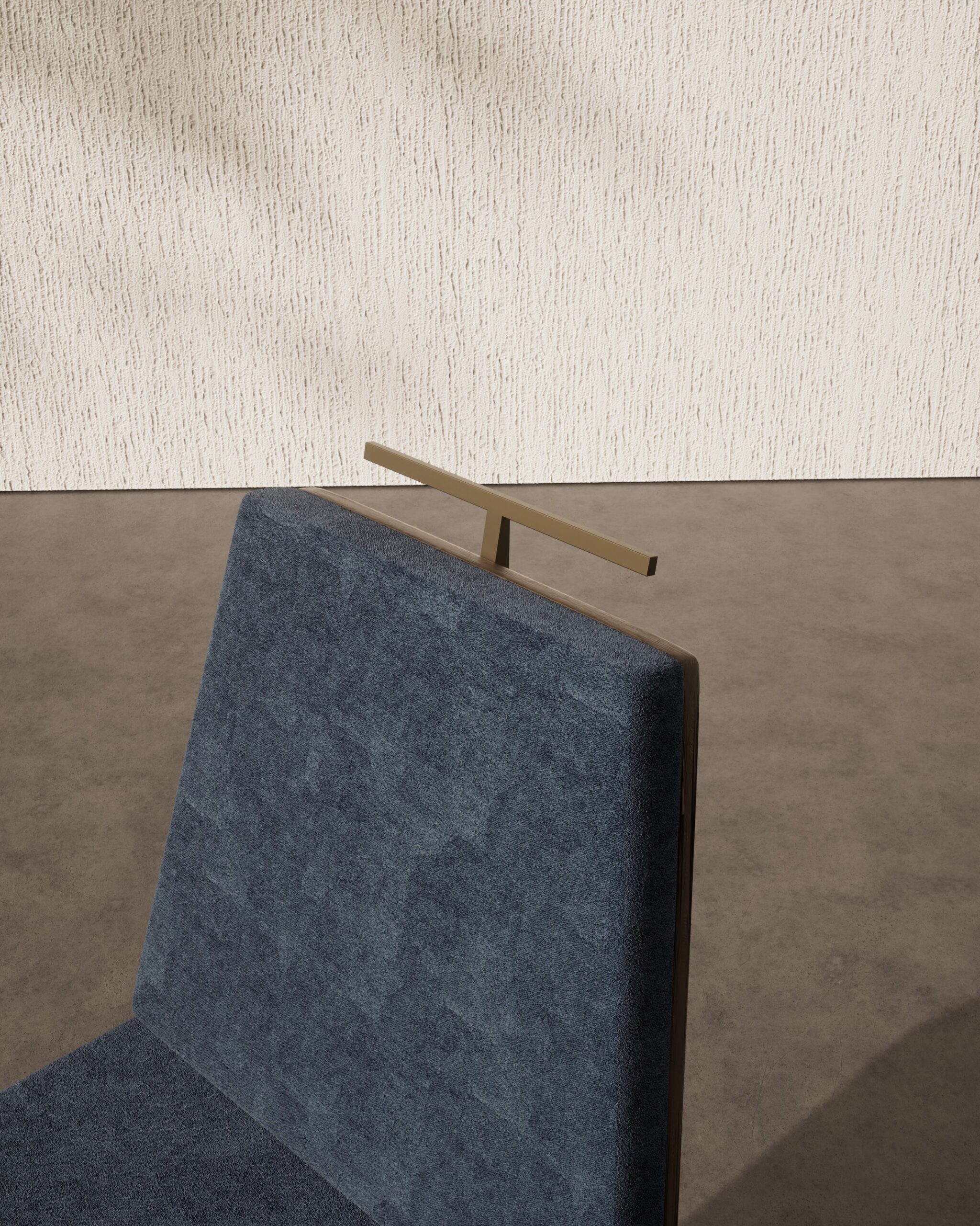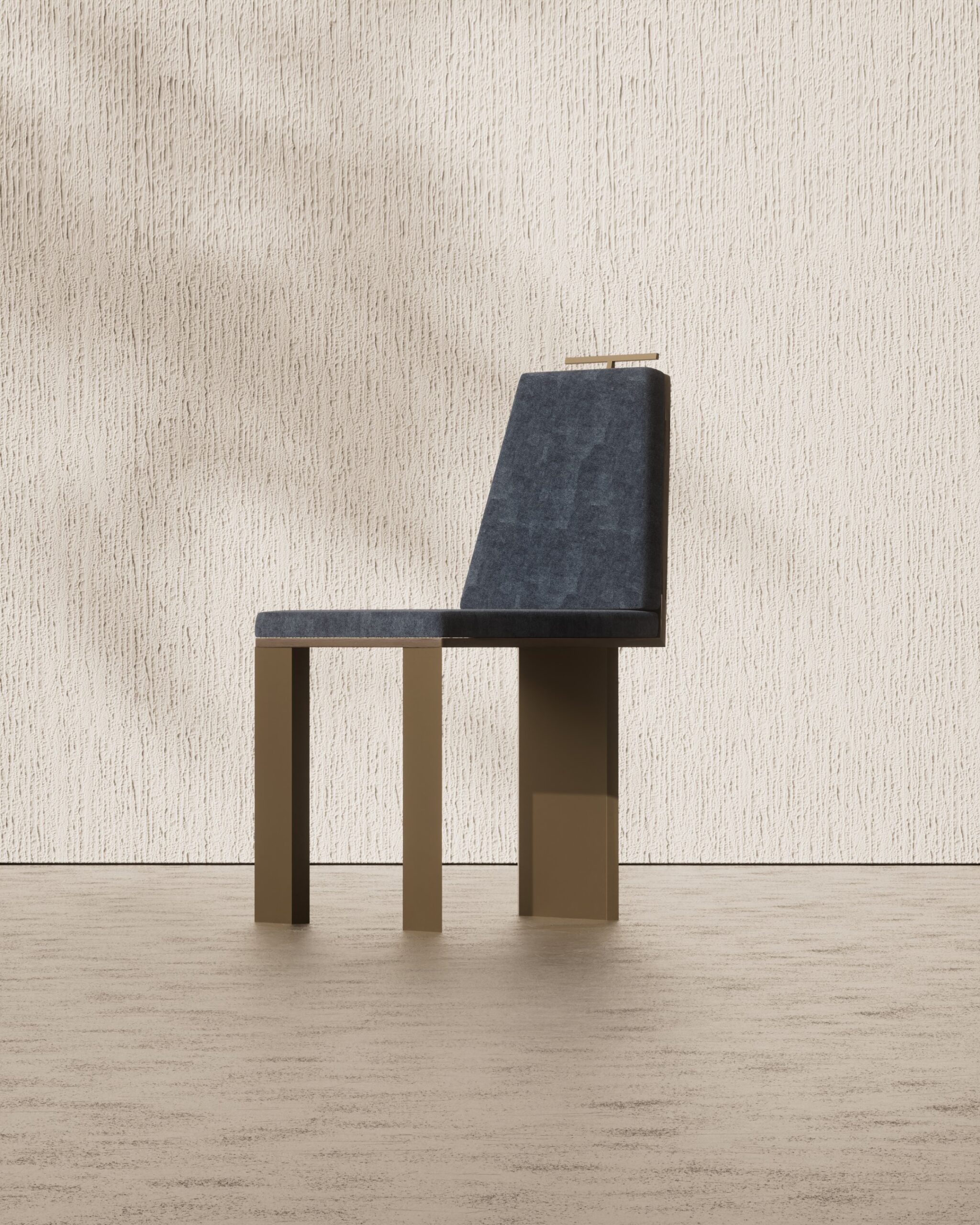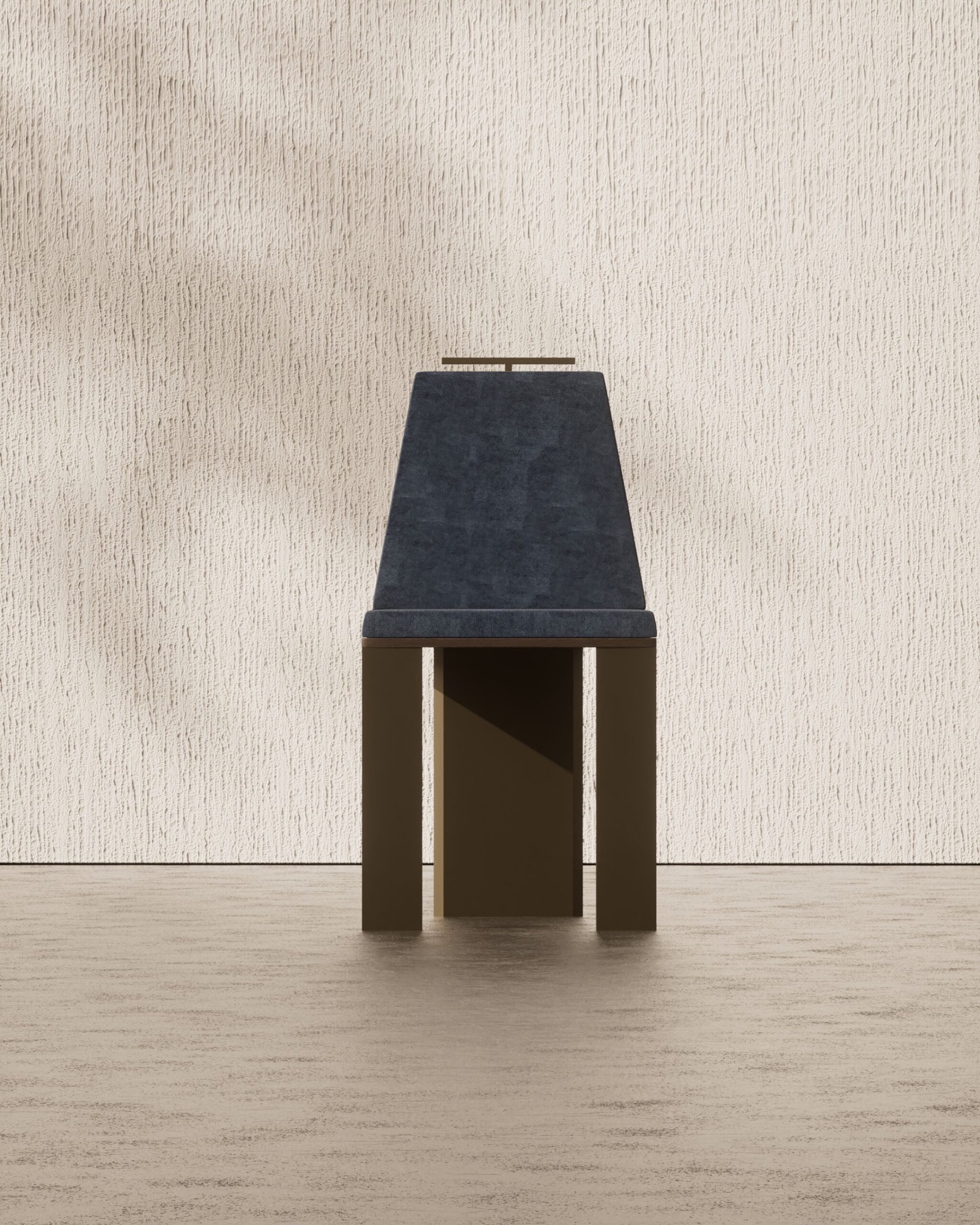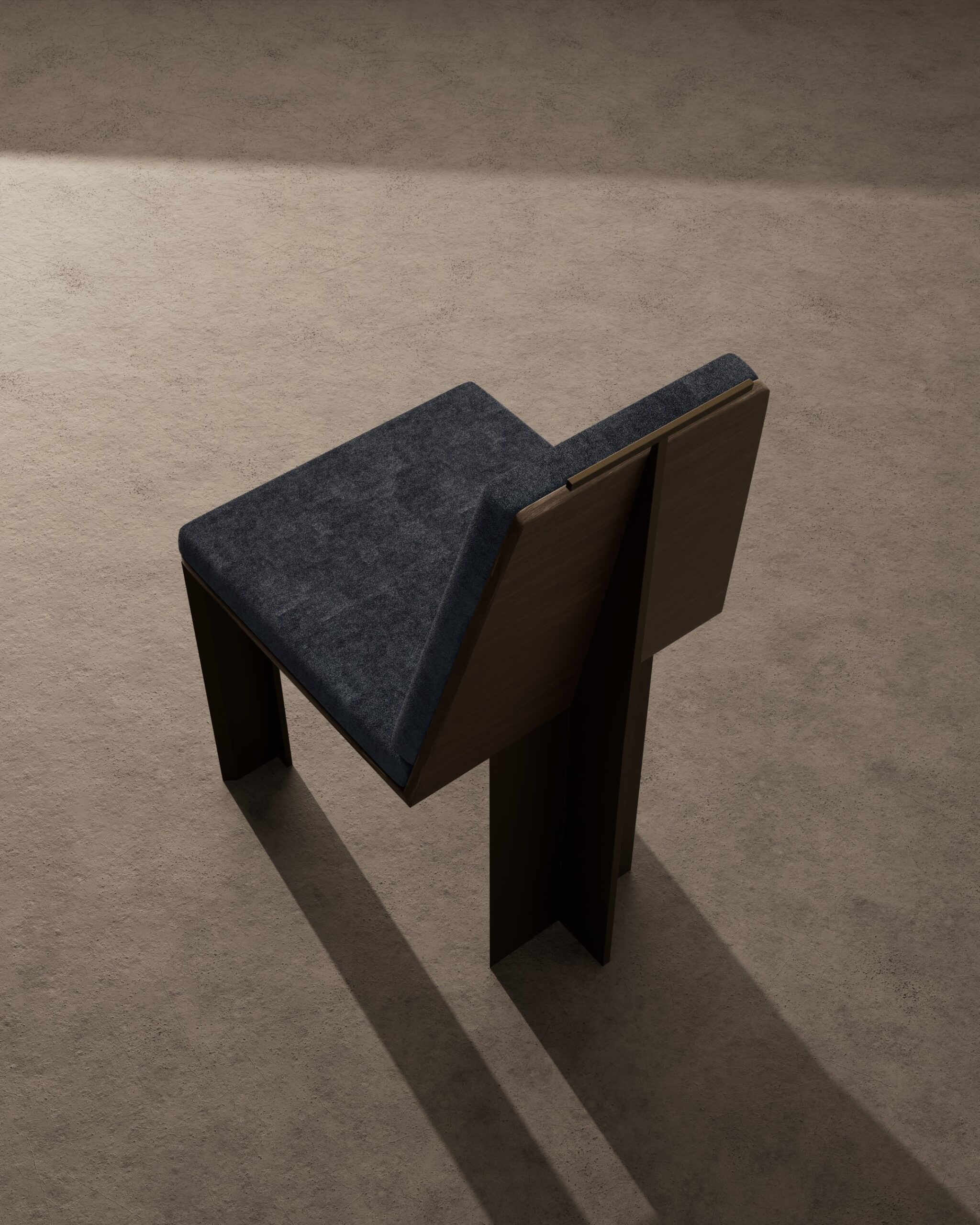 The IYRA dining chair is a study in architectural precision and ergonomic elegance. Part of our Design Studio Collection, it features a distinctive tapered backrest upholstered in a deep midnight blue velvet that provides a rich, tactile contrast to the structural frame. The chair is defined by its signature antique bronze T-bar handle at the top, offering a functional jewel-like accent. Supported by an interlocking dark walnut base with a unique cross-planar silhouette, the IYRA balances sharp geometric lines with a refined, comfortable seat.