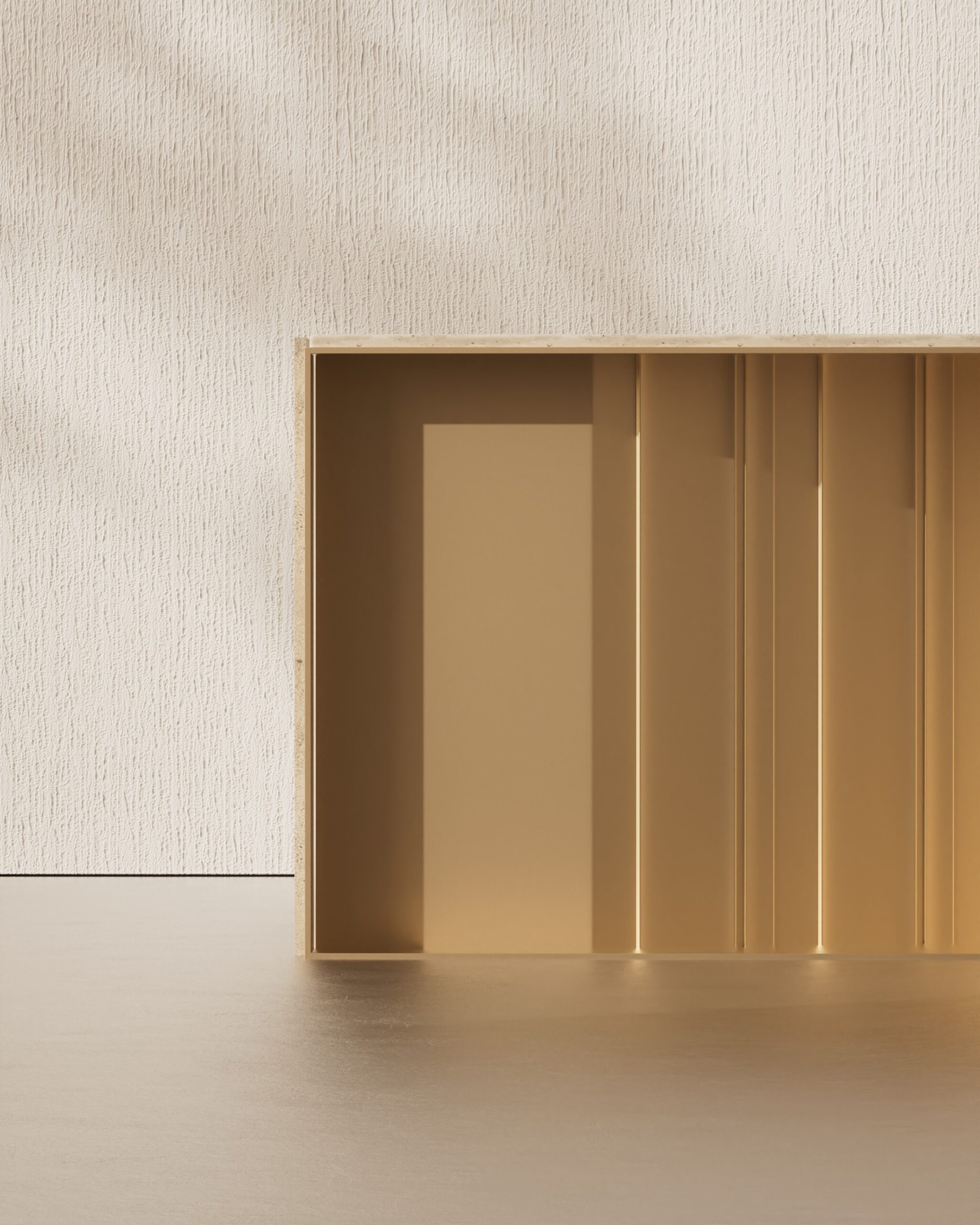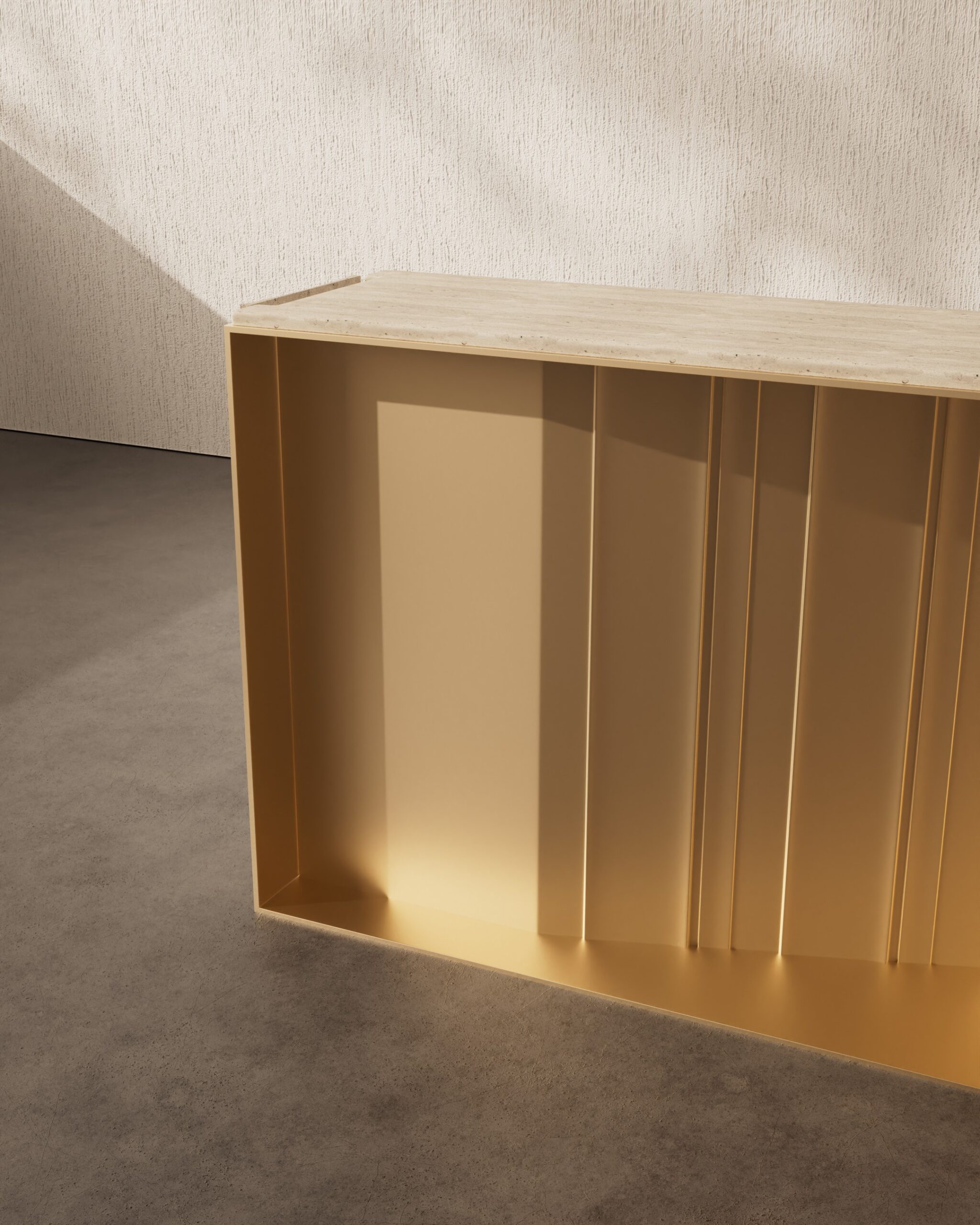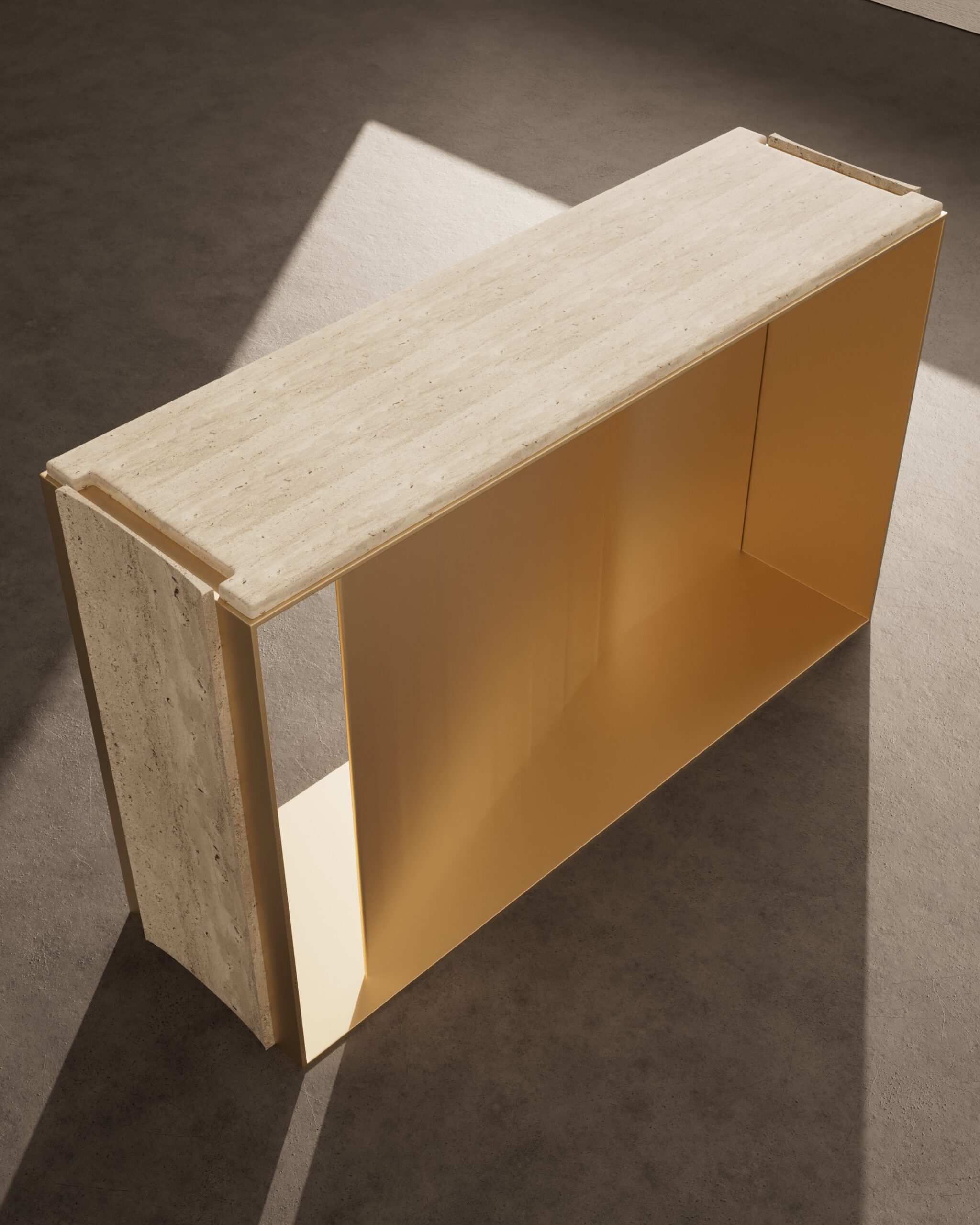 The KINETIC console is an exploration of asymmetrical balance and rhythmic stratification. Part of our Design Studio Collection, the piece is defined by its primary surface of cream travertine, which displays a characteristic linear porous grain and transitions into a singular vertical support at one end. The opposite end remains open, creating a structural “window” that exposes a series of matte champagne metallic panels. These internal planes feature varying vertical depths and integrated lighting channels, creating a dynamic interplay of shadow and metallic reflection. The KINETIC balances the permanent, tectonic weight of natural stone with a sense of modern, architectural movement, offering a sophisticated statement piece for contemporary entryways and living areas.