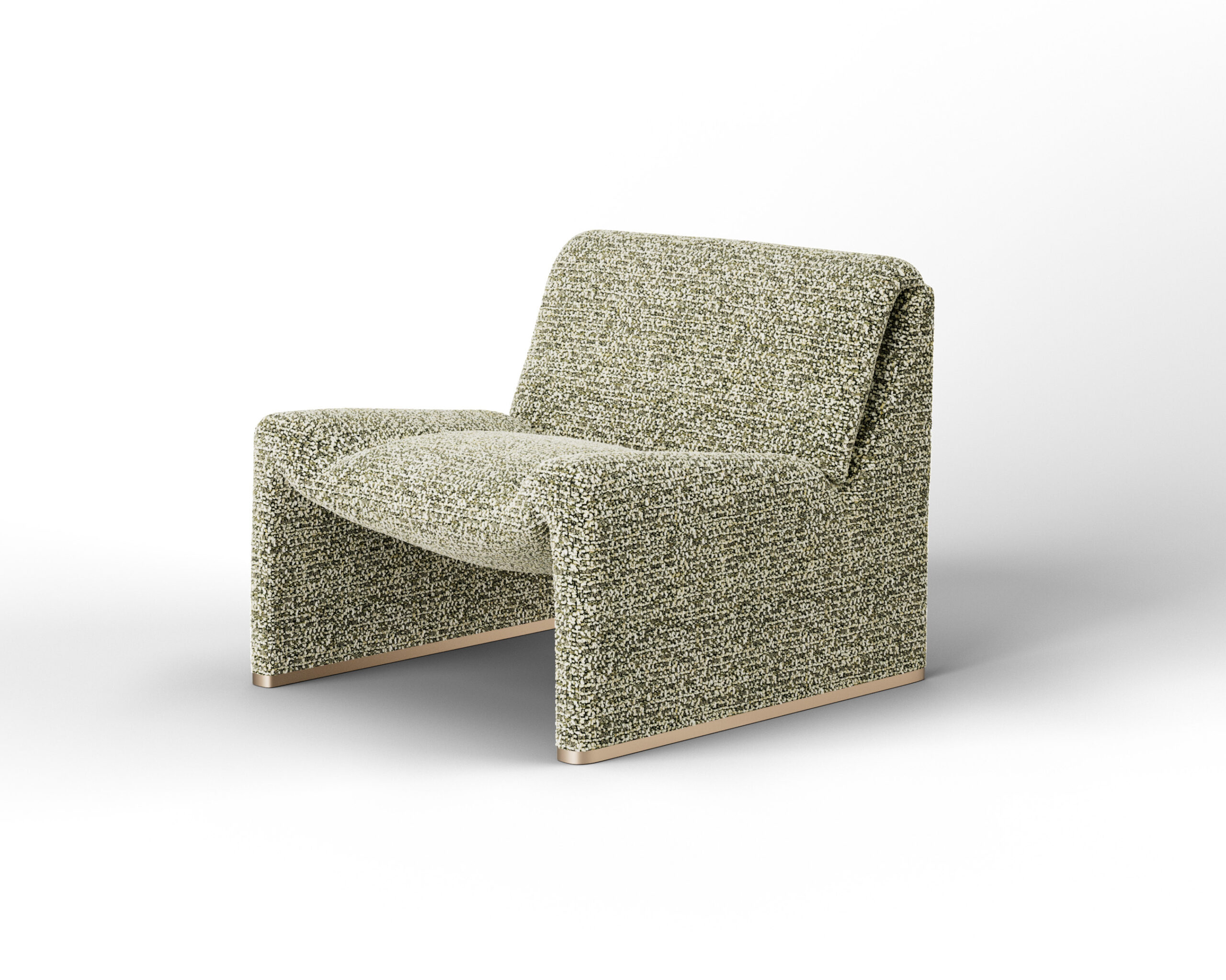 The visual narrative is driven by the contrast between the rigid, heavy frame and the plush interior volumes. Clad in a premium warm parchment bouclé, the seat and integrated backrest offer a soft, multi-tonal texture that is deeply recessed within the metallic shell. This design creates a sense of “suspended” comfort, where the soft upholstery is protected by the architectural “U” of the frame. The KINO balances its bold material weight with clean, modernist lines, serving as a commanding focal point for high-end residential lounges and avant-garde creative spaces.