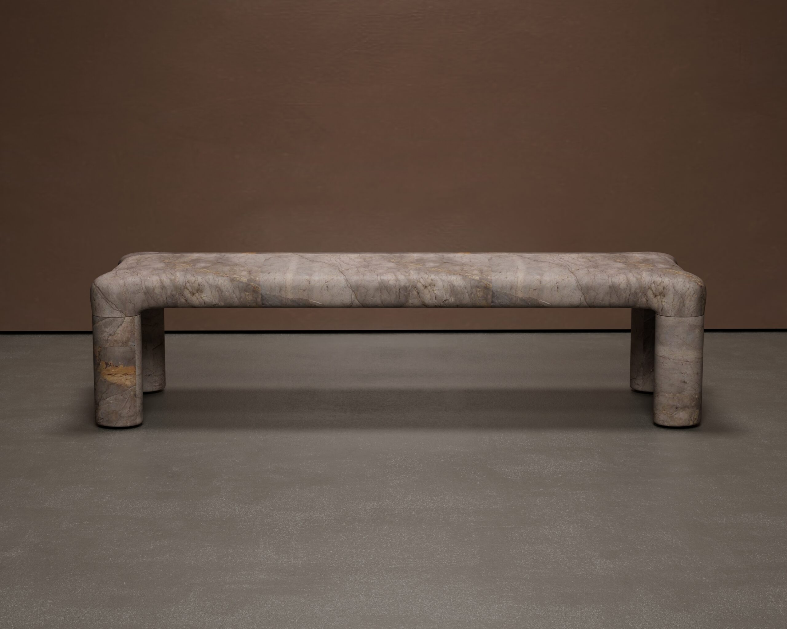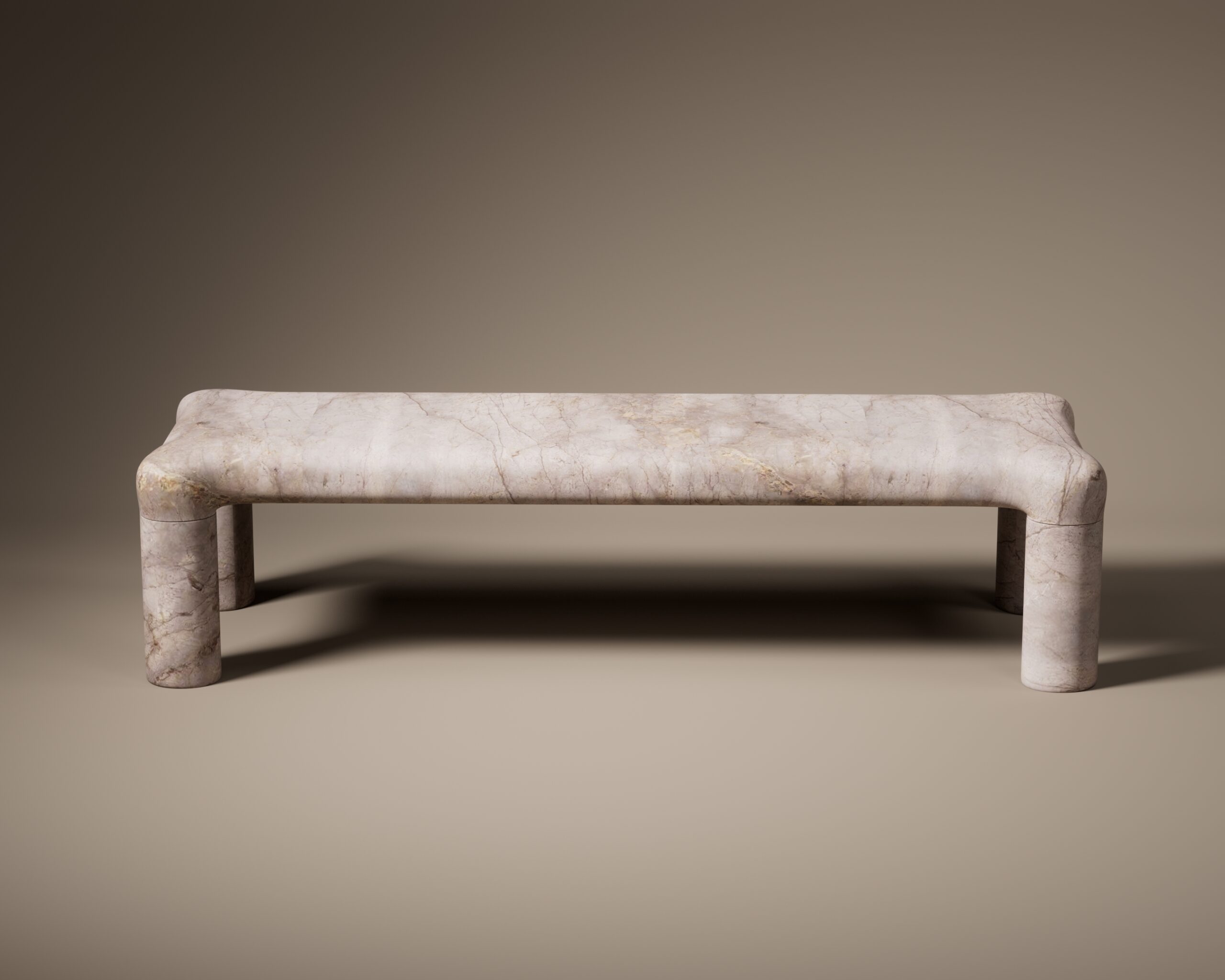 The KONE bench is a sculptural statement of grounded minimalism, celebrating the raw beauty of natural stone. Its design is defined by a thick, rounded profile where the horizontal seat curves gently downward to form stout, cylindrical legs, creating a continuous, fluid silhouette. Constructed from solid stone in warm earthen tones of beige, cream, and tan, the bench features intricate natural veining that acts as its only ornamentation. The visible joinery lines add an architectural honesty to the piece, transforming a simple functional object into a substantial work of geological art.