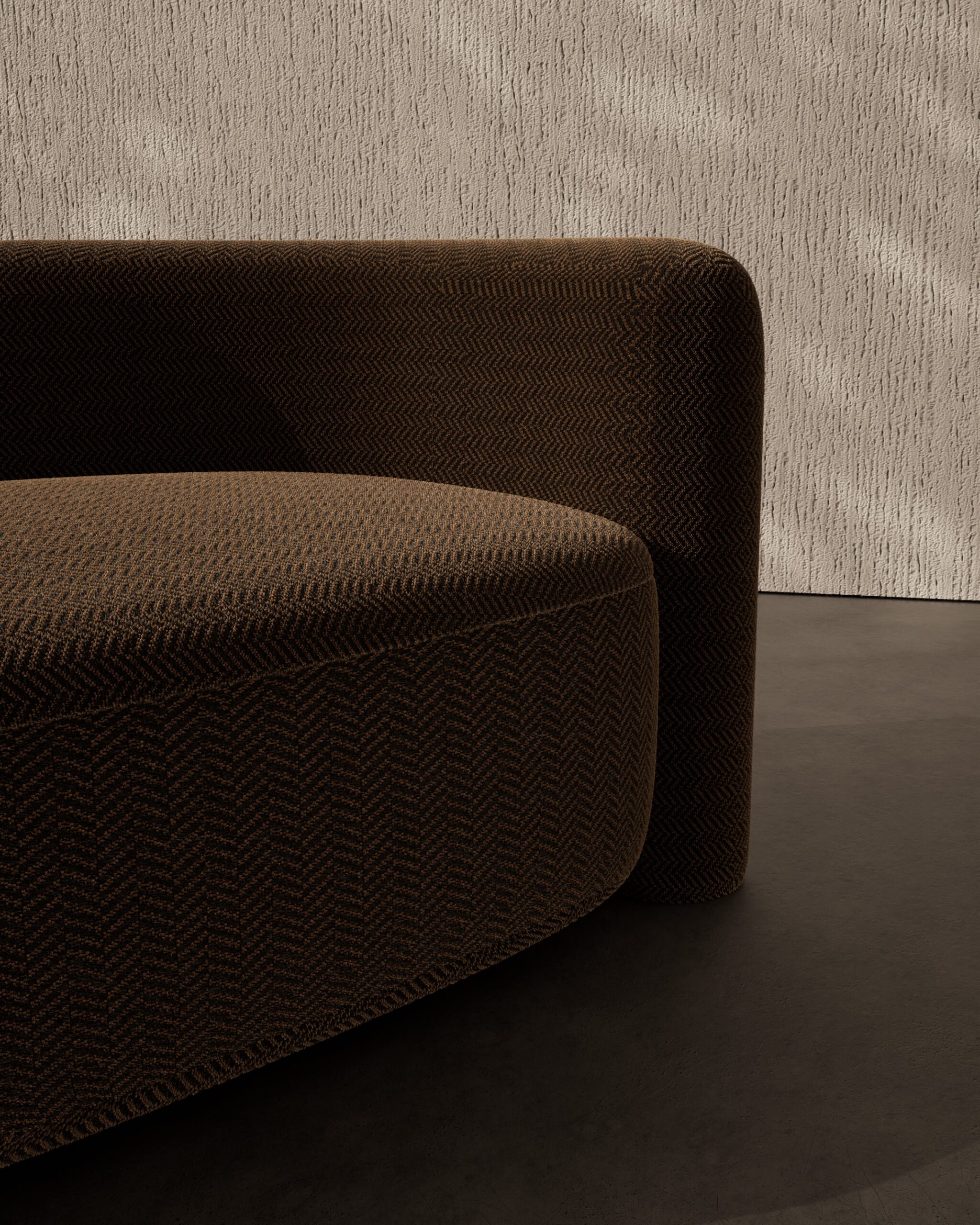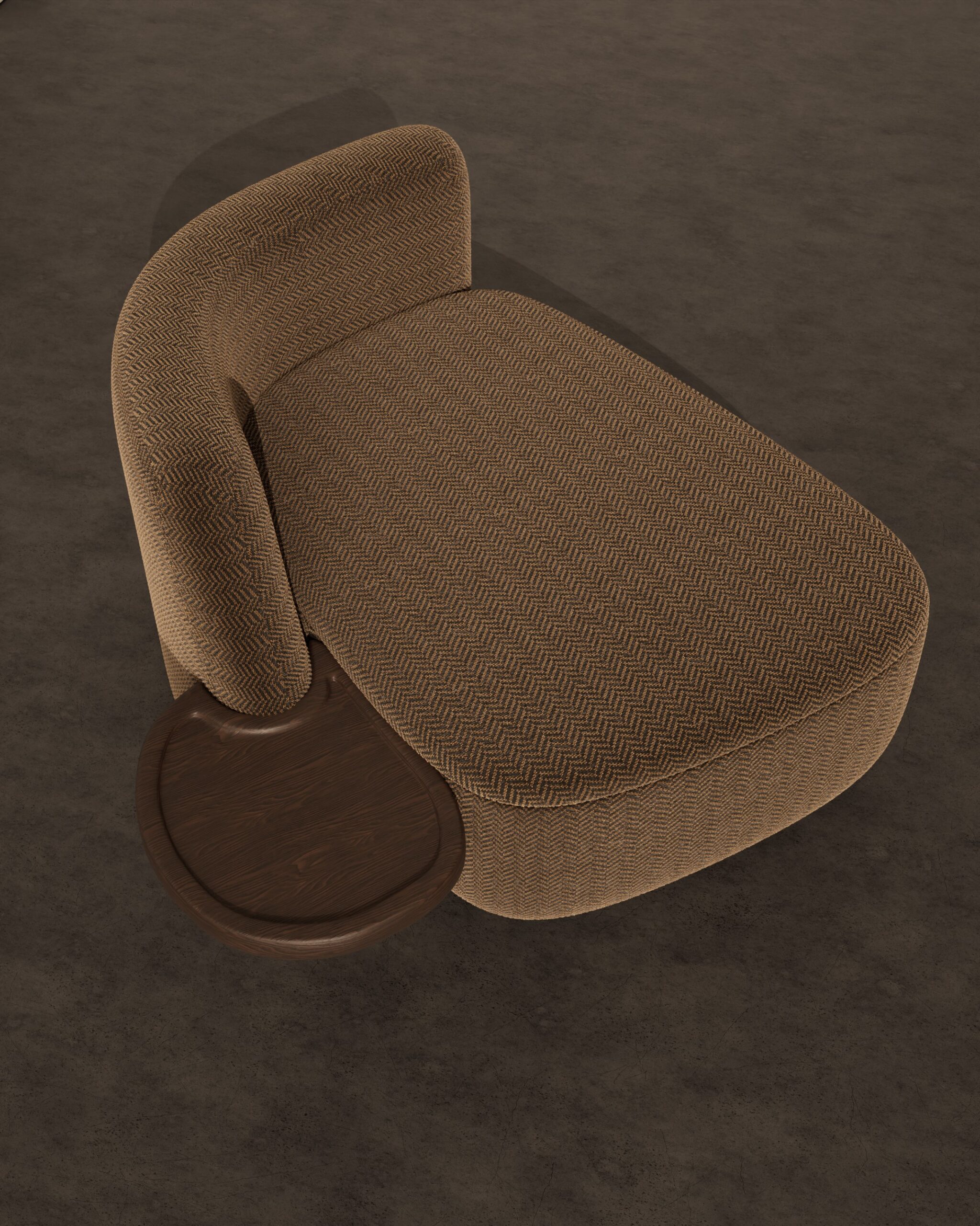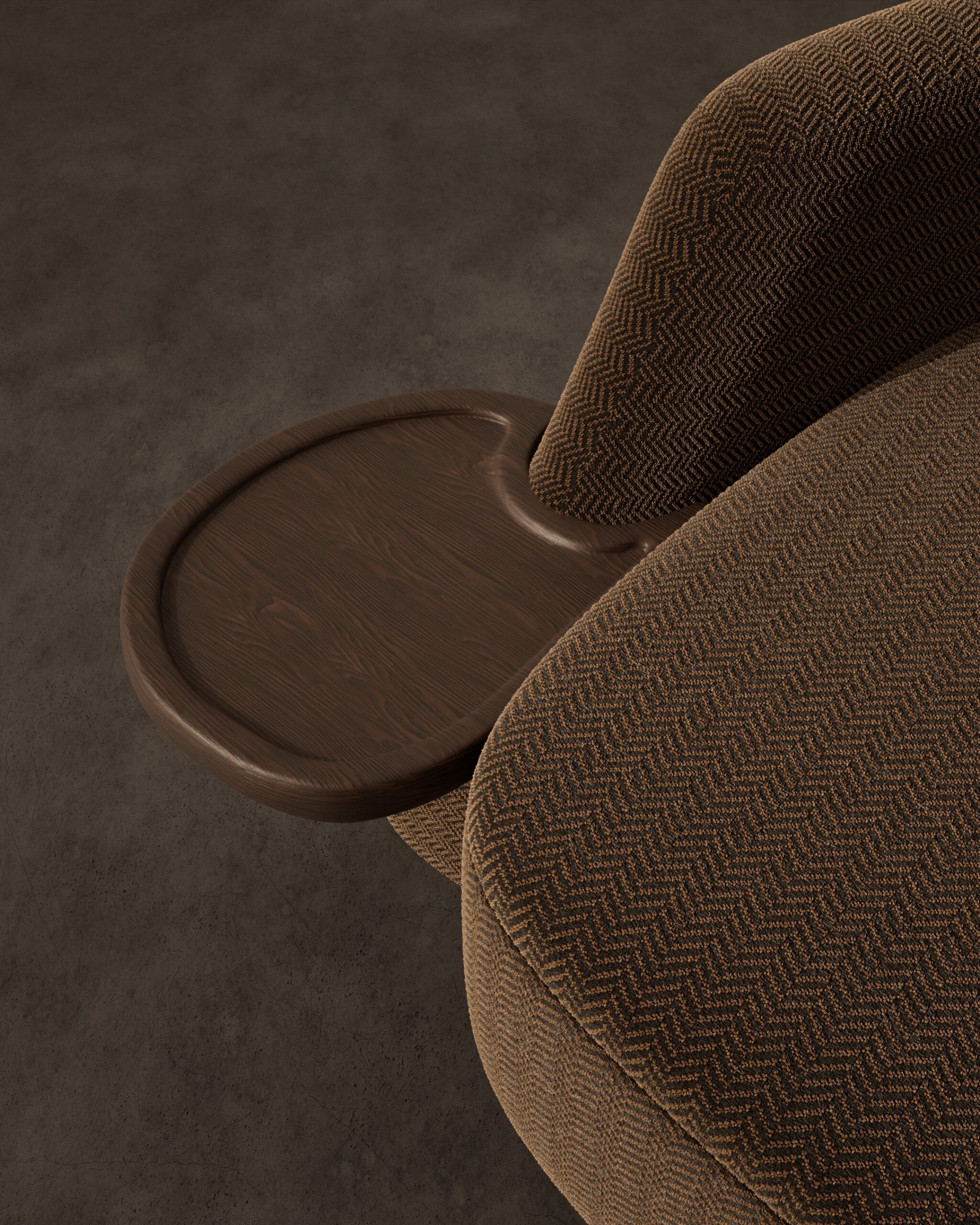The KULTURE armchair is a fusion of sculptural form and smart utility, designed for the dynamic modern interior. Its silhouette is defined by a low, asymmetrical curve that feels more like a landscape than furniture, featuring a wide, open seat and a partial backrest that wraps protectively around one side. The piece is upholstered in a striking chocolate brown fabric with a prominent herringbone weave, creating a visual rhythm that draws the eye. Its standout feature is the integrated dark wood side table—a floating oval valet tray with a raised lip—which seamlessly merges furniture with function, making it the ultimate station for a coffee, a book, or a device.