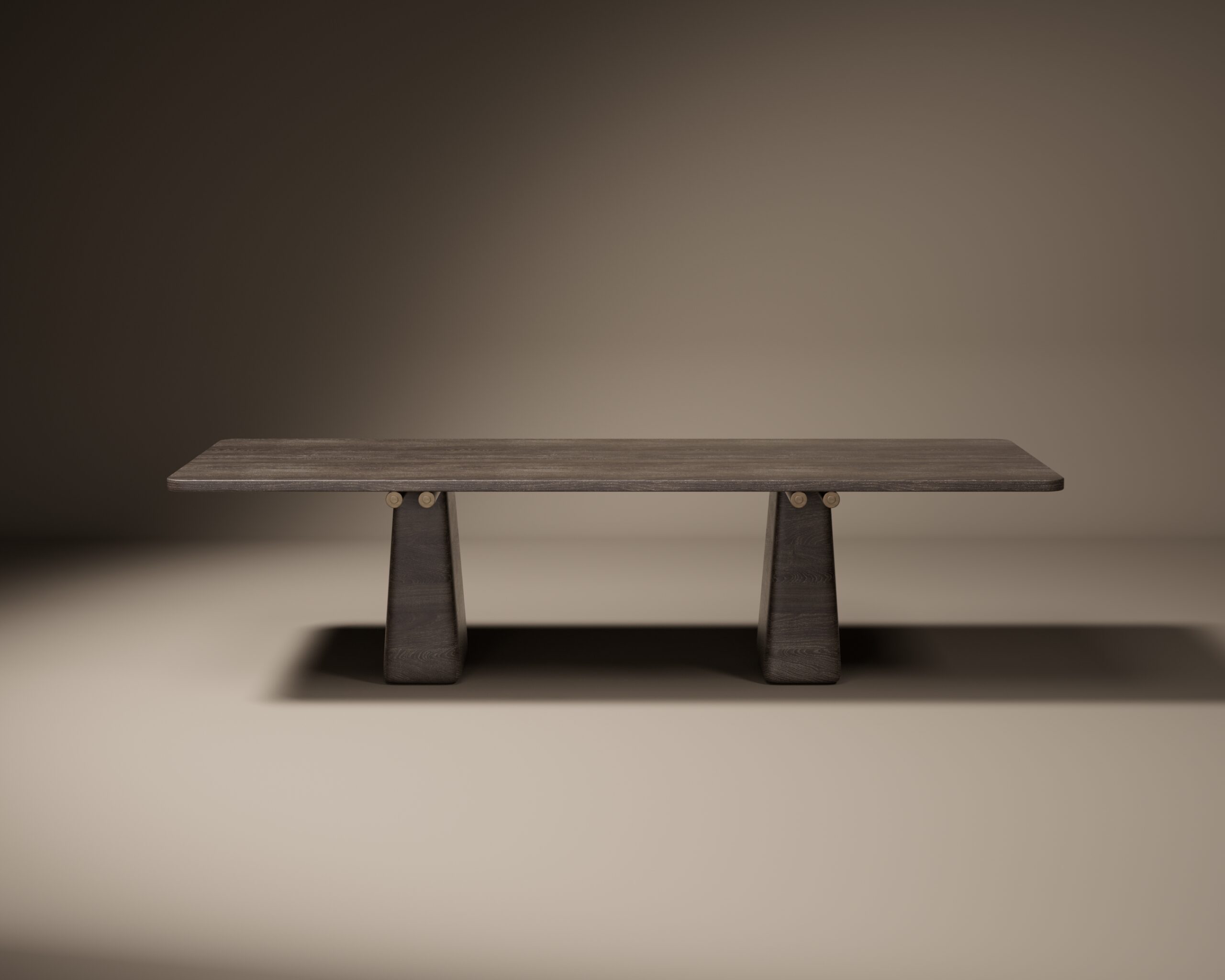 The KYRO dining table is a study in architectural tension and joined volumes. Part of our Design Studio Collection, it features an expansive, razor-thin espresso walnut top supported by two massive, tapered pedestals. The design is defined by its signature antique bronze joinery, where oversized metallic cylinders pierce the upper neck of each base, creating a rhythmic and industrial focal point. This interplay between the heavy, grounded wood forms and the delicate metallic accents gives the piece a sophisticated, monolithic presence.