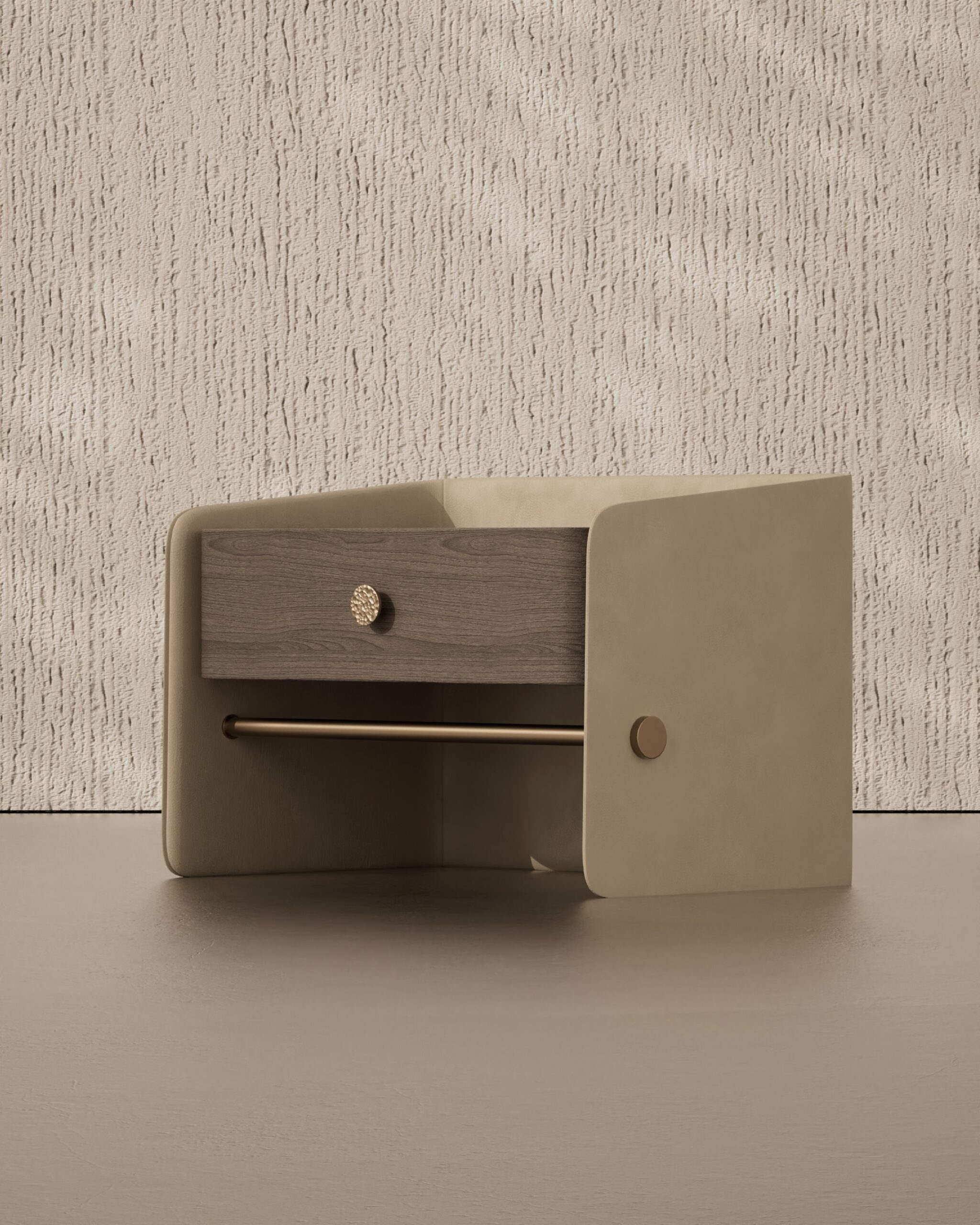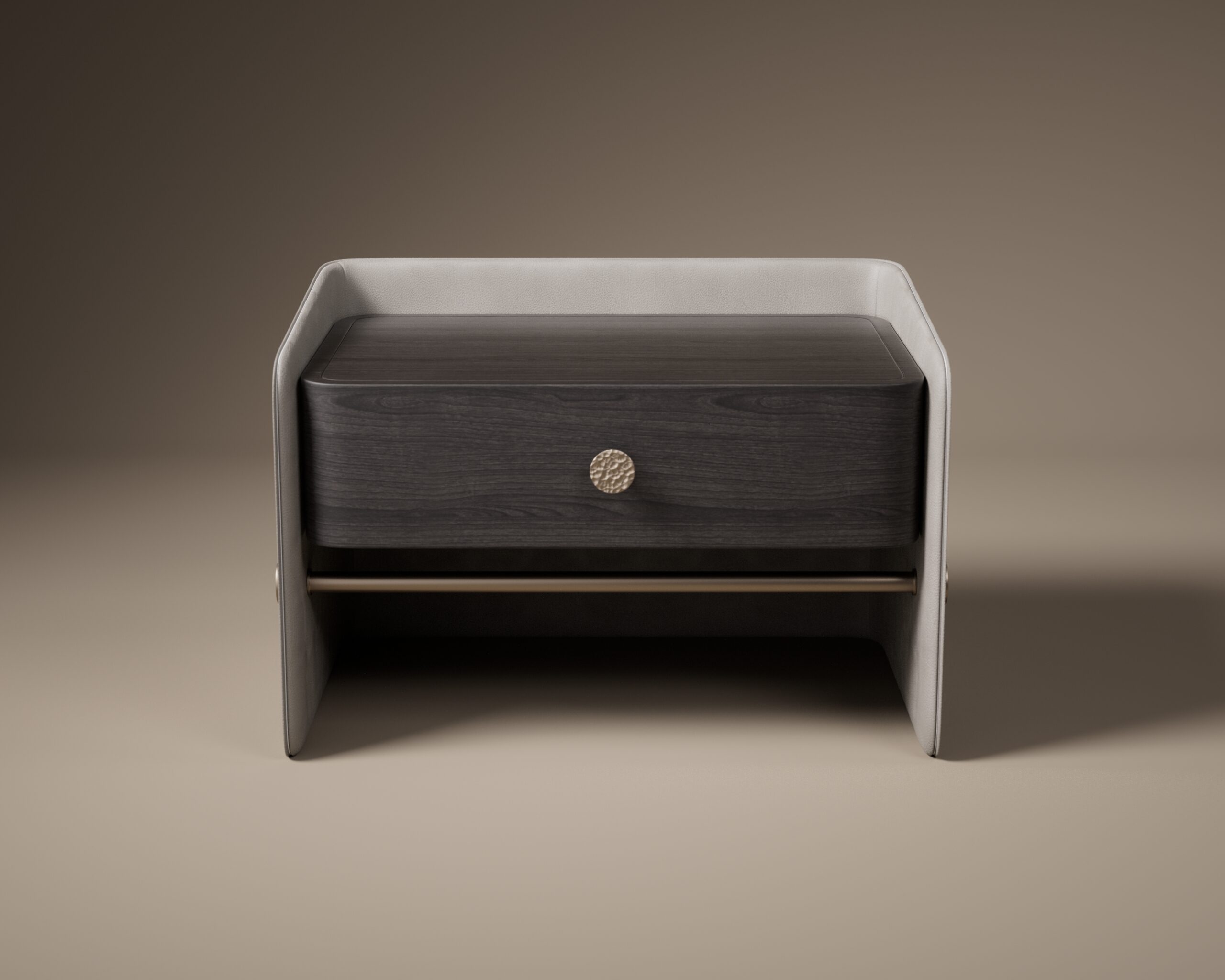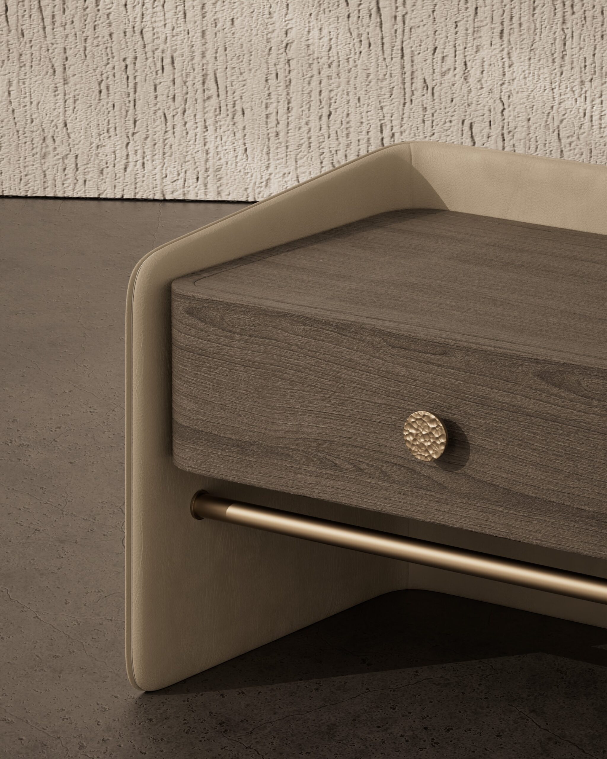 The LATTICE bedside table is a sophisticated exploration of tactile layering and suspended forms. It features a single dark walnut drawer unit nestled within a continuous, sand-colored leather shell that forms both the side panels and a protective back gallery. The design is anchored by a slender brass rail spanning the open base, providing architectural tension and functional utility, while a single hammered brass knob offers a handcrafted, jewel-like focal point.