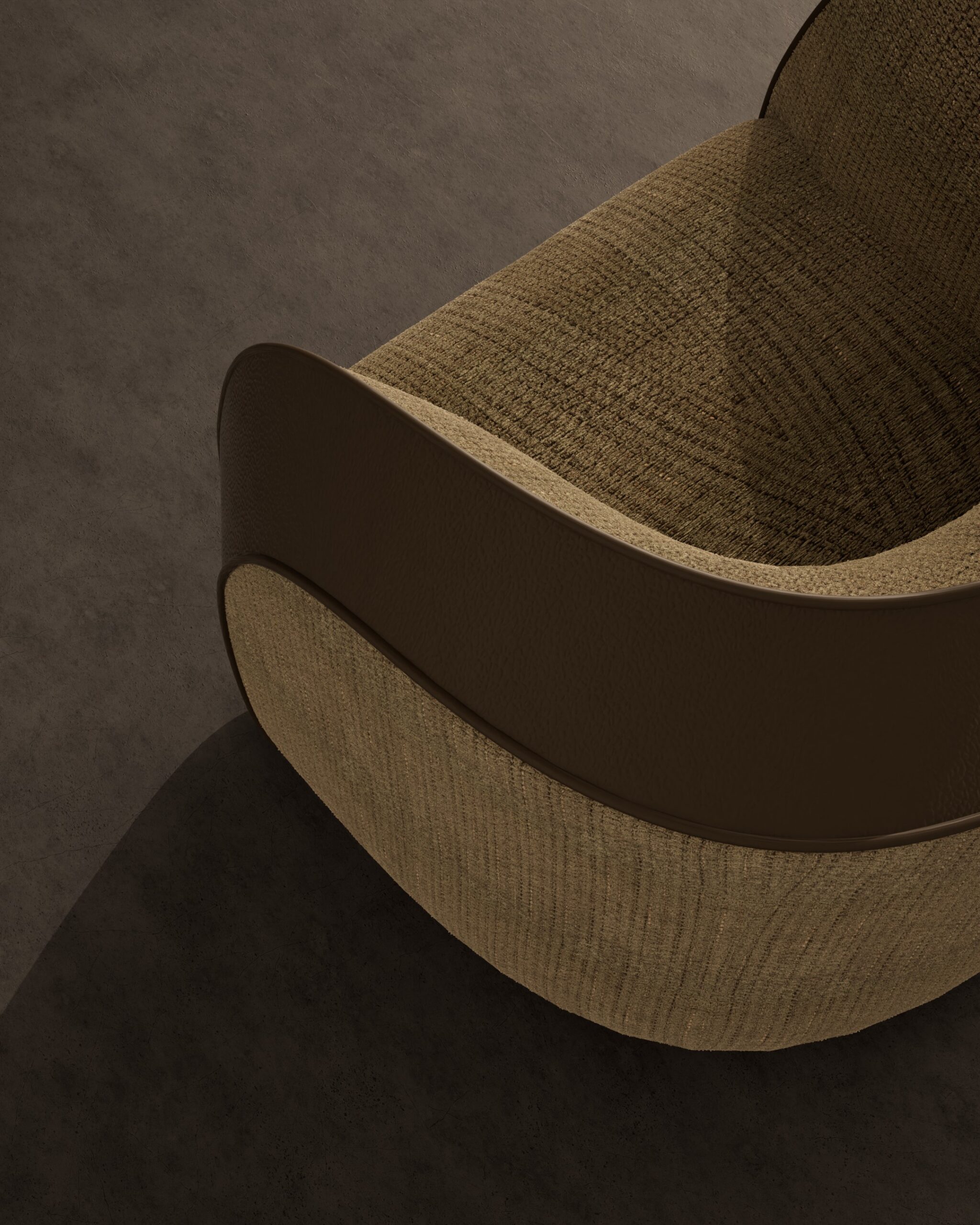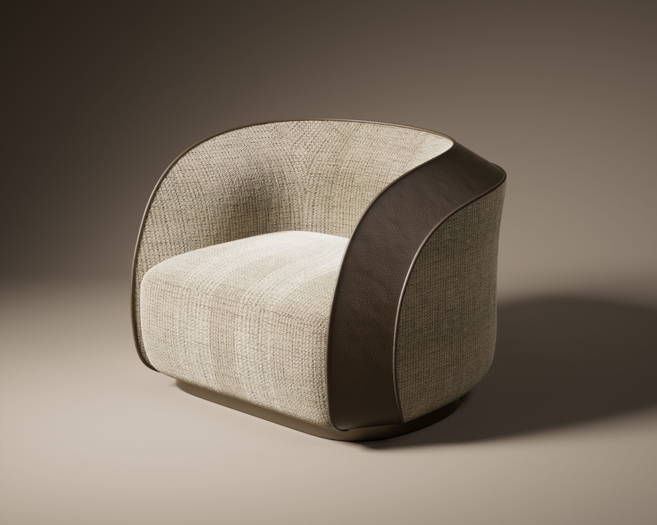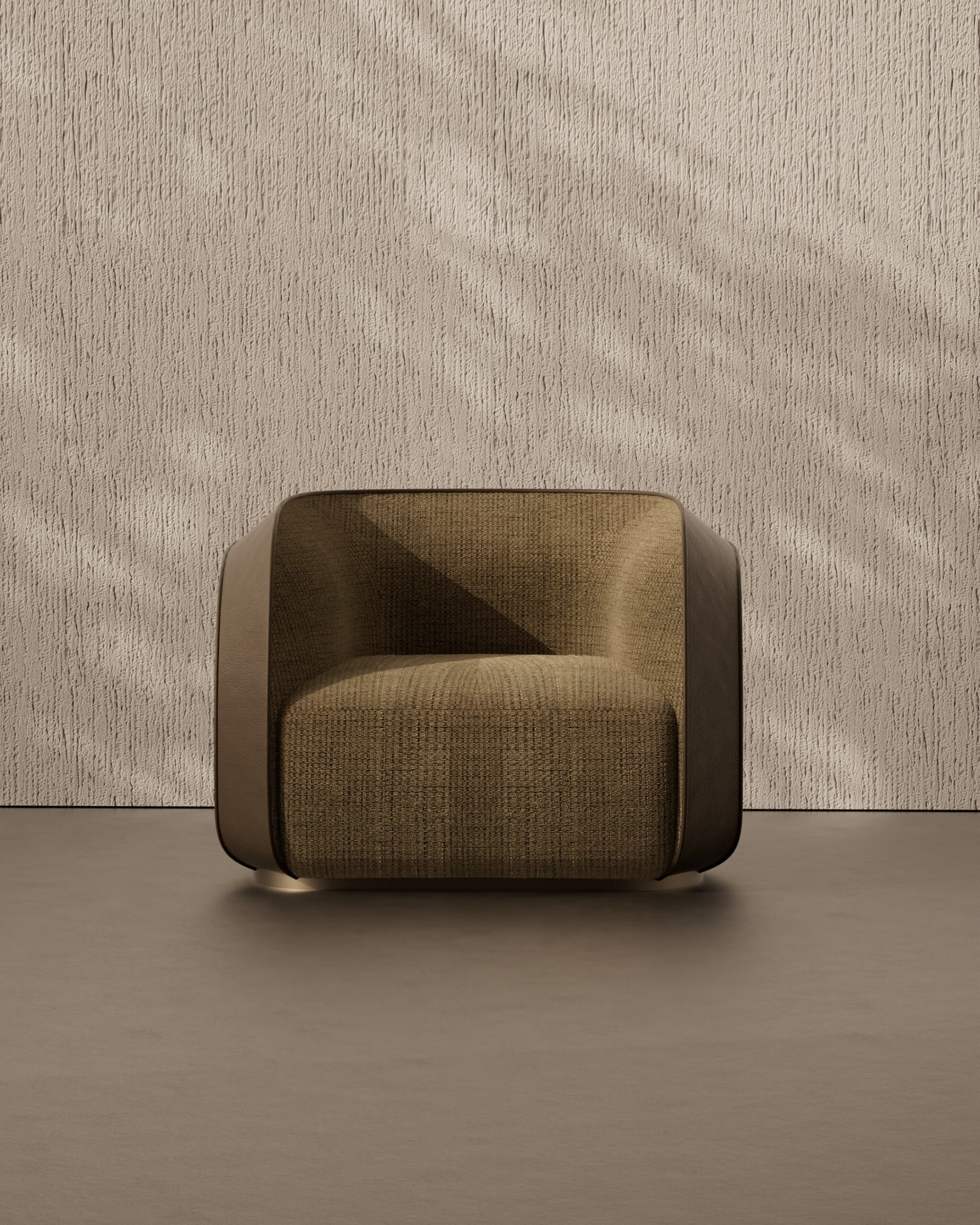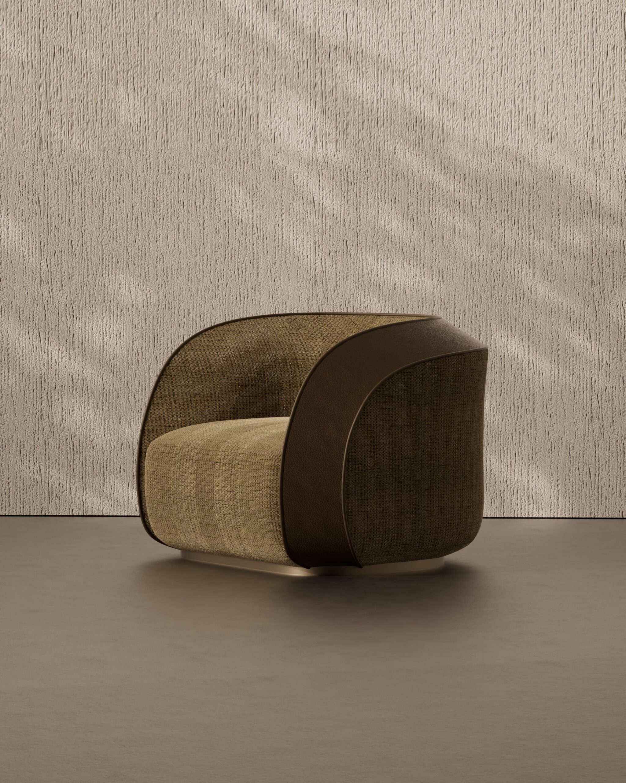 The LIORA armchair is a study in sartorial elegance, defined by its sophisticated dual-material construction. The exterior creates a protective, architectural boundary with a smooth, pebble-grained leather shell that wraps seamlessly around the back and arms. This structural exterior cradles a contrasting interior upholstered in a plush, heavy-woven fabric in warm golden-beige tones, creating a tactile “cocoon” effect. Resting on a subtle brushed brass plinth that gives it a floating appearance, the Liora balances the masculine weight of leather with the organic softness of textiles, making it a perfect anchor for a luxurious reading corner.