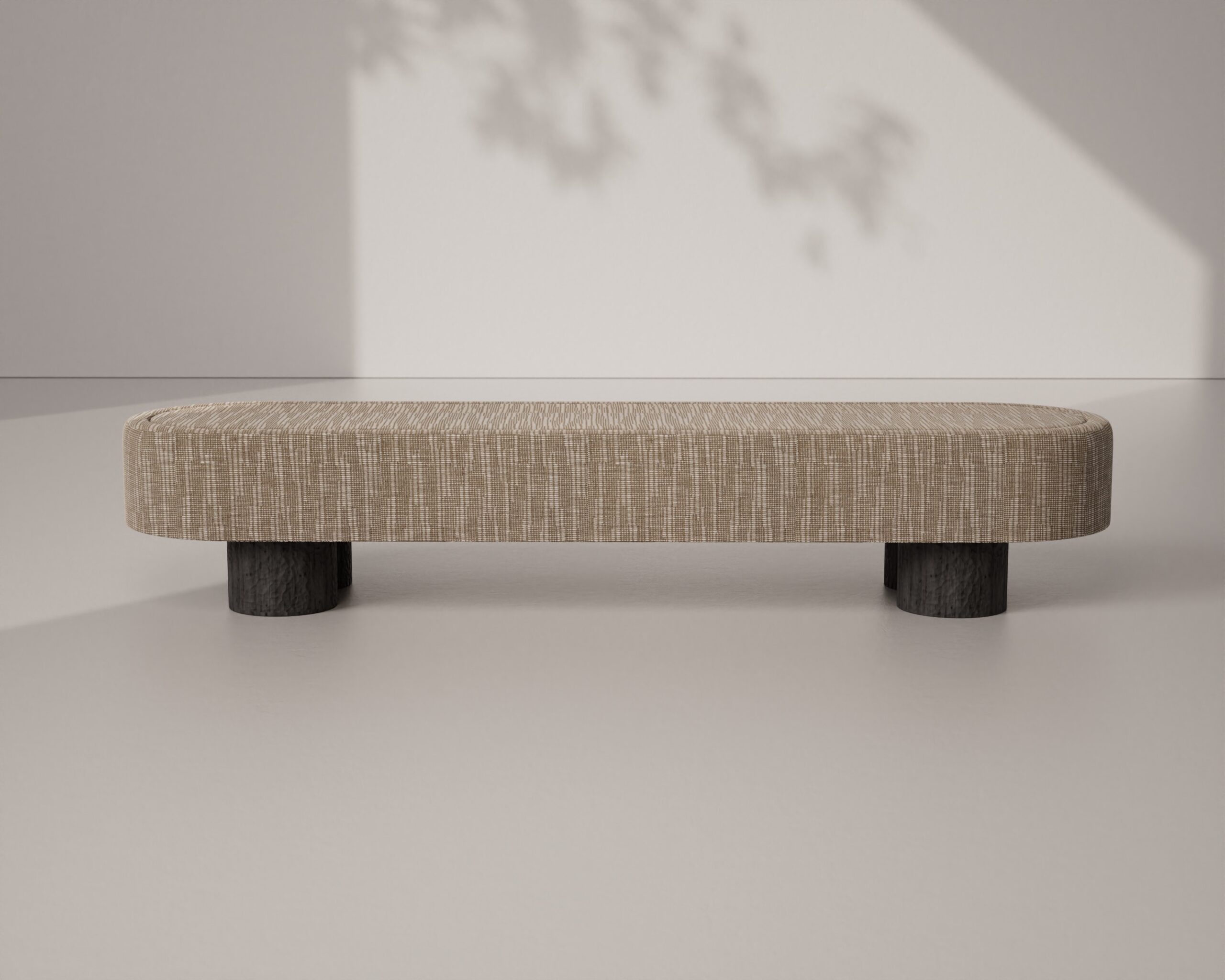 The LOAM bench is a grounding force in any space, characterized by its earthy simplicity and substantial presence. The seat is a long, thick volume with rounded ends, fully upholstered in a tactile beige tweed that suggests natural fibers. This soft, floating form rests upon stout, dark wooden legs—resembling charred logs—that are set deep beneath the seat, creating a shadow gap that enhances the bench’s sculptural, monolithic quality.
