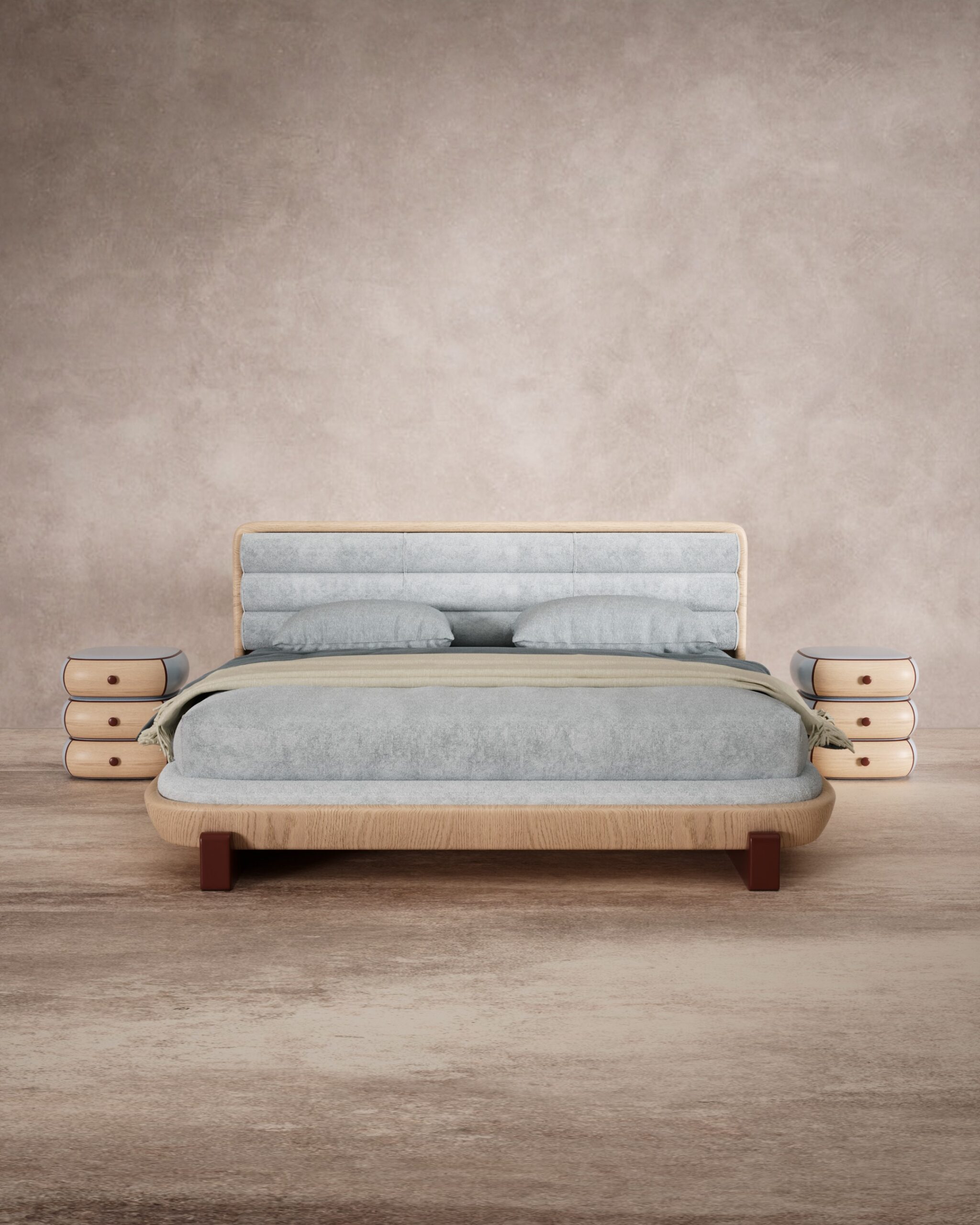 The LULLABY bed brings a sense of playful softness and serenity to the bedroom. Its headboard features wide, horizontal channel tufting upholstered in a soothing light grey fabric, creating a cushioned, cloud-like backrest. The bed frame is defined by a thick, rounded light wood rail that curves gently around the base, resting on contrasting dark reddish-brown block legs. The design is accompanied by charming nightstands composed of stacked, rounded pill-like forms in alternating wood and white finishes, adding a touch of whimsical modernity.