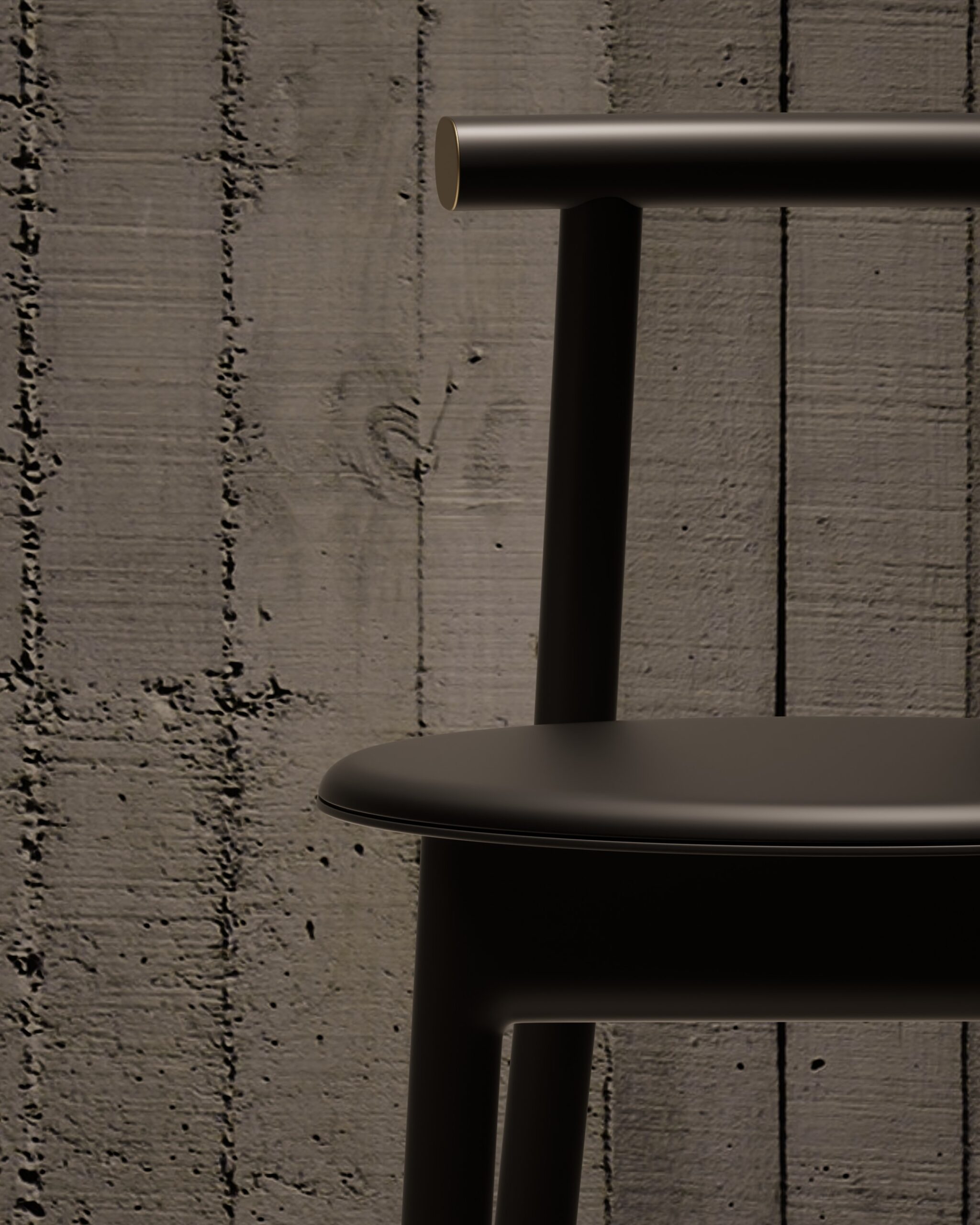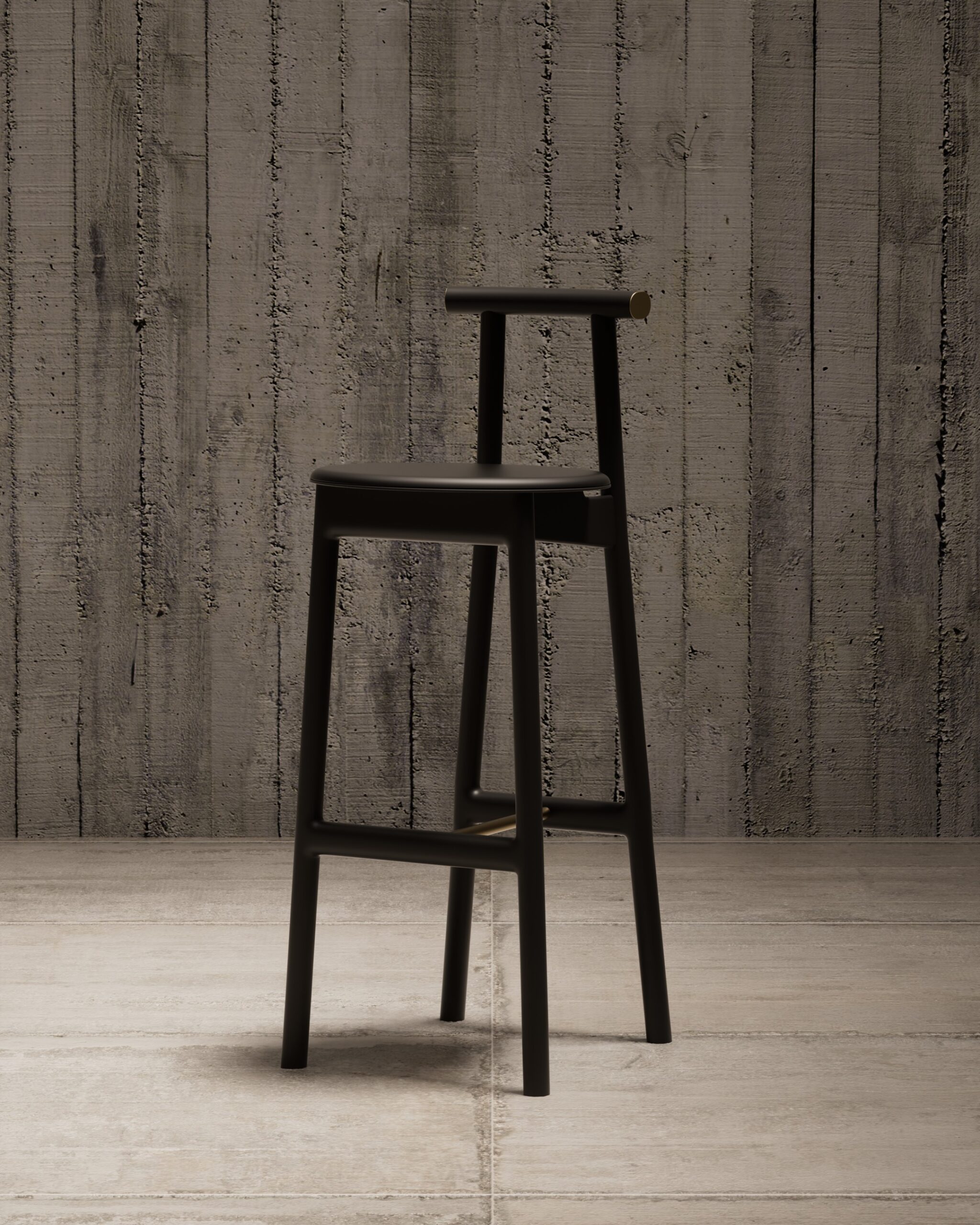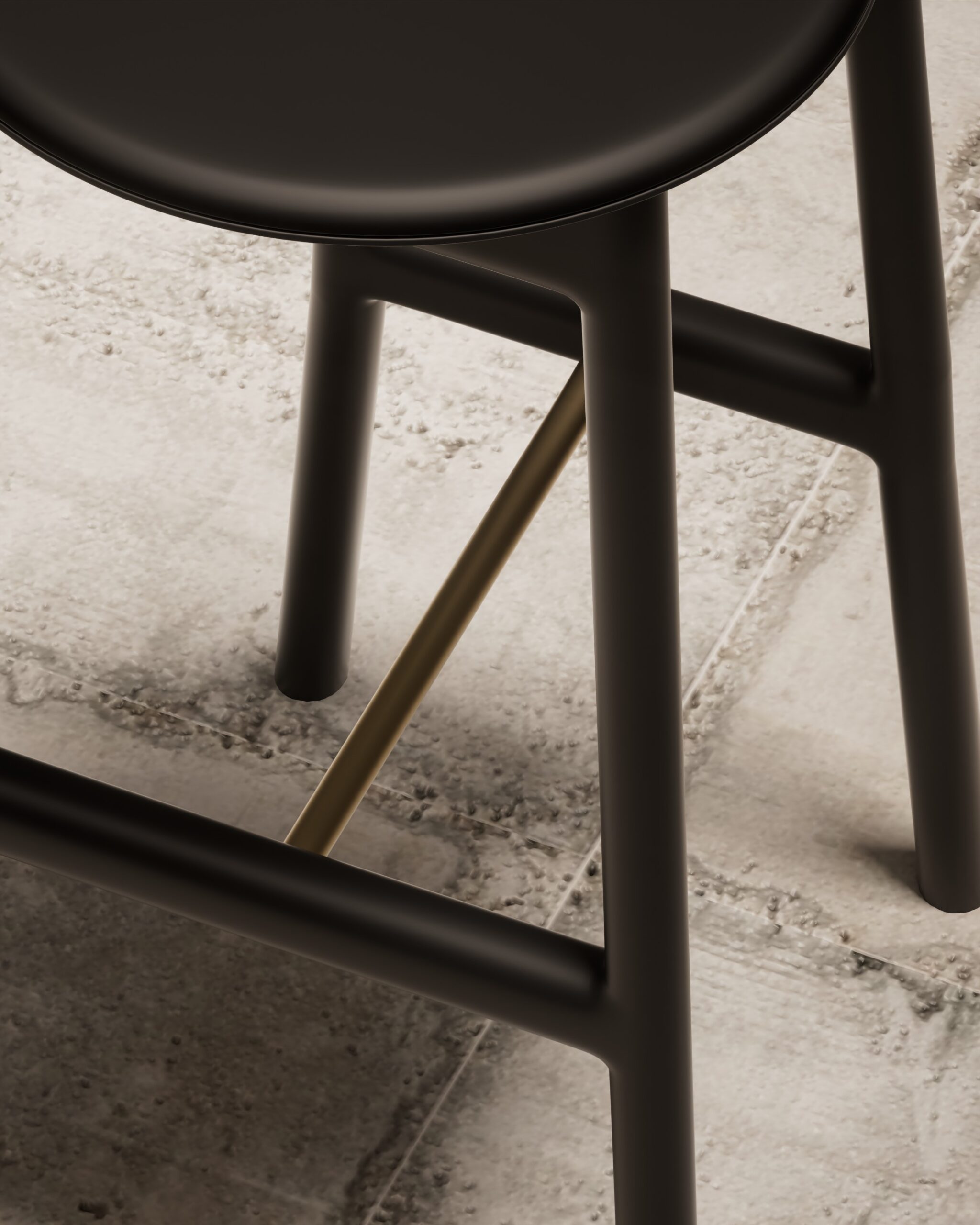 The LUNA bar stool is a study in monolithic minimalism and industrial precision. Part of our Raw Collection, it features a seamless, deep matte charcoal silhouette defined by a perfectly circular seat and a functional, handle-style T-bar backrest. The stool’s utilitarian character is elevated by a single, diagonal antique brass footrest that provides a sharp metallic contrast to the dark, architectural frame. This interplay of stark geometry and refined hardware creates a bold, sculptural presence that is both durable and sophisticated for modern industrial spaces.