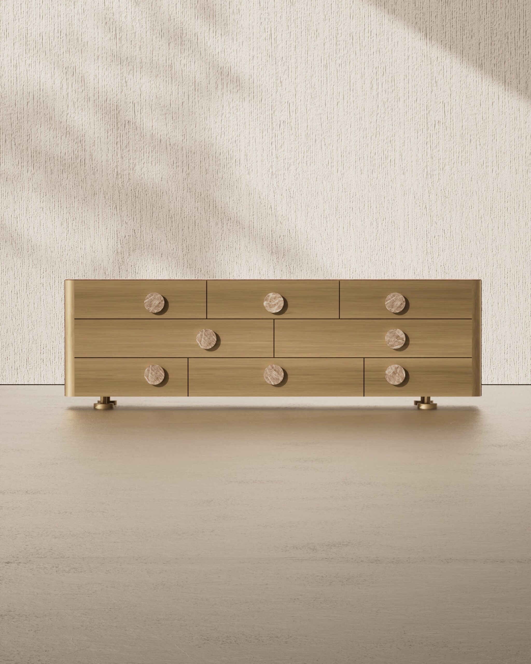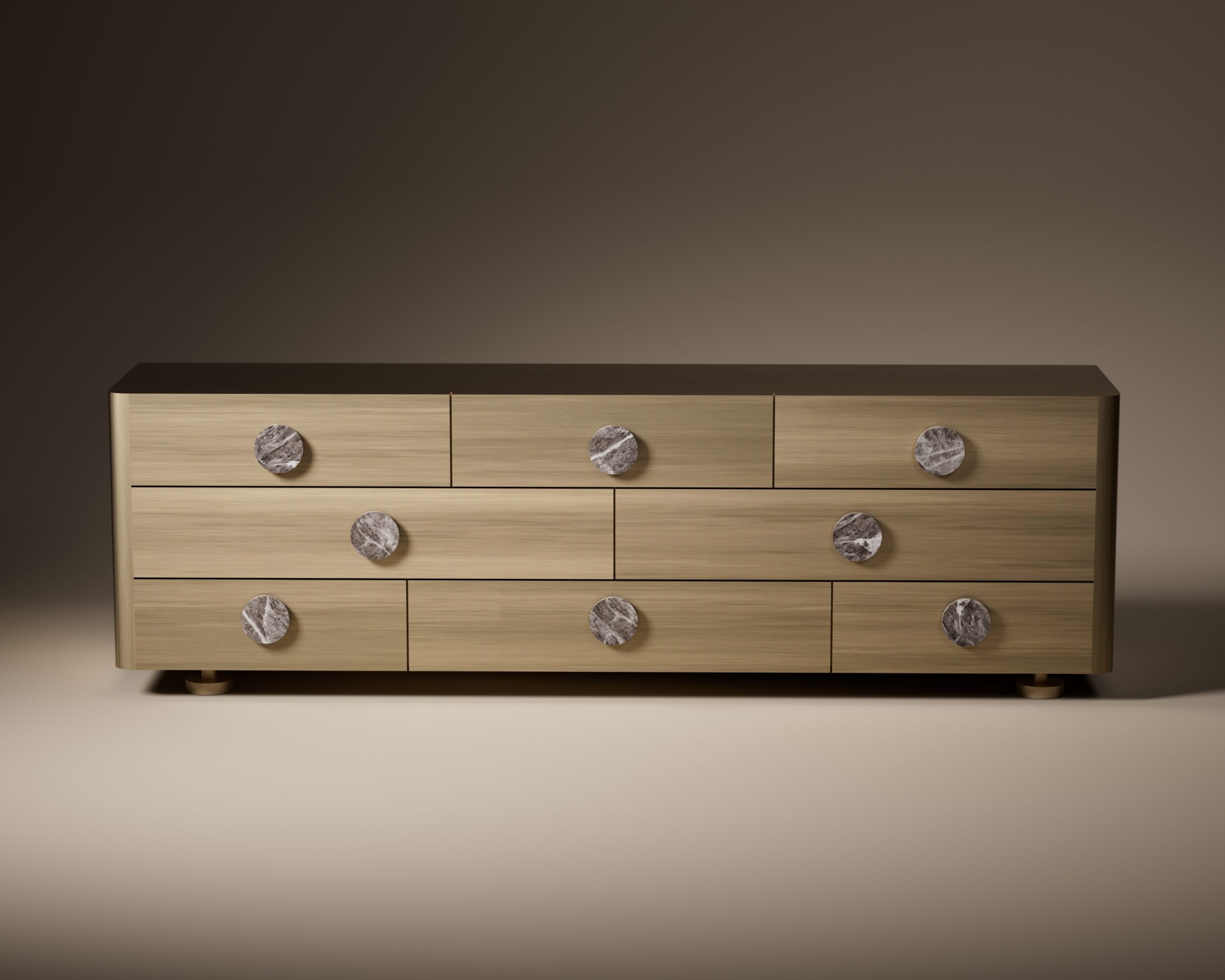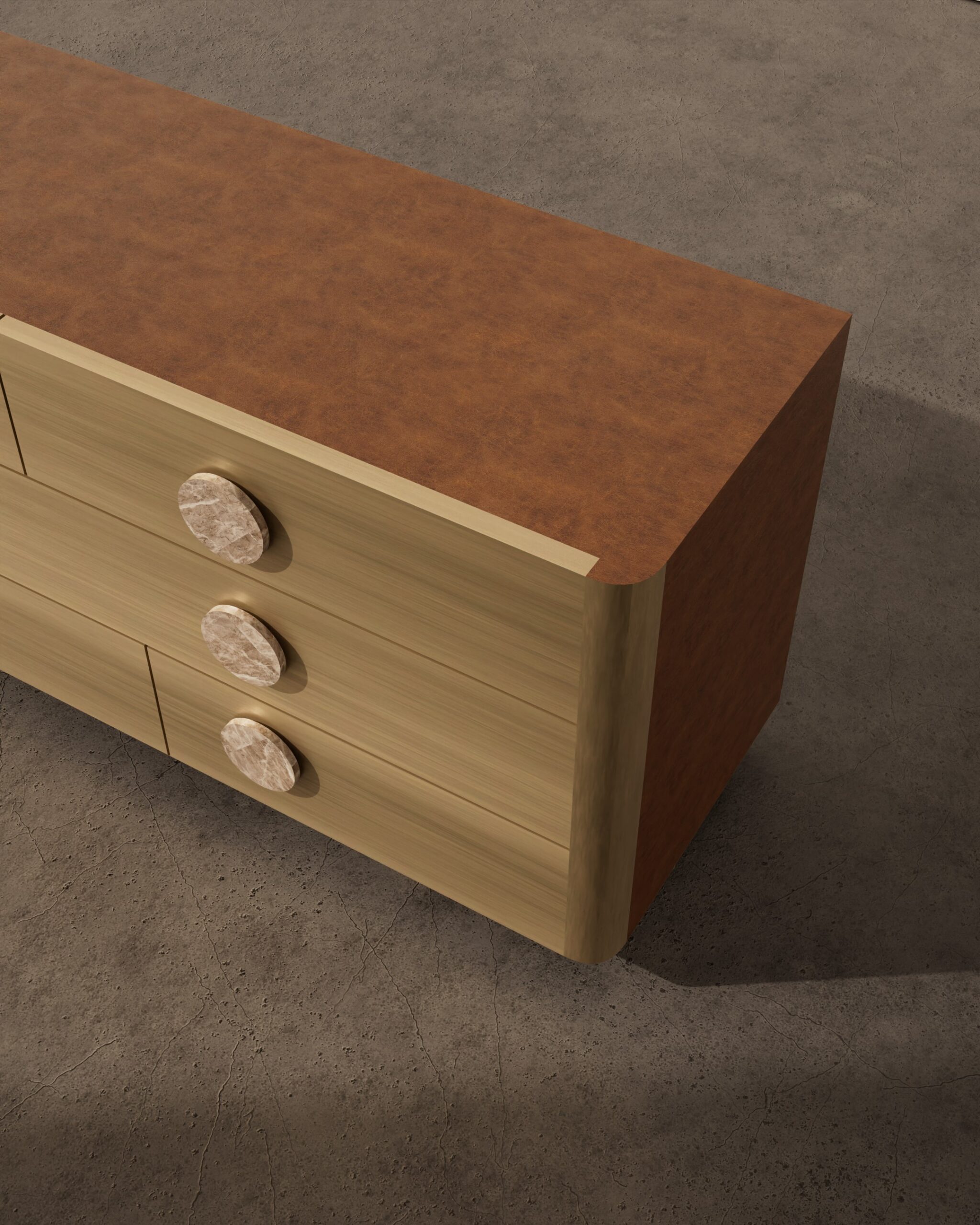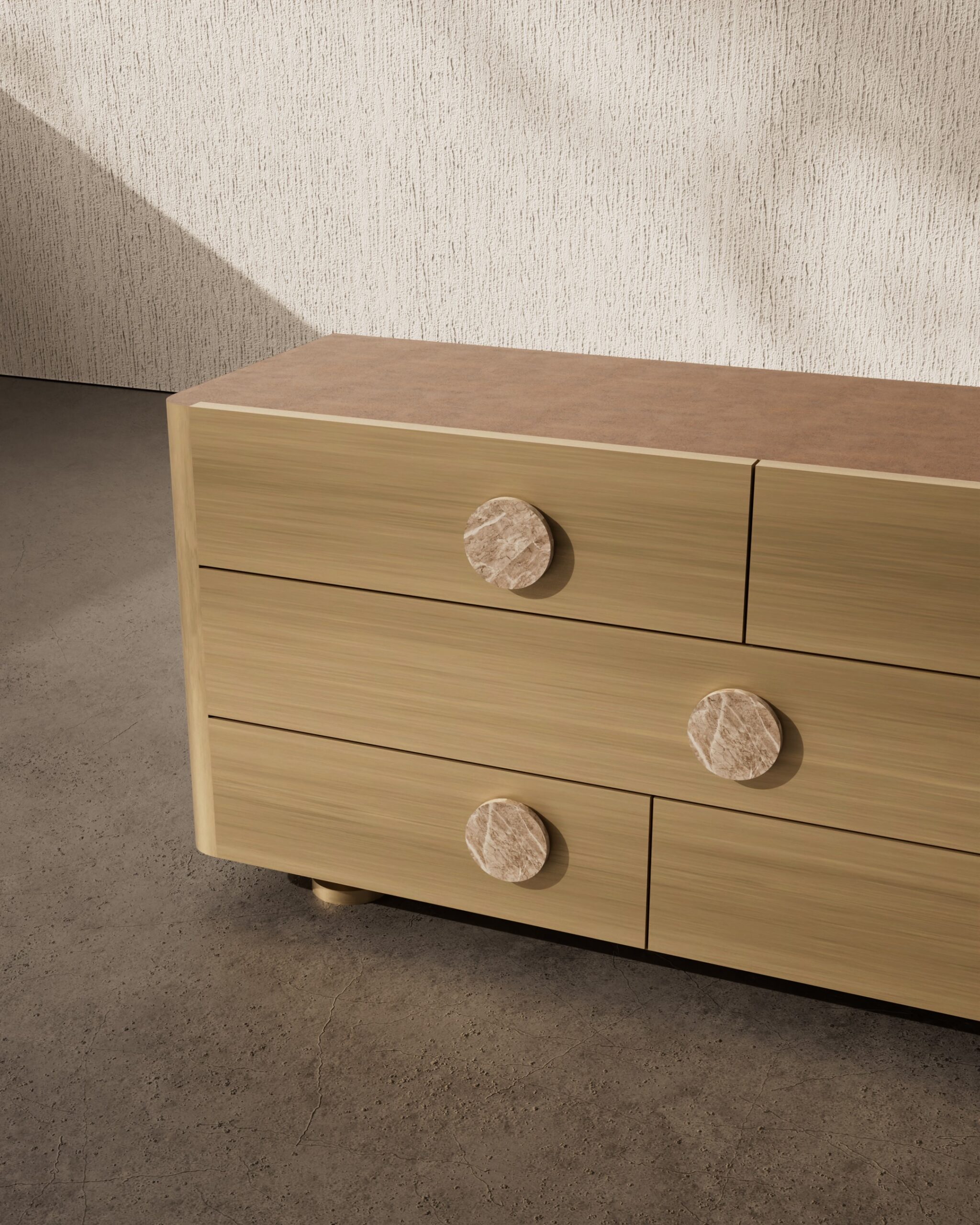 The MAGMA console is a study in tectonic layering and raw, sculptural power. Part of our Design Studio Collection, the piece features an expansive, irregular top crafted from solid deep walnut, showcasing a rich natural grain and soft, organic edges. This substantial wooden plane appears to hover, elevated by thin metallic spacers above two massive cylindrical pedestals finished in a textured charcoal. These supports are defined by a unique “chiselled” surface that mimics the cooling patterns of volcanic strata or weathered industrial casts. By juxtaposing the refined warmth of the timber with the rugged, geological foundation of the base, the MAGMA serves as a primitive yet sophisticated anchor for modern entryways and gallery spaces.
