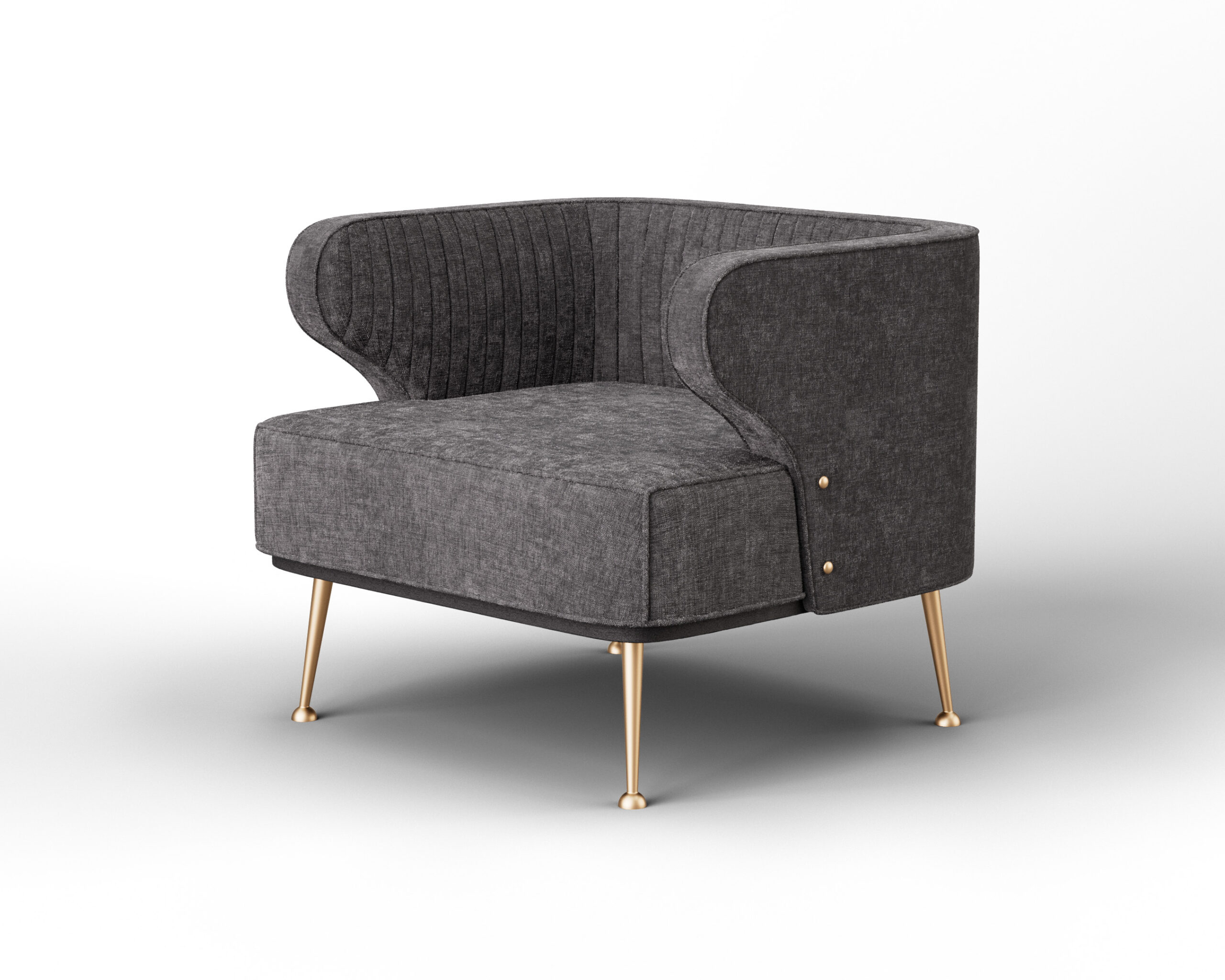 The visual narrative is driven by the rhythmic vertical channel tufting that lines the interior of the backrest, providing a sophisticated graphic detail that catches the light across the velvet’s nap. This volumetric shell features distinctive, rounded “wing” armrests that sweep outward, creating a sheltered and ergonomic embrace. Supporting the heavy upholstered body are four slim, tapered legs in a champagne gold finish, each capped with a subtle ball footer for a touch of retro-inspired elegance. The MARL balances its bold, monolithic presence with an airy, elevated base, serving as a commanding focal point for high-end residential lounges and curated library spaces.