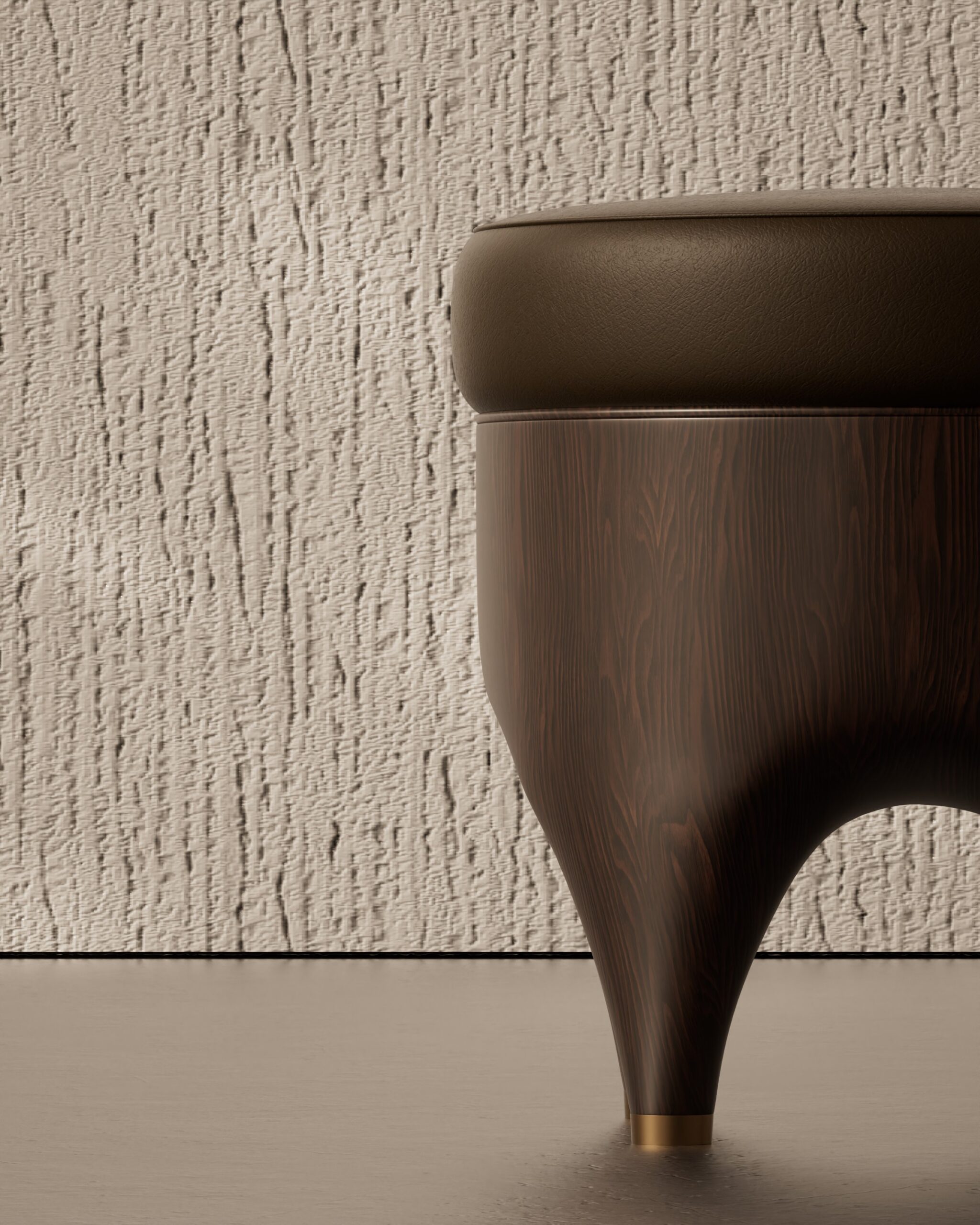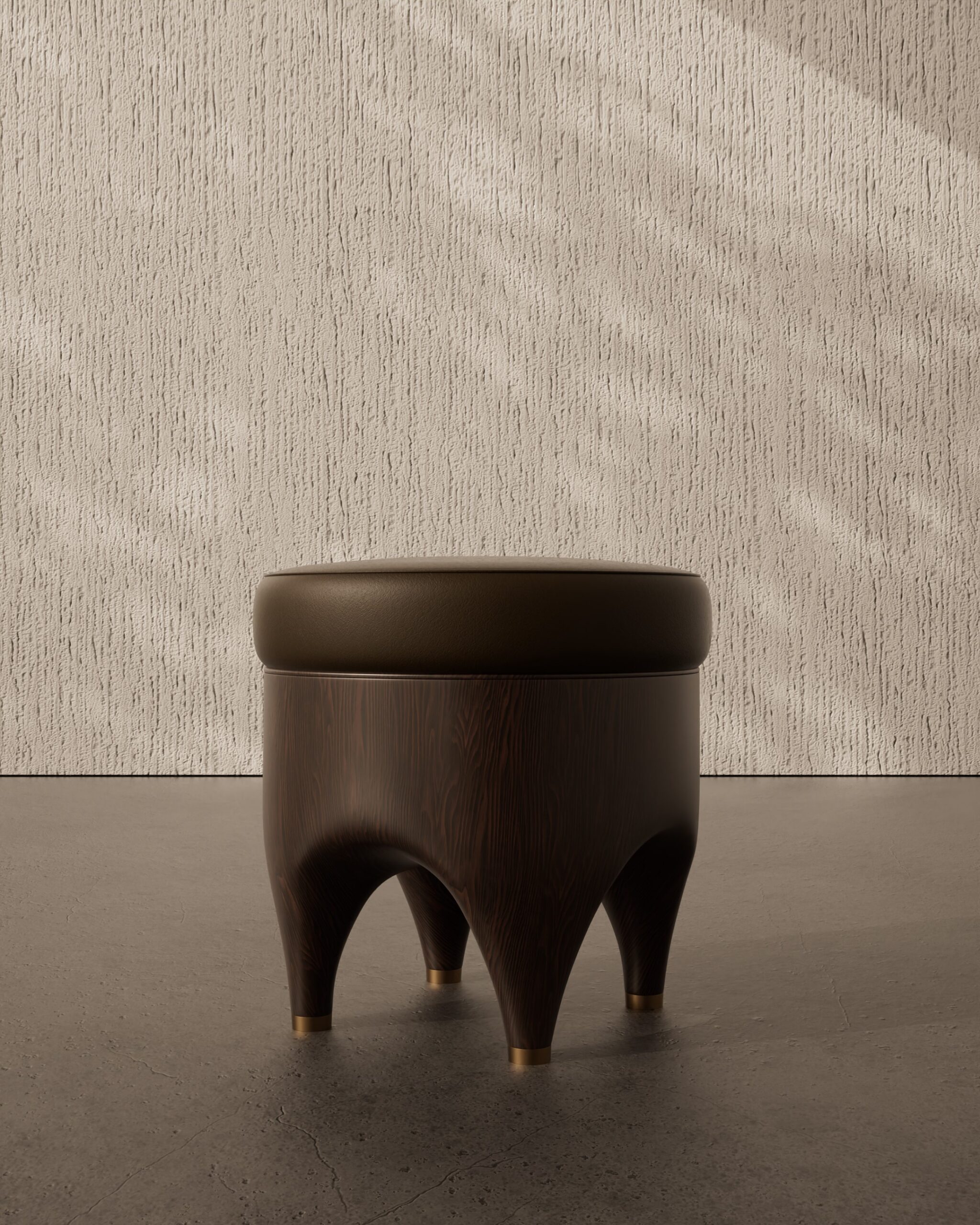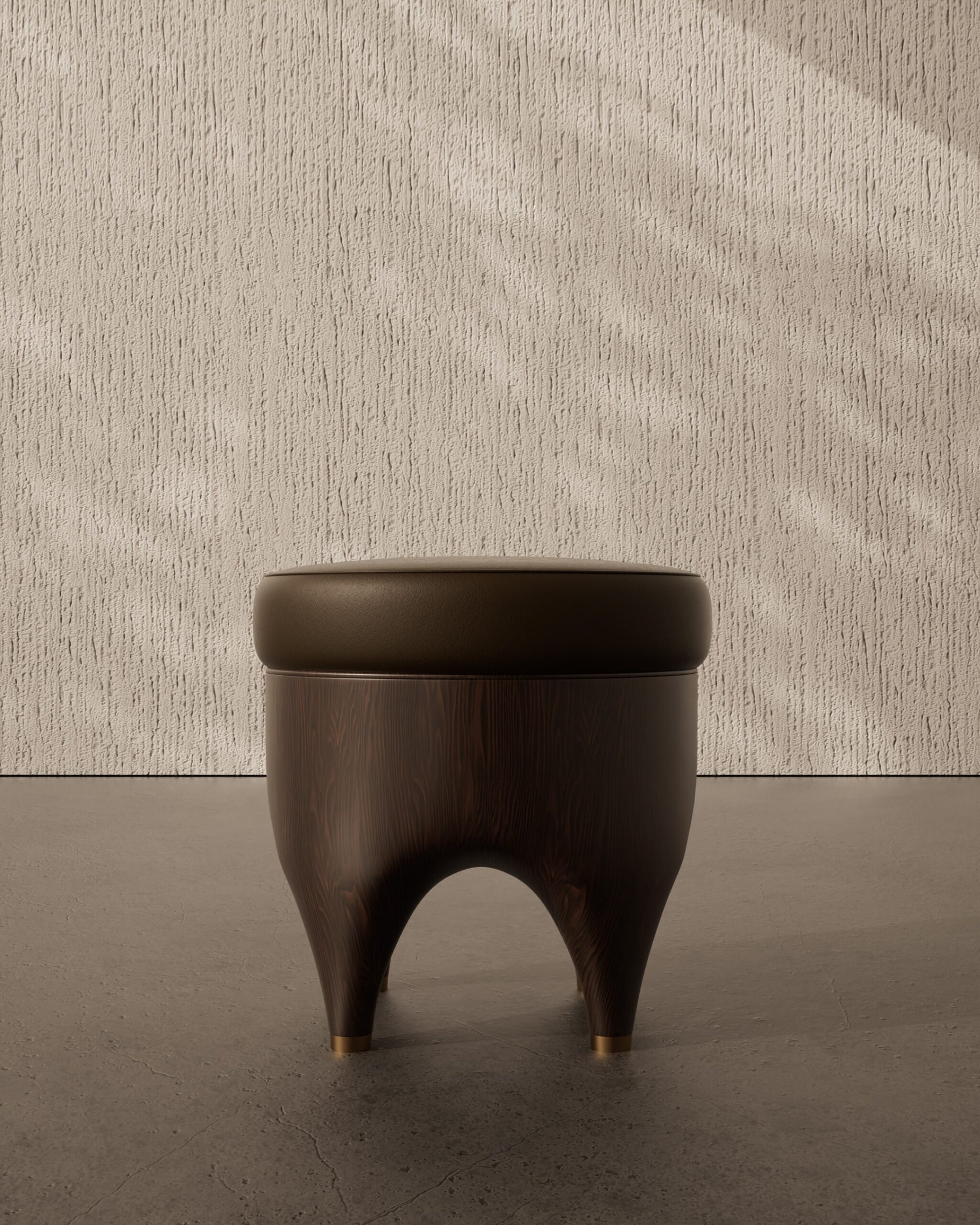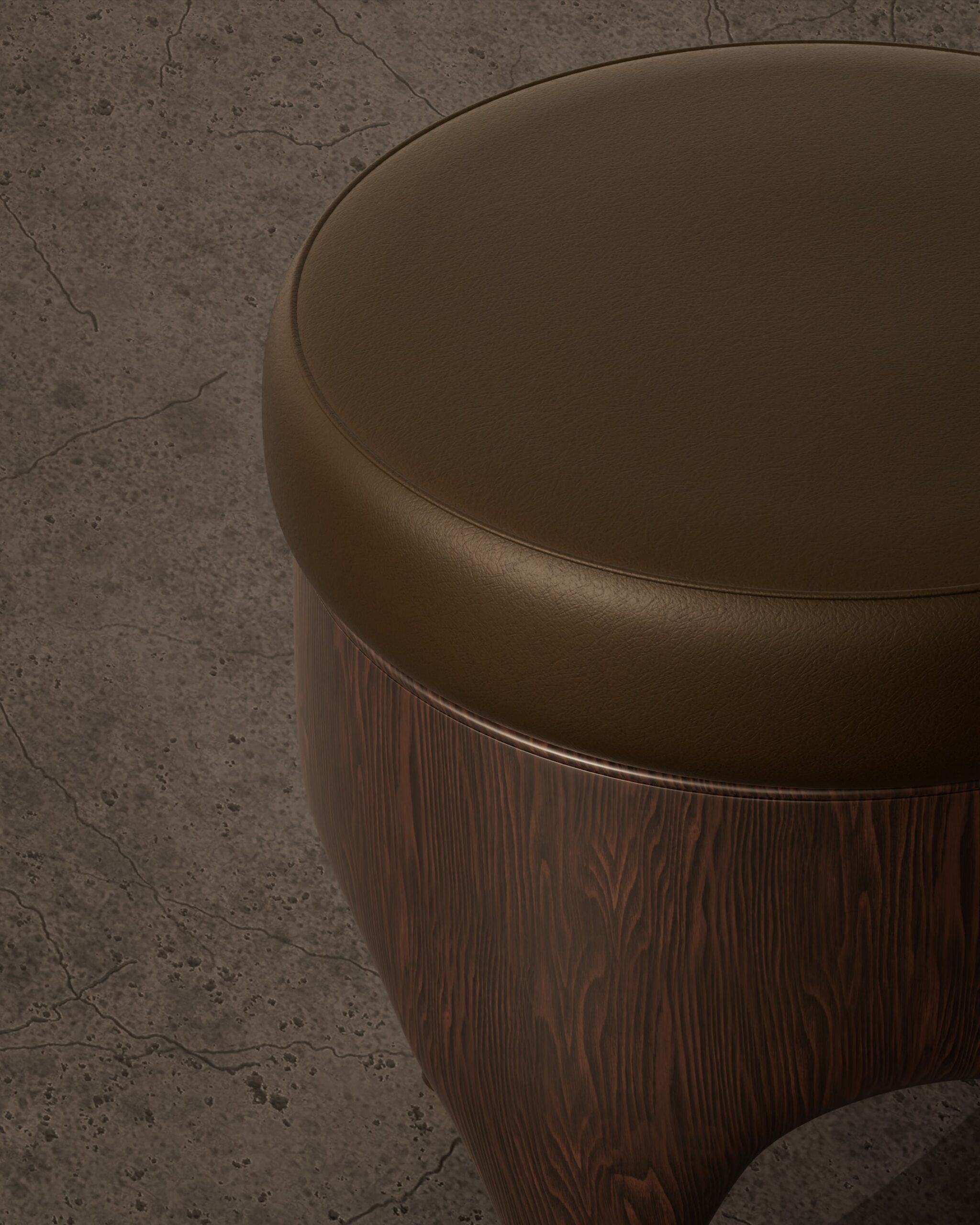 The MARROW pouf is a study in skeletal elegance and organic warmth. Part of our Design Studio Collection, the piece is anchored by a tripod base hand-carved from solid deep walnut, featuring three arched legs that taper into delicate, brass-capped feet. These structural elements rise to cradle a generously padded, circular seat upholstered in dark chocolate leather. Defined by its fluid joinery and biomorphic silhouette, the MARROW balances the strength of architectural timber with the inviting softness of fine leather, creating a sculptural seating option that feels both ancient and refined.
