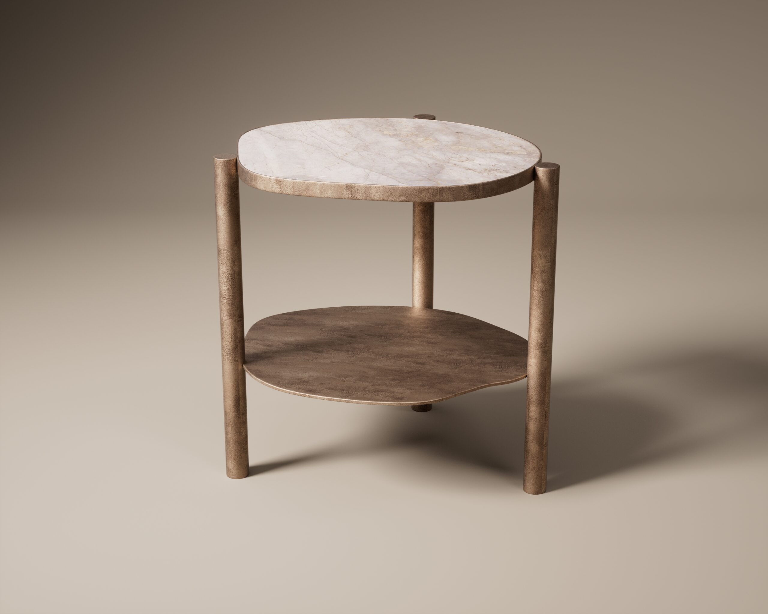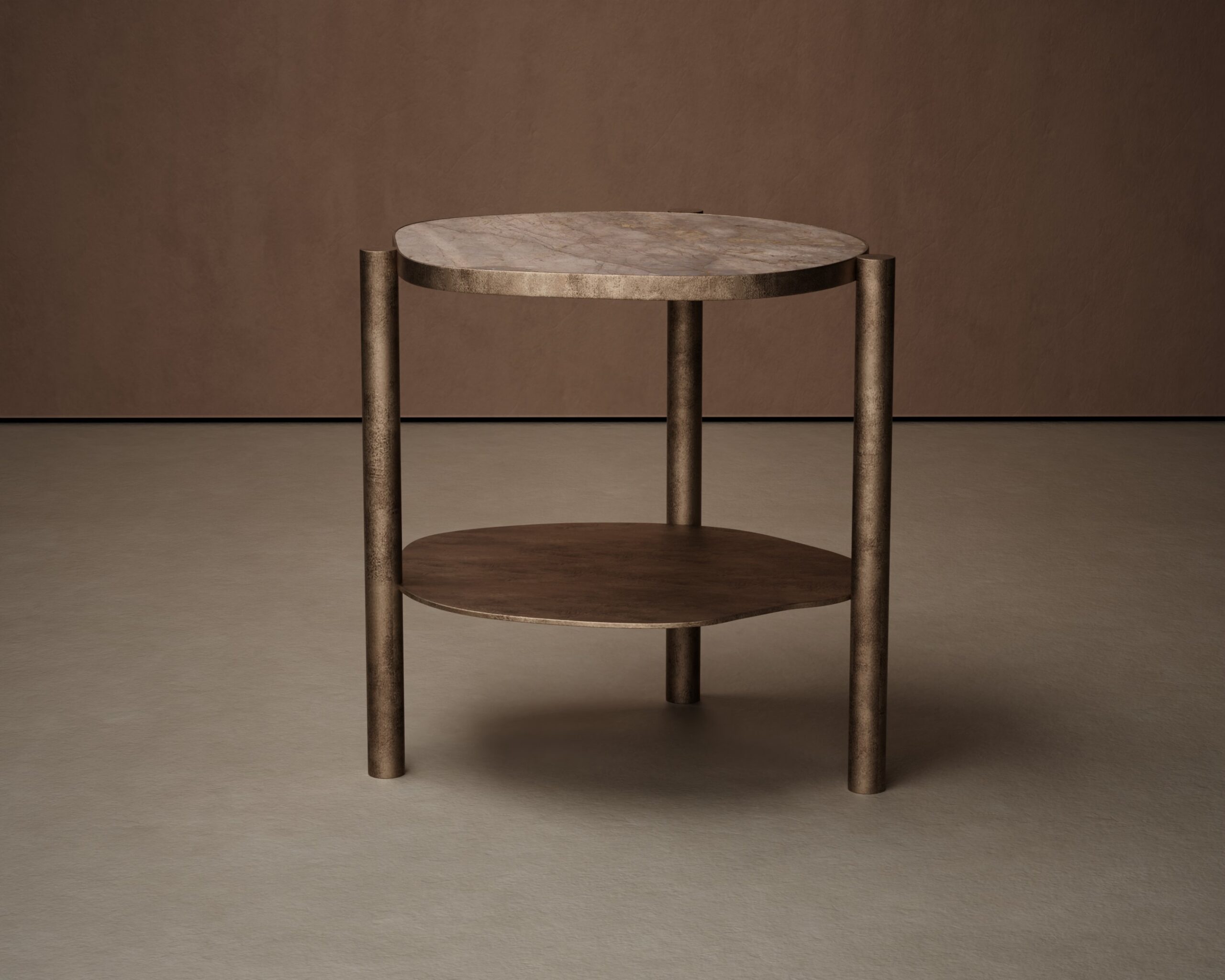The MESA side table is a study in linear precision and tiered functionality. Part of our Design Studio Collection, the piece is characterized by its lightweight, architectural framework finished in a rich aged bronze. The design features three perfectly vertical, cylindrical legs that extend slightly above the primary surface to create a subtle, decorative detail at the perimeter. This metallic structure supports a thin-profile polished natural stone top, showcasing a soft palette of tan and cream with delicate geological veining. A matching aged bronze lower shelf provides secondary storage, reinforcing the table’s balanced, tripod-inspired stance. The MESA balances the industrial durability of cast metal with the organic elegance of stone, offering a versatile and refined accent for modern living environments.