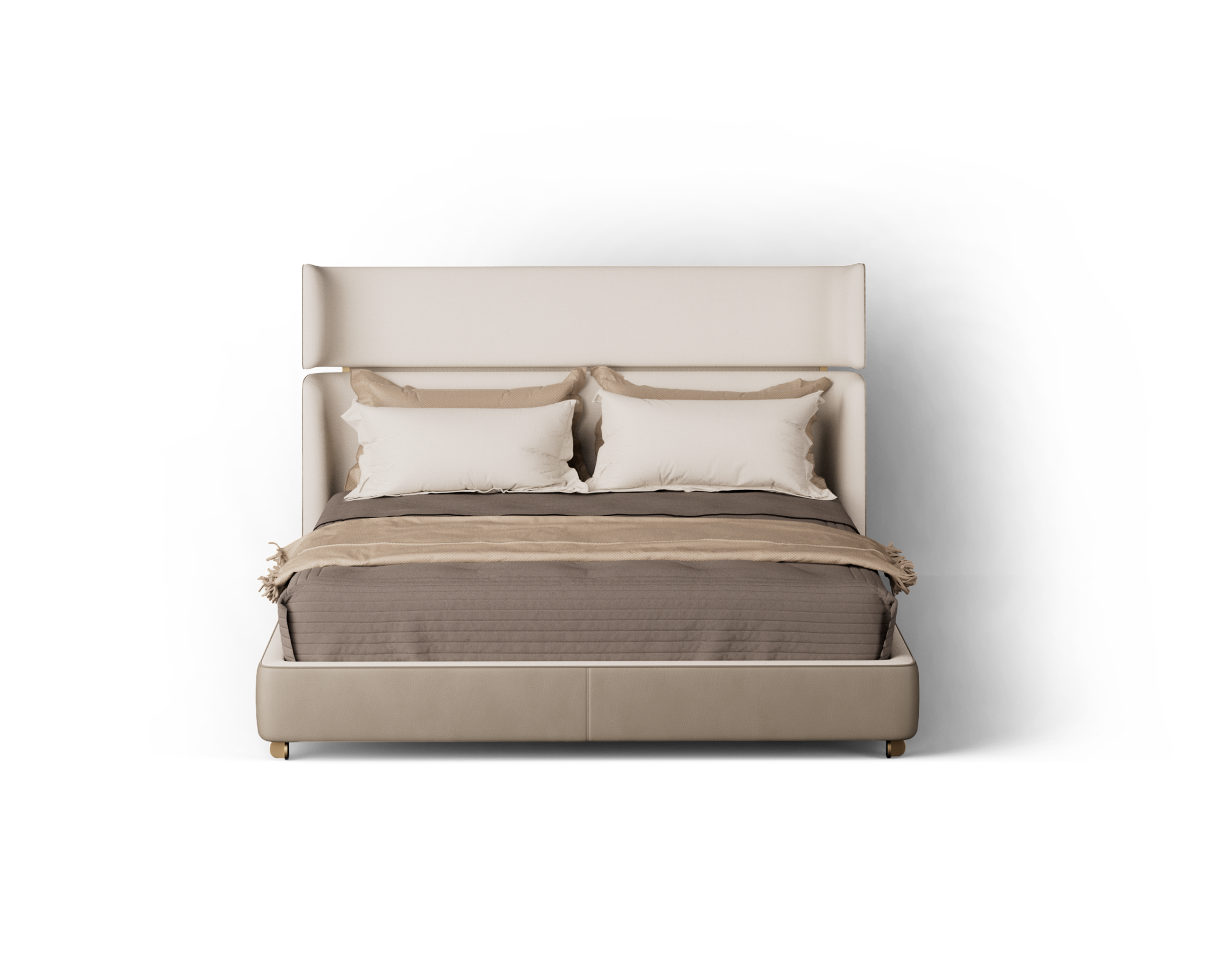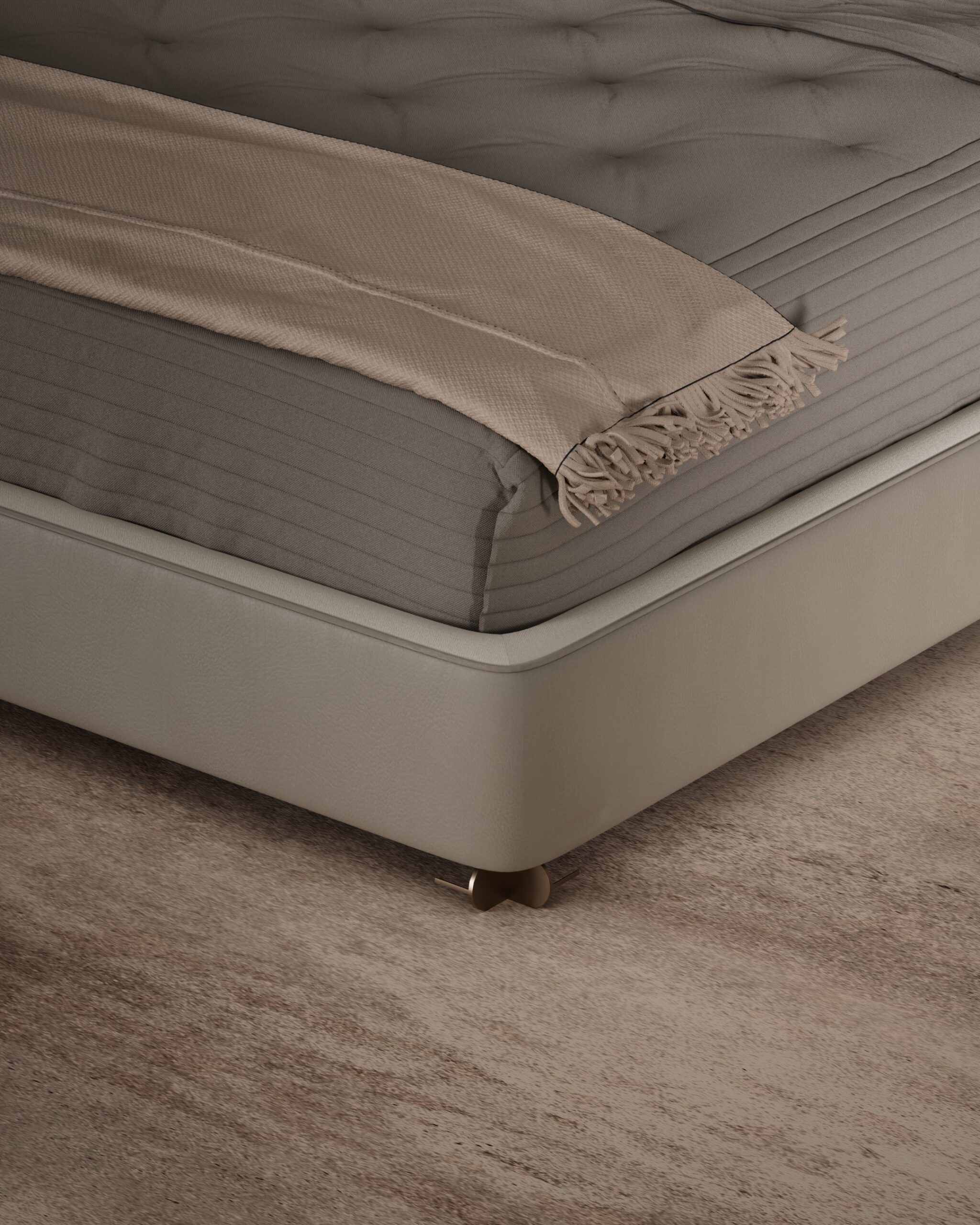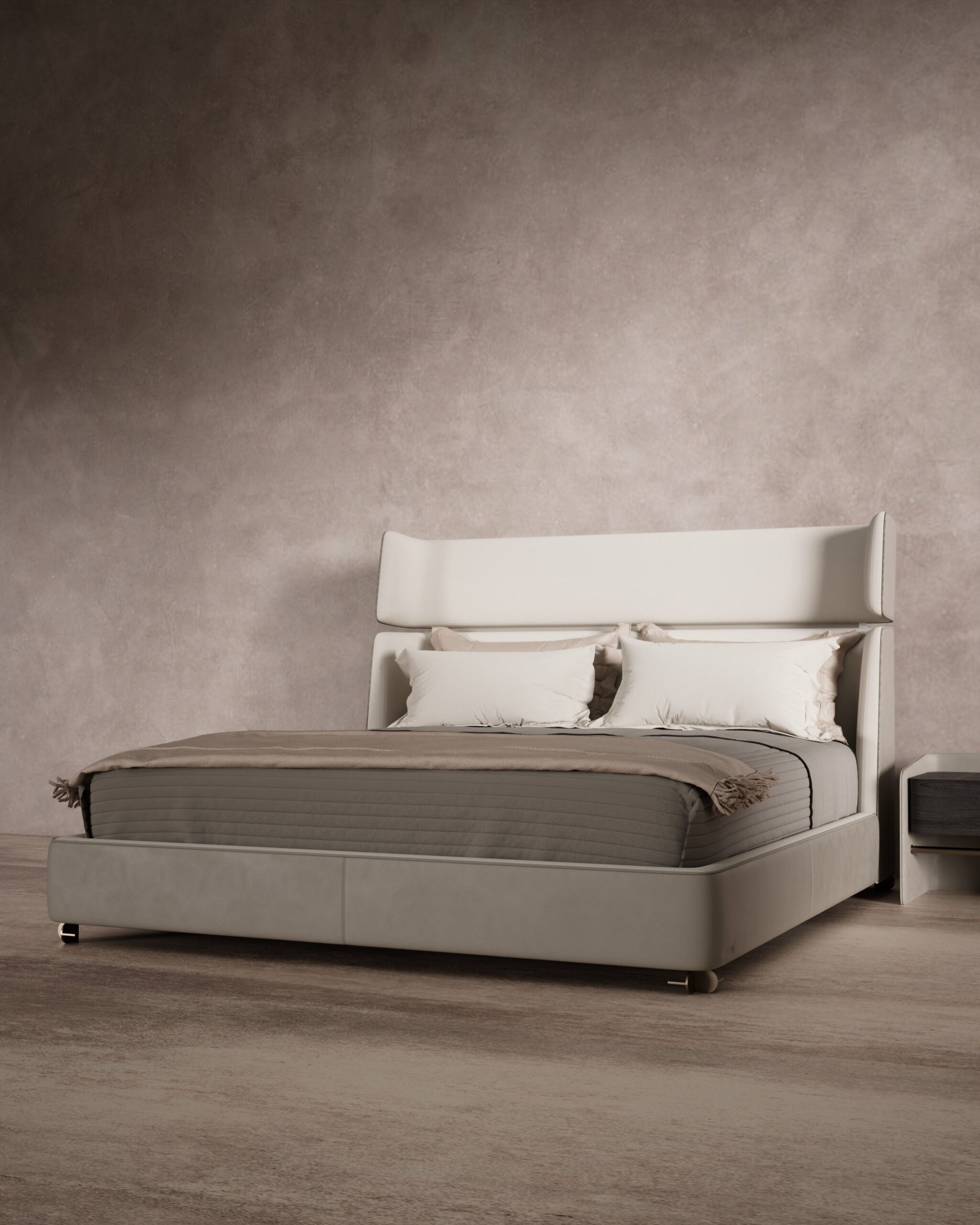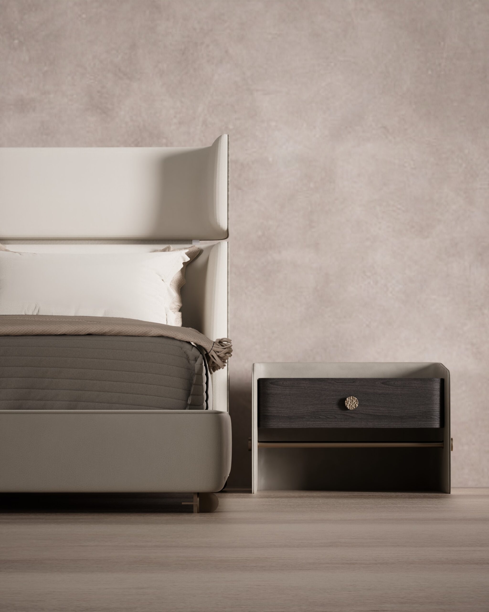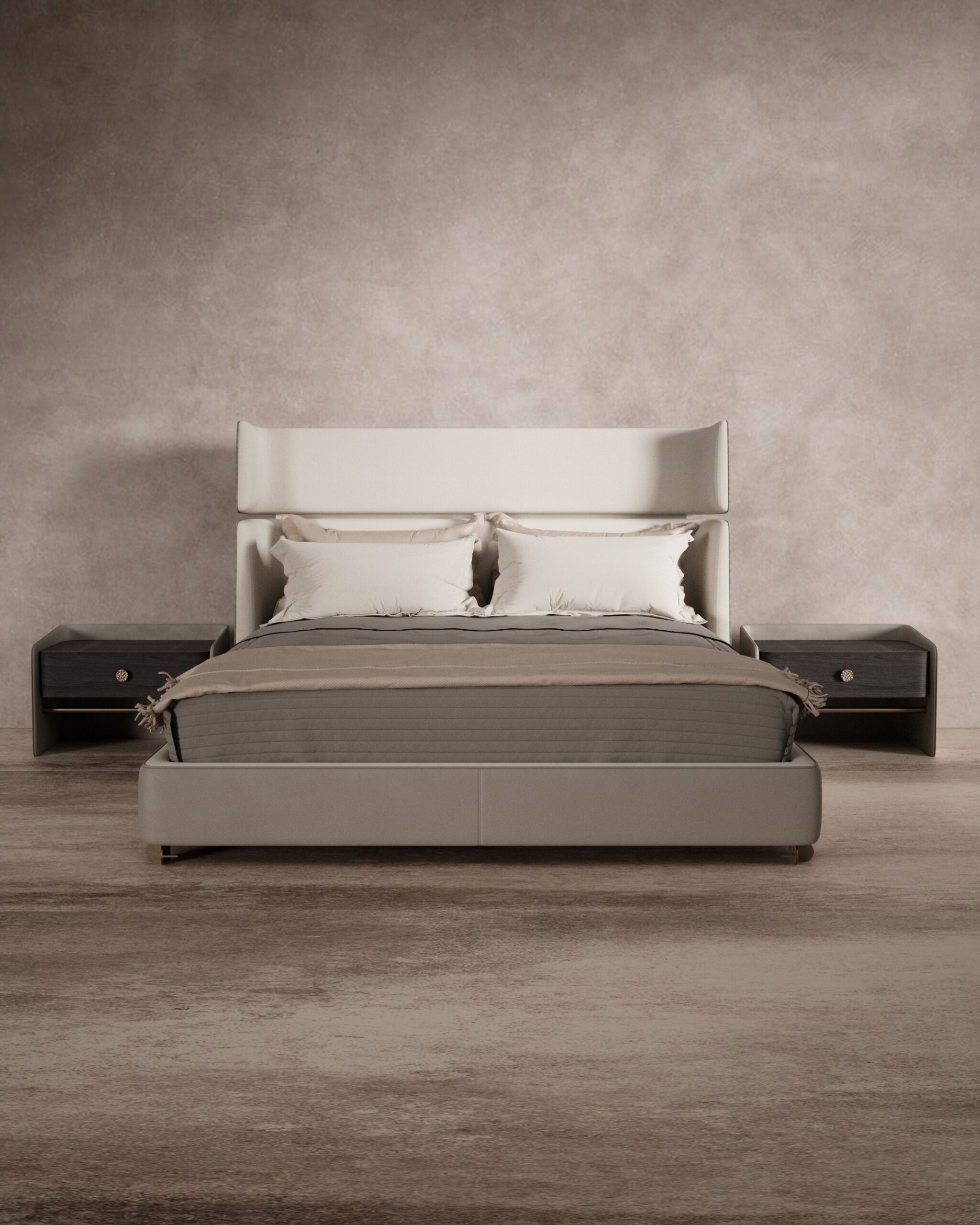 The MESA bed combines modern architectural lines with the comfort of a luxury suite. Its silhouette is defined by a high, split-cushion headboard with subtle “wings” that create a sense of privacy and enclosure. The bed frame is wrapped in a smooth, taupe leather that extends to the unique nightstands, which feature a dark wood drawer unit suspended within a leather-wrapped sling, giving the heavy material a floating, weightless appearance. The design is grounded by discreet metallic feet that add a touch of industrial precision to the soft forms.