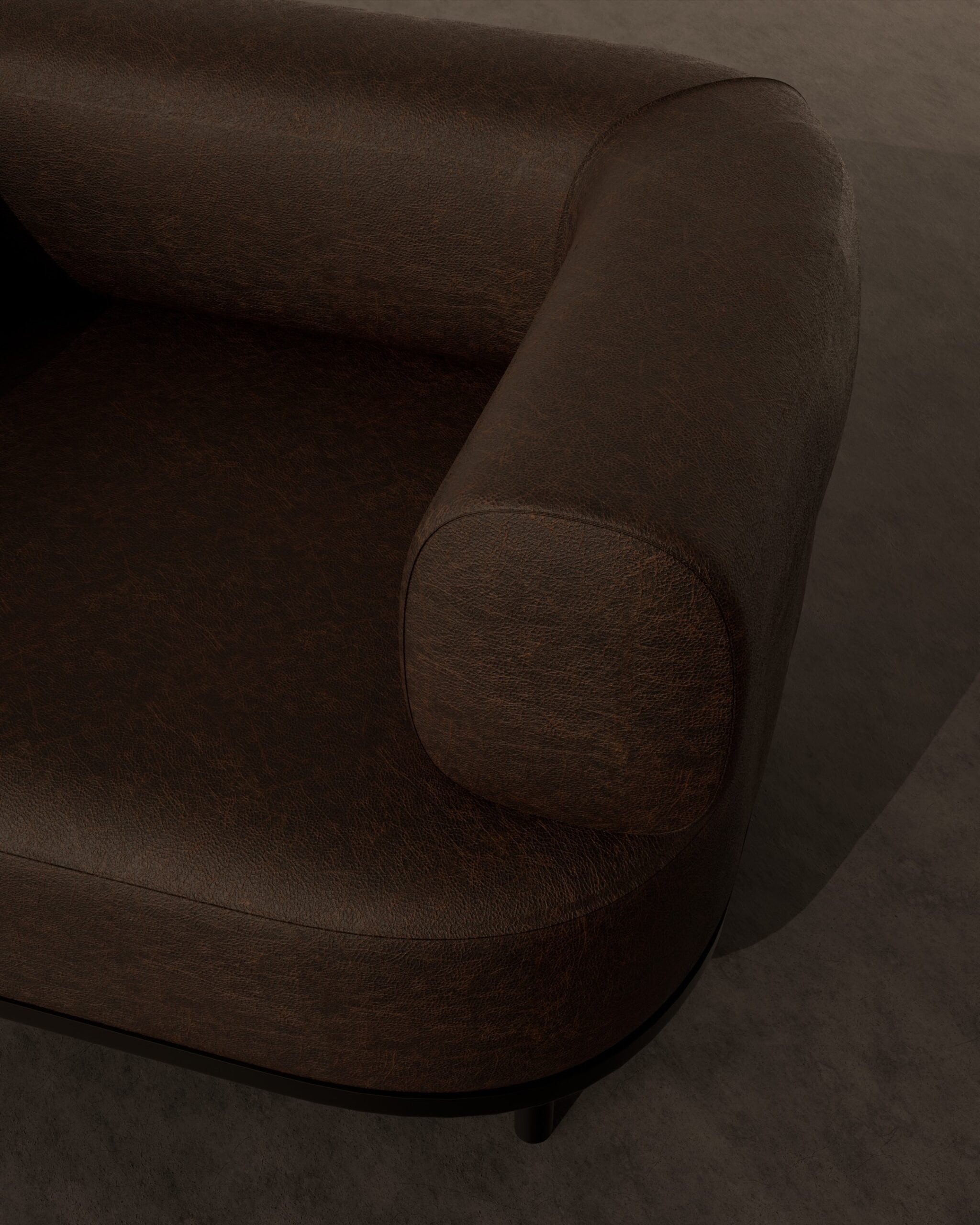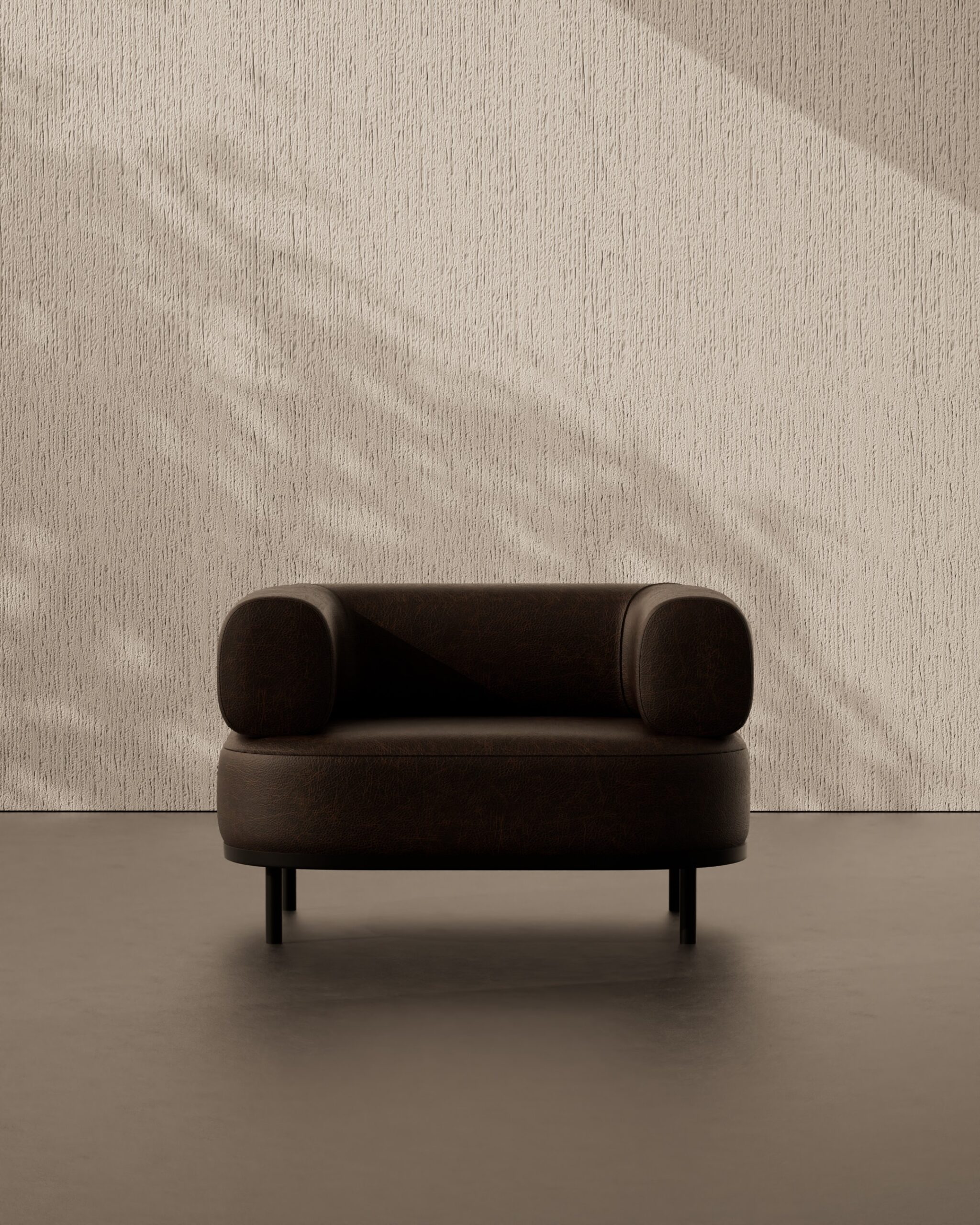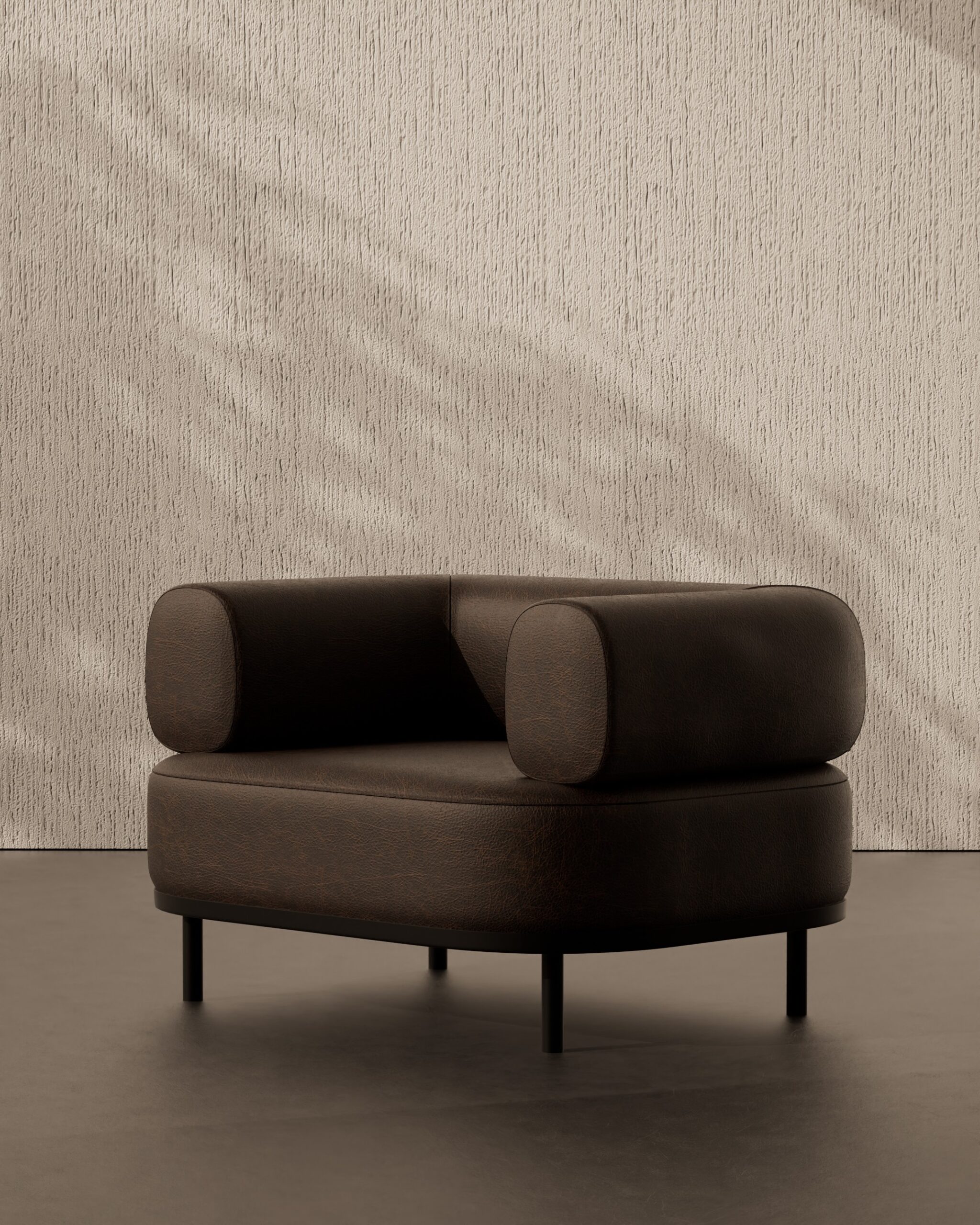 The MILANO armchair is a sophisticated reinvention of the classic club chair, defined by its play on volume and gravity. The design is dominated by its substantial, “inflated” upper body, featuring massive, rolled cylindrical arms that flow into a deep, inviting seat. Wrapped in premium dark espresso leather with a soft satin sheen, the chair exudes a sense of heavy, masculine luxury. This visual weight is dramatically counterbalanced by four ultra-slender, black steel legs, creating a “floating” effect that prevents the piece from feeling bulky, resulting in a silhouette that is both grounded and surprisingly buoyant.