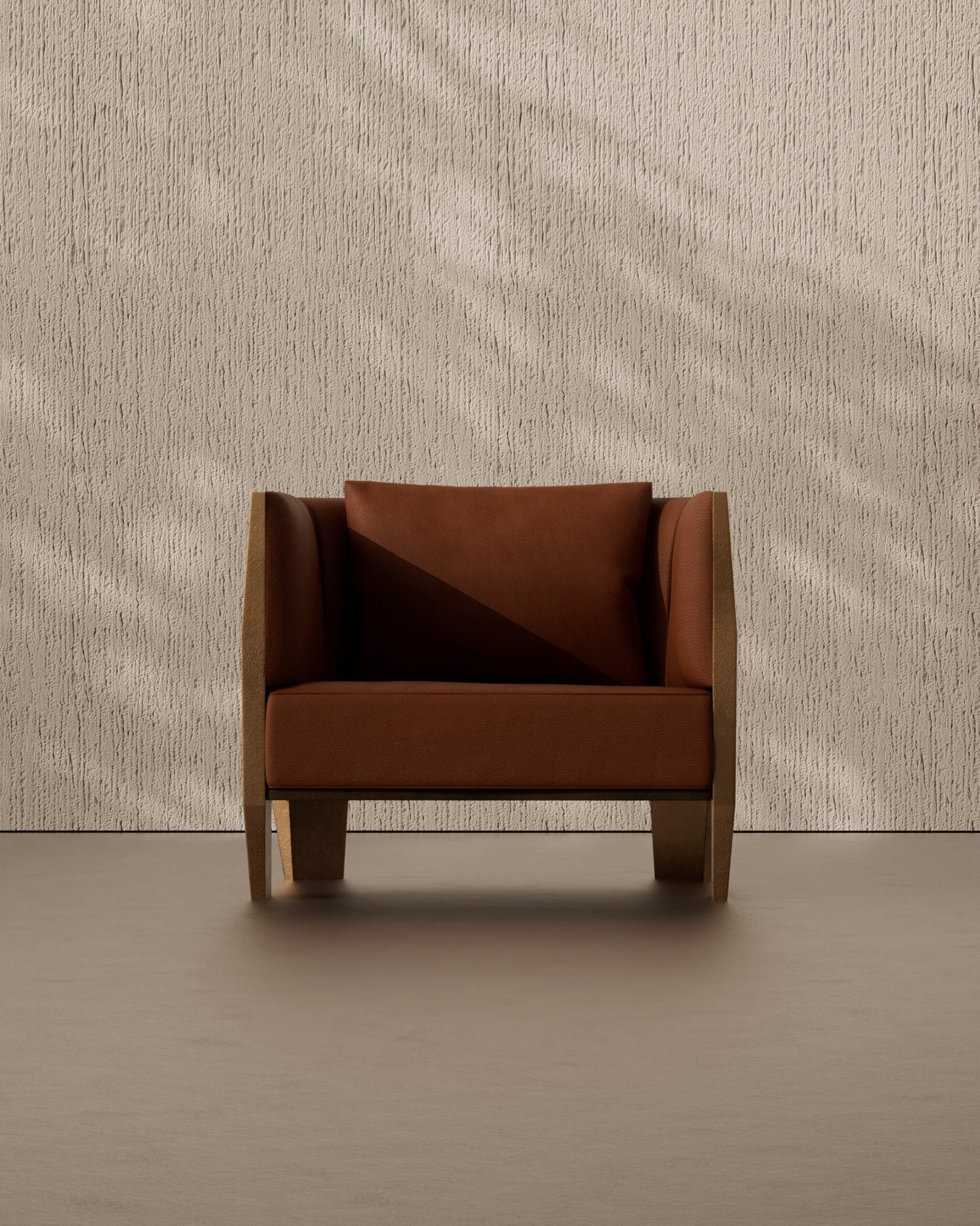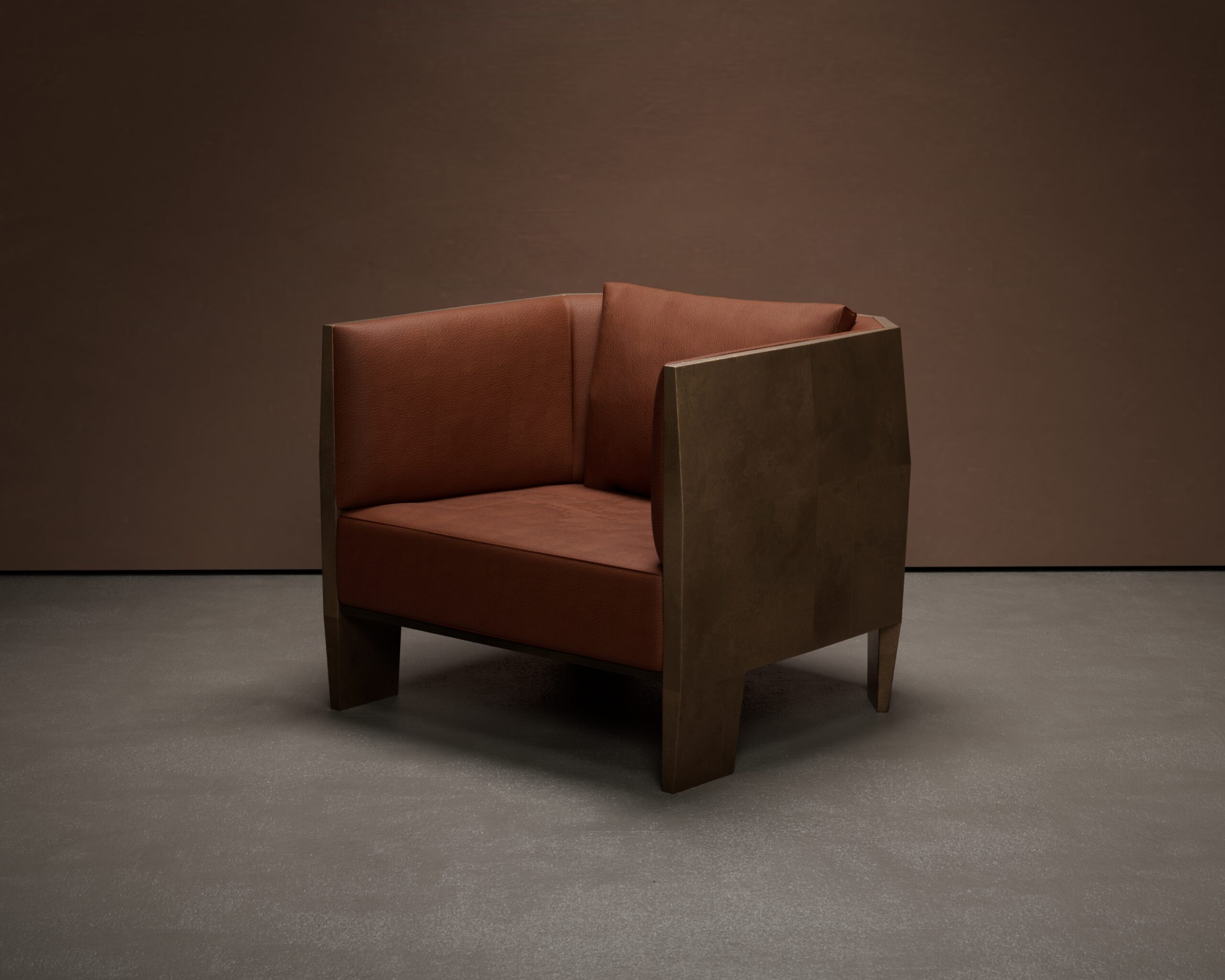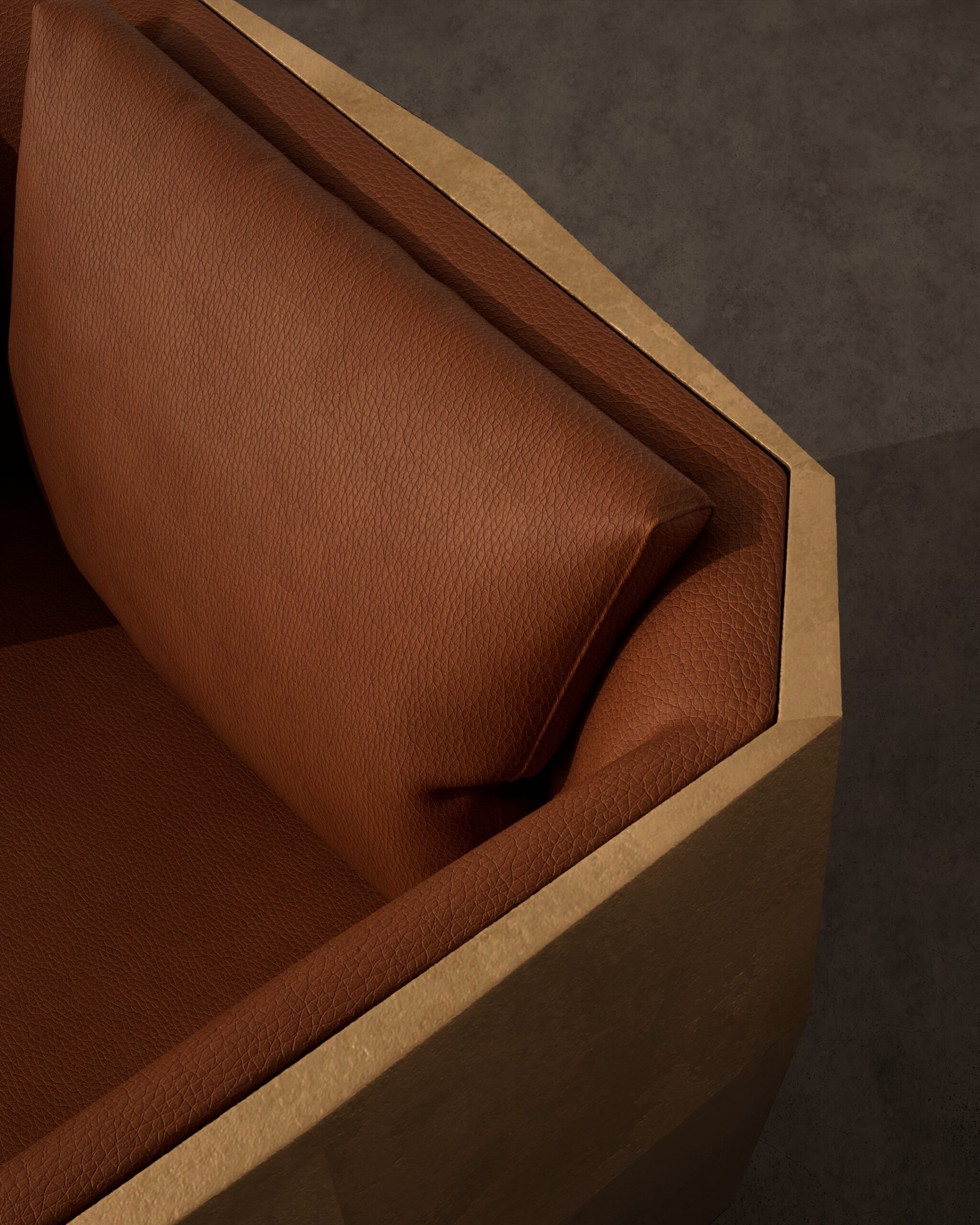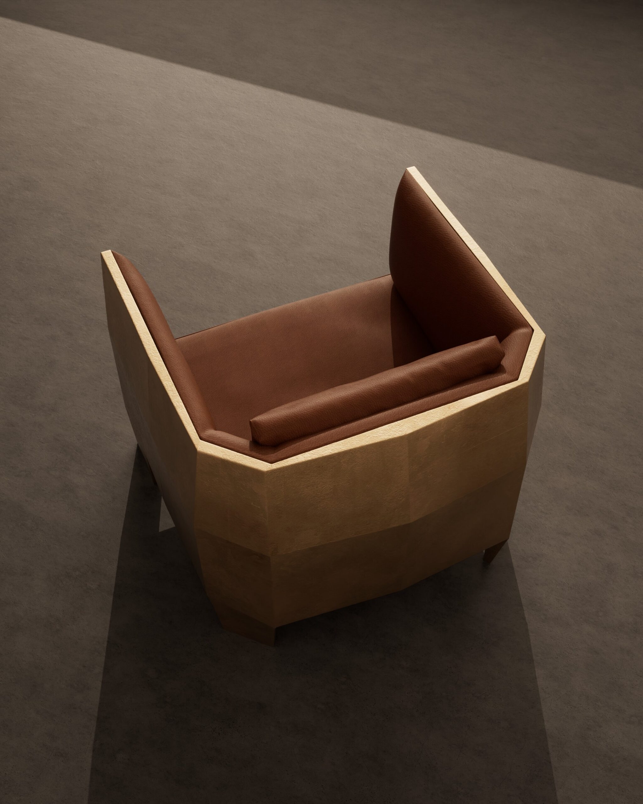 he MONARC armchair is a commanding statement piece that lives up to its regal name, blending Brutalist geometry with opulent materials. The design is characterized by its protective “exoskeleton”—a thick, faceted outer shell finished in a textured antiqued gold that creates a fortress-like silhouette. Inside this rigid, architectural casing sits a plush, inviting seat upholstered in rich cognac leather with a distinct pebbled grain. The contrast between the cold, hard angularity of the metallic exterior and the warm, organic softness of the leather interior creates a tension that is both dramatic and luxurious, making it a modern-day throne for the bold interior.