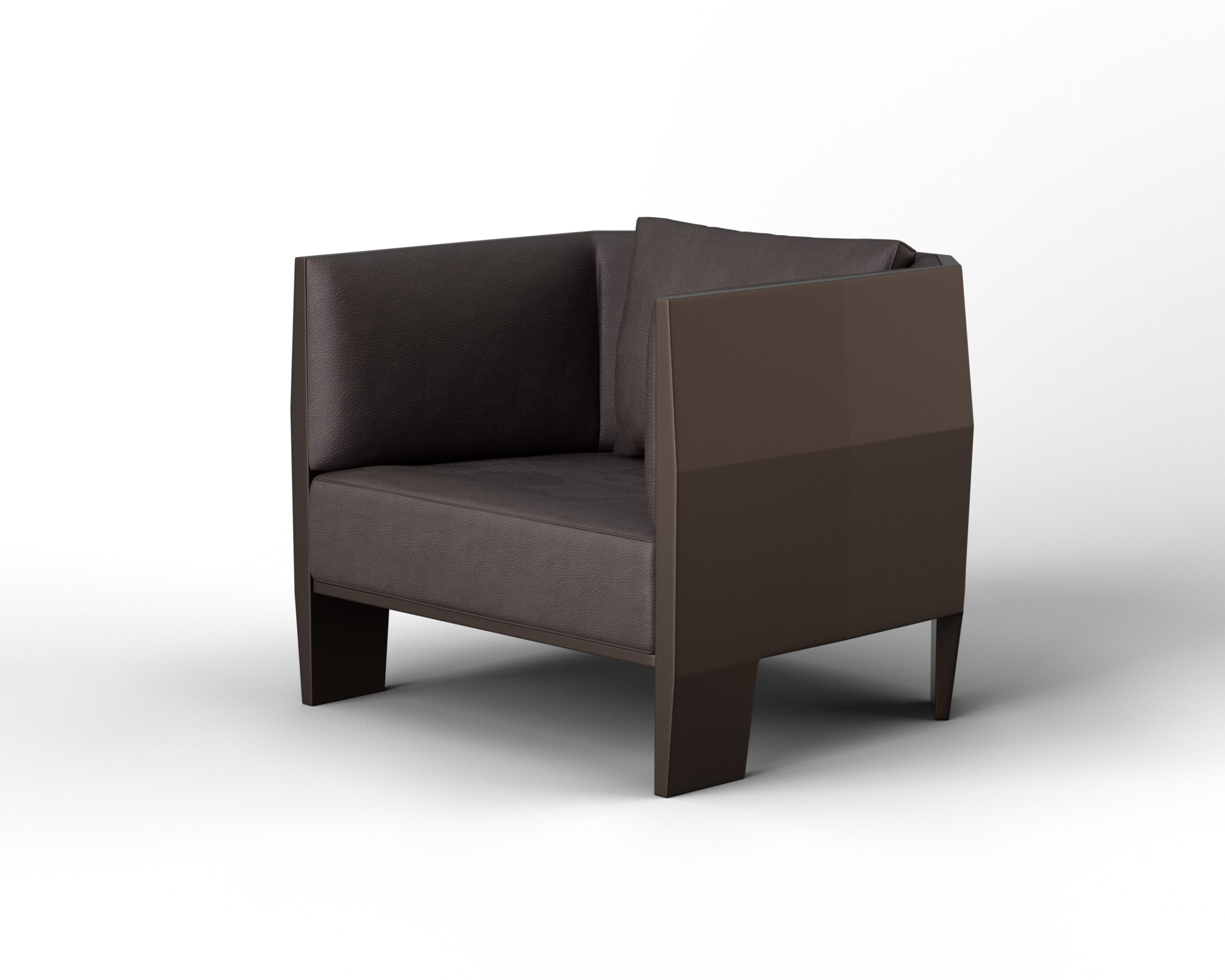 Faceted “gem-cut” exterior architecture, rigid exoskeleton frame, integrated block legs, sloping high-walled armrests