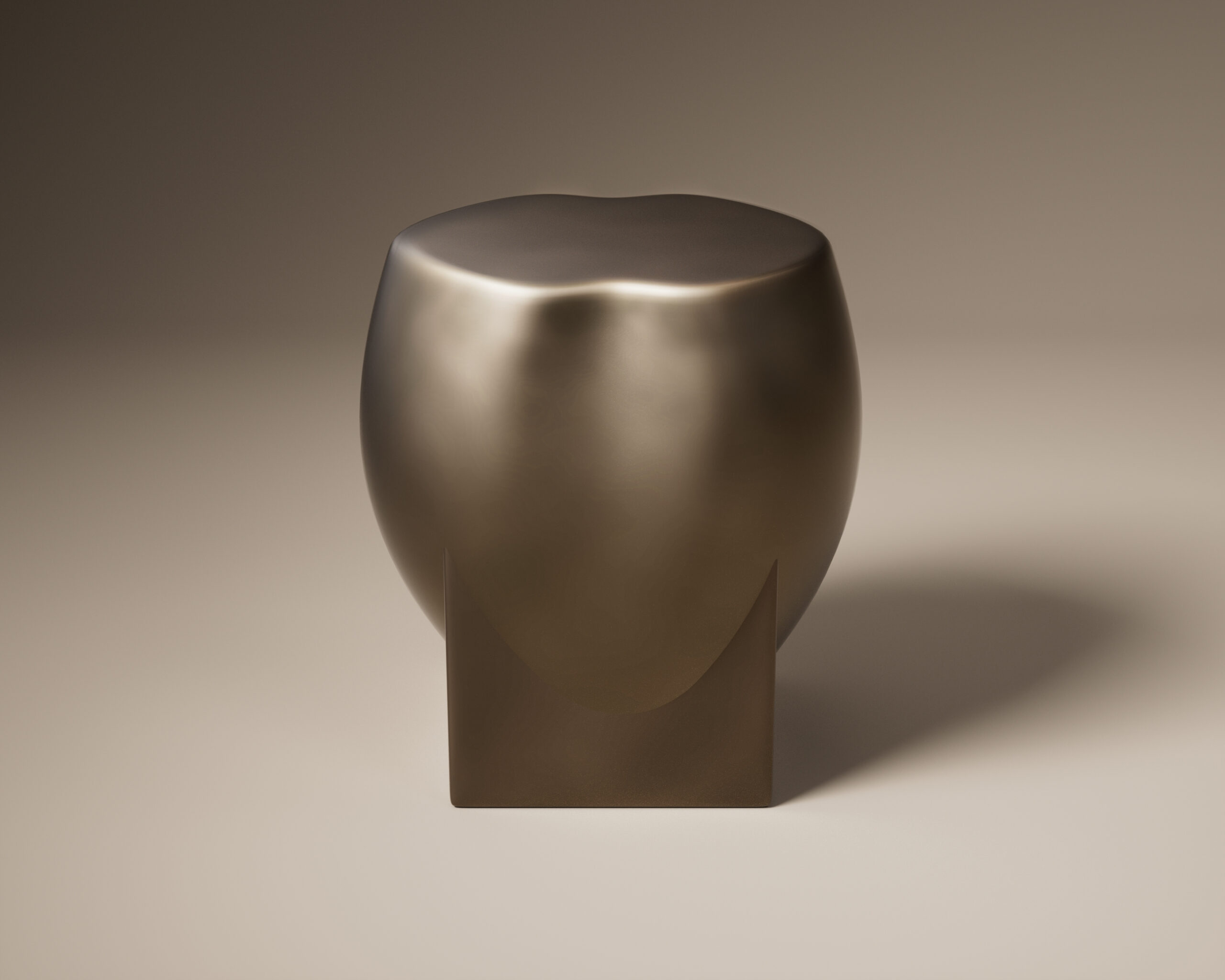 The MONOLITH side table is an exploration of geometric fusion and grounded volume. Part of our Design Studio Collection, the piece is characterized by its dual-form silhouette: a soft, expansive ovoid volume that appears to be lowered into a rigid, rectilinear base. This square foundation features four dramatic corner fins that rise to meet the curved body, creating a striking interplay between sharp architectural lines and organic fullness. Finished entirely in a rich aged bronze, the table displays a hand-applied patina that captures light across its broad, continuous surfaces. The MONOLITH balances a heavy, tectonic presence with refined sculptural grace, serving as a permanent and sophisticated anchor for contemporary living environments.