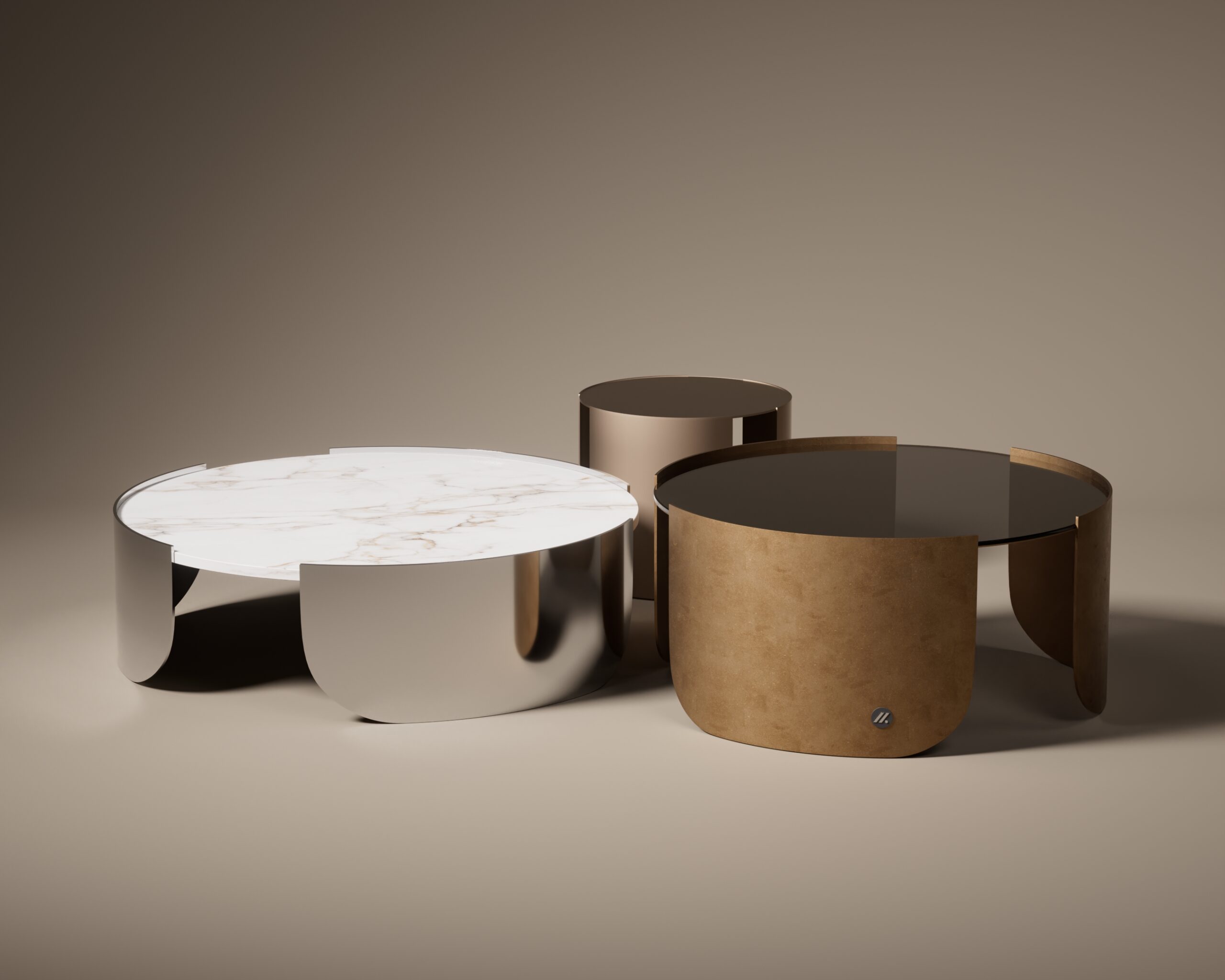 The MOON center table is a study in nested geometry and reflective phases. As a versatile centerpiece for the Luxury Collection, the design consists of three distinct circular tables of varying heights and diameters that can be clustered to create a tiered landscape or separated to serve as individual satellite pieces. The primary table features a polished white marble top anchored by a wide, crescent-shaped chrome base. This is complemented by a secondary table with a dark smoked glass surface and an aged brass frame, and a smaller, monolithic satin bronze side unit. The architectural narrative is defined by the thin, wrap-around metallic “shells” that partially shield each surface, creating a rhythmic play of light and shadow reminiscent of lunar cycles. The MOON balances a high-sheen industrial aesthetic with the timeless weight of natural stone, offering a dynamic and sophisticated focal point for high-end residential lounges.