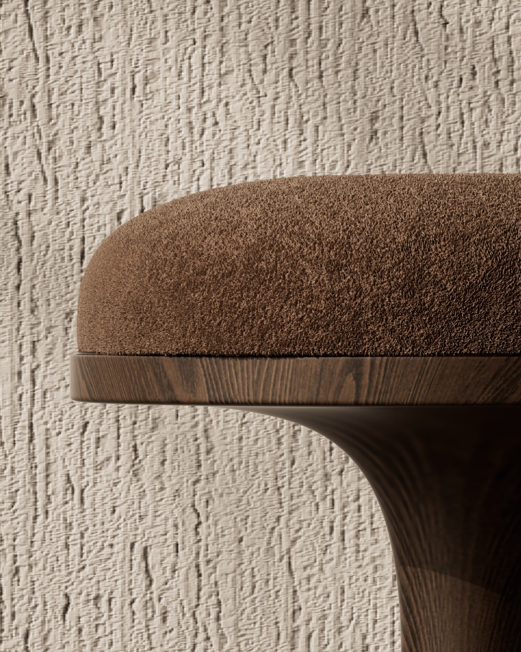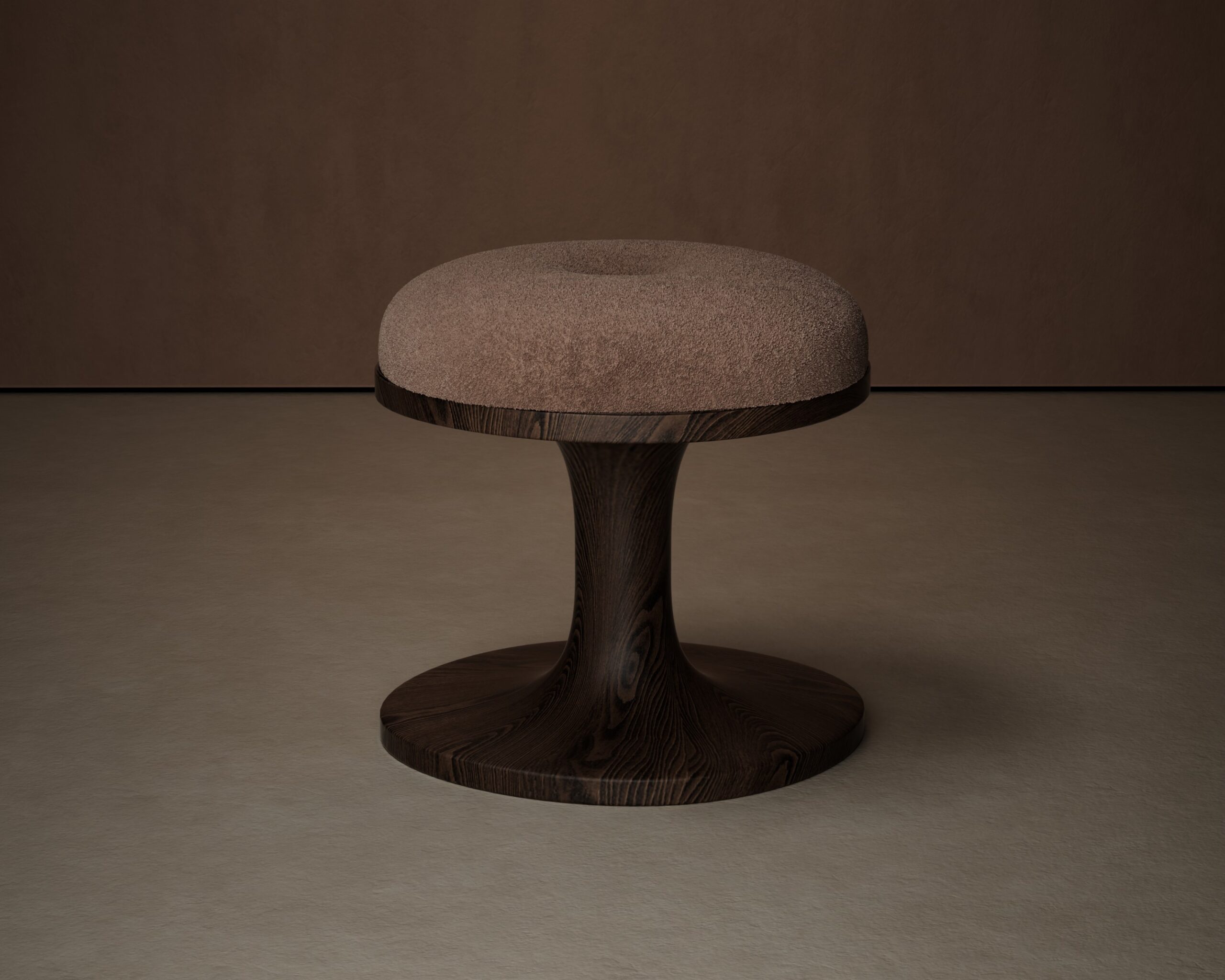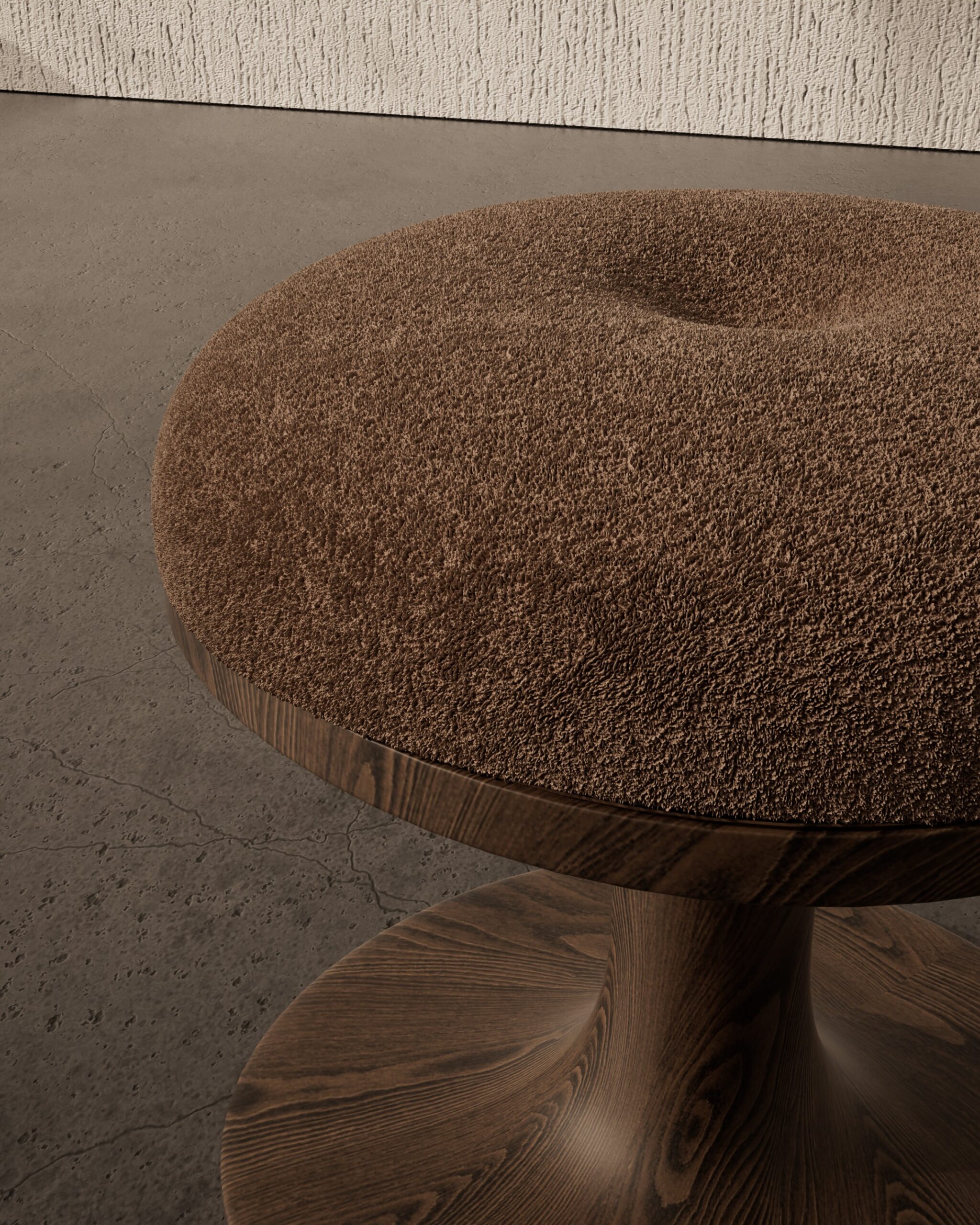 The MUSHROOM pouf is a study in organic symmetry and tactile warmth. Part of our Design Studio Collection, the piece is defined by its fluid, biomorphic silhouette that mimics the natural form of a forest fungi. The design features a generously rounded, domed seat upholstered in a textured sienna bouclé that offers a soft, inviting touch. This plush crown is supported by a singular, elegant pedestal hand-carved from solid deep walnut, which transitions seamlessly from a slender neck into a wide, stable circular base. The interplay between the architectural grain of the wood and the organic softness of the upholstery creates a playful yet sophisticated accent piece that brings a sense of grounded nature to modern interiors.