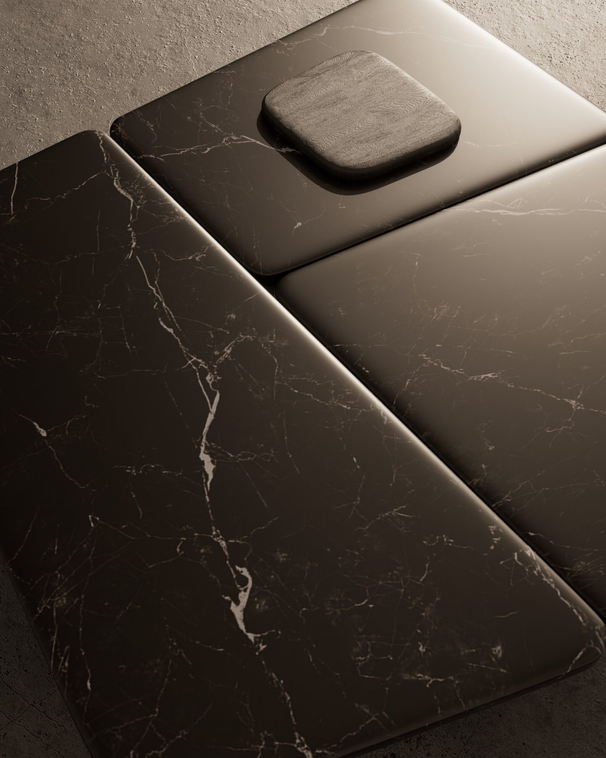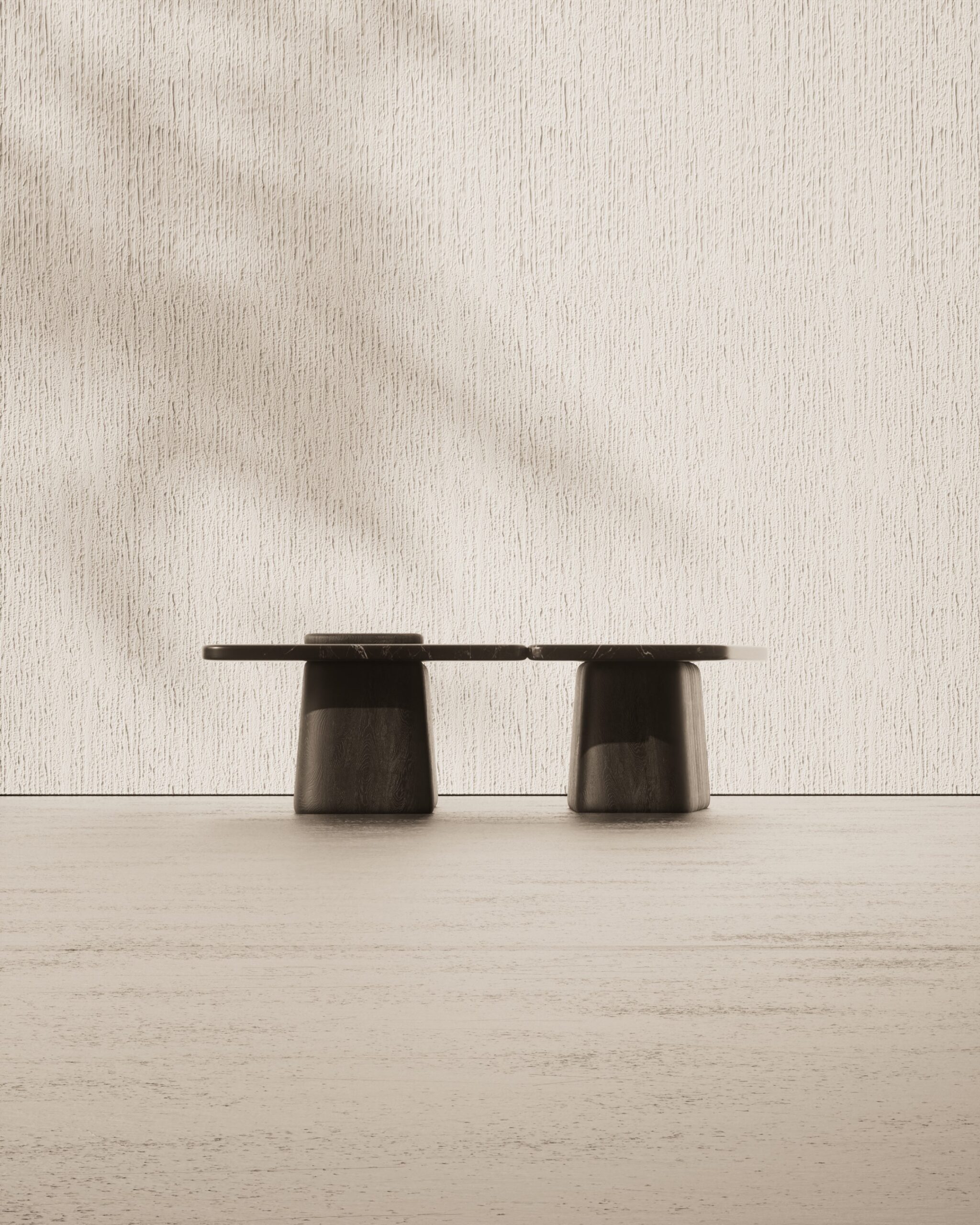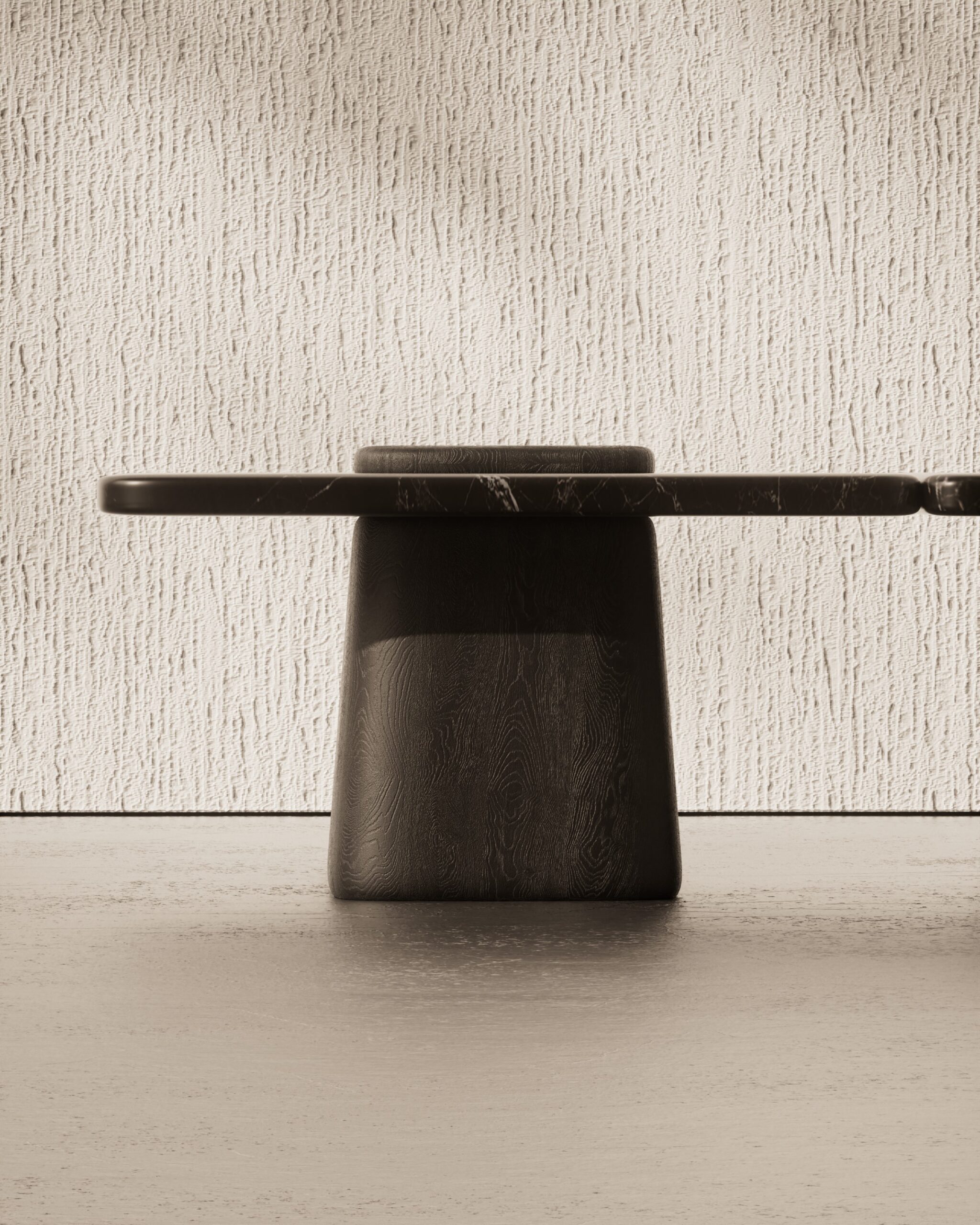The NERO center table is an exploration of primal craftsmanship and geological layering. Part of our Design Studio Collection, the piece is composed of independent, interlocking volumes hand-carved from solid wood and finished in a textured charcoal ash. The design is defined by its tactile, hand-chiseled “scalloped” exterior which creates a rhythmic, organic base for smooth, expansive surfaces of deep Nero marble. This interplay of light-absorbing wood textures and the polished, veined weight of the stone creates a commanding, architectural presence that serves as a grounded focal point for modern interiors.