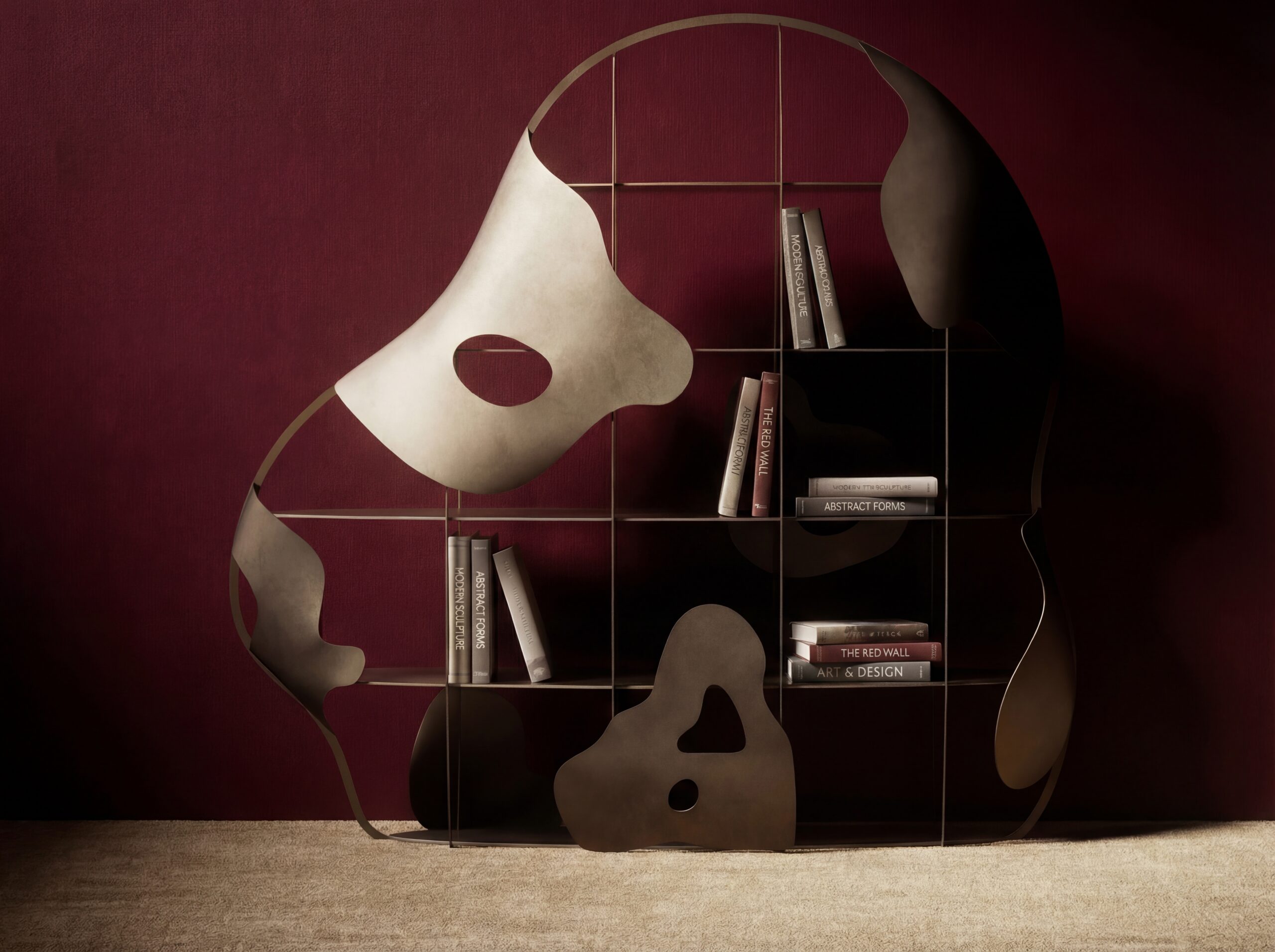 The NIMBUS bookshelf is a study in ethereal suspension and structural play. Part of our Design Studio Collection, this collectable piece reimagines functional storage as a celestial sculpture. The design is anchored by a large, circular silhouette containing a rigorous grid of horizontal and vertical metallic shelves. This geometric precision is intentionally disrupted by several asymmetrical, organic overlays in a warm, aged bronze finish. These fluid, “cloud-like” forms—some featuring circular apertures—appear to drift across the framework, partially obscuring the contents and creating a dynamic interplay of shadow and light. With its slender profile and dramatic scale, the NIMBUS serves as a sophisticated room divider or a focal gallery piece, balancing industrial rigidity with soft, dreamlike geometry.