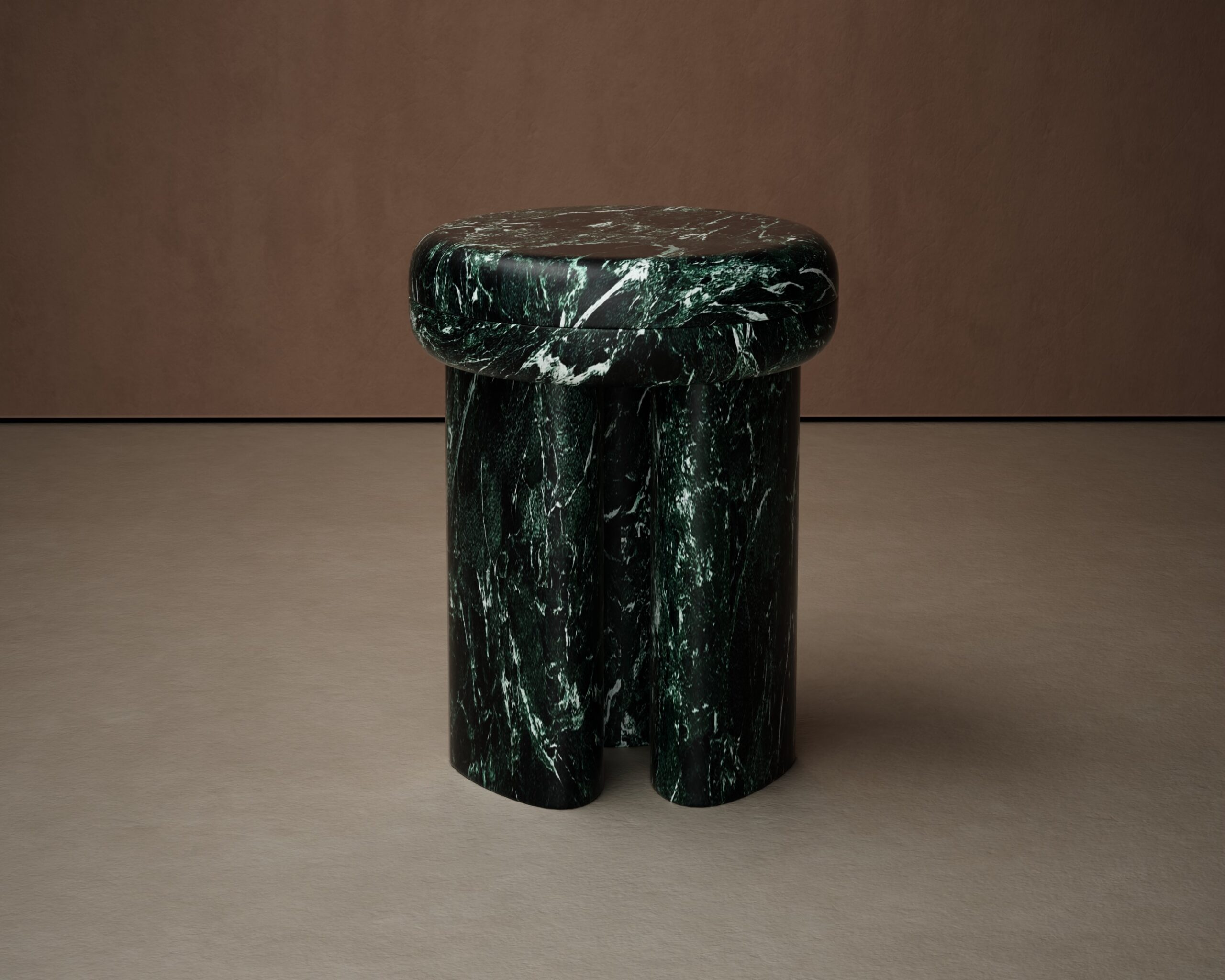 The NODUS side table is an exploration of tectonic weight and classical materiality. Part of our Design Studio Collection, the piece is crafted entirely from premium green marble, showcasing a dramatic landscape of high-contrast white veining that flows across every surface. The architectural narrative is defined by its substantial base, composed of three interlocking cylindrical columns that create a sense of permanent, grounded stability. These pillars support a thick, circular top with a softly radiused perimeter, creating a seamless and tactile transition between the horizontal and vertical planes. The NODUS balances the cold, monumental presence of natural stone with a fluid, organic silhouette, offering a sophisticated and timeless accent for contemporary lounge environments.
