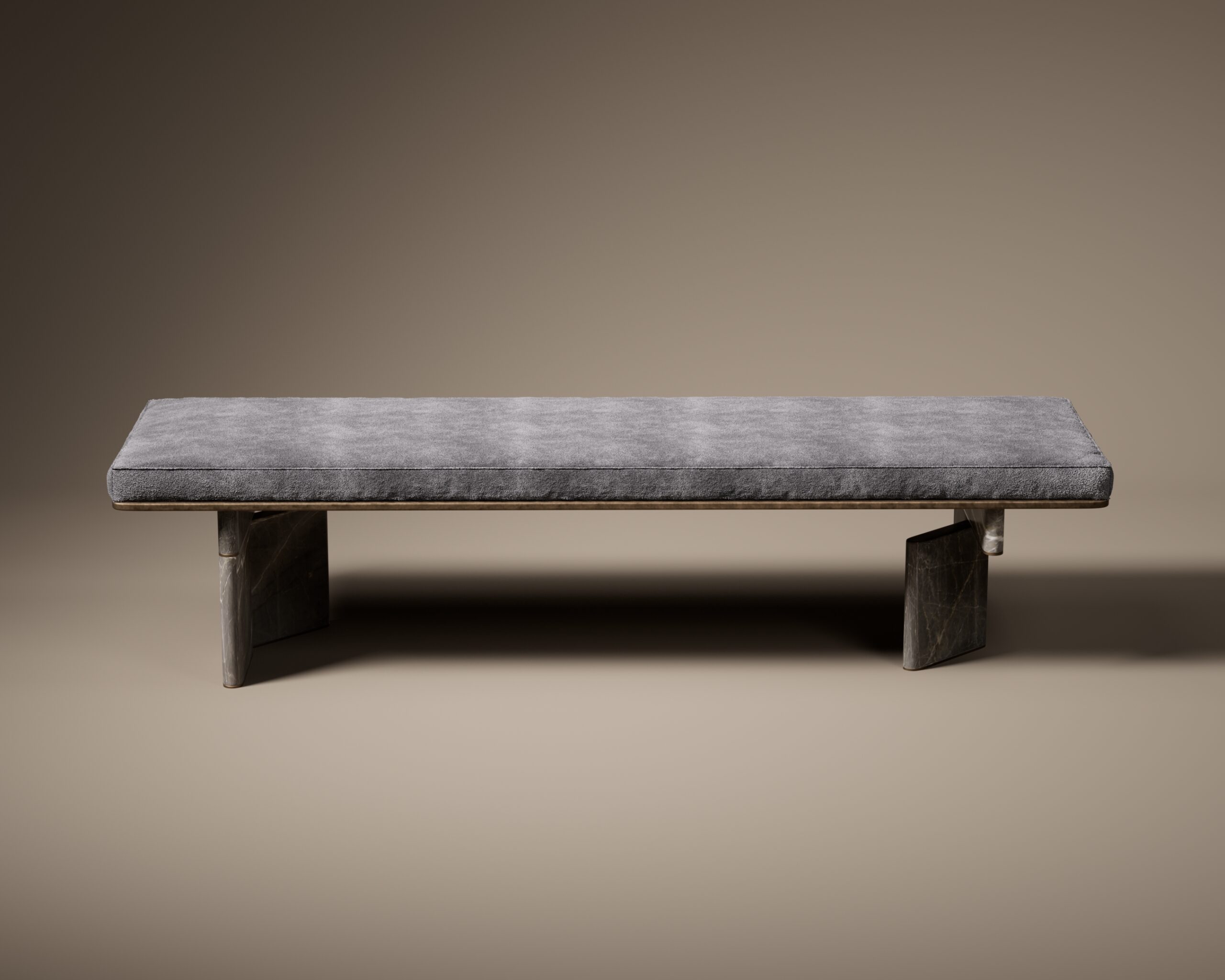 The ONYX bench is a moody masterpiece of architectural furniture, defined by its monochromatic palette and rigorous geometry. The design is anchored by two striking, cruciform legs crafted from solid black marble, featuring dramatic white veining that cuts through the darkness of the stone. Resting atop these heavy, sculptural pillars is a slim, rectangular seat upholstered in a deep charcoal textile with a soft, suede-like hand. A subtle ribbon of brushed bronze runs along the underside of the seat, creating a refined “waistline” that visually separates the plush comfort above from the rigid, monolithic stone below.
