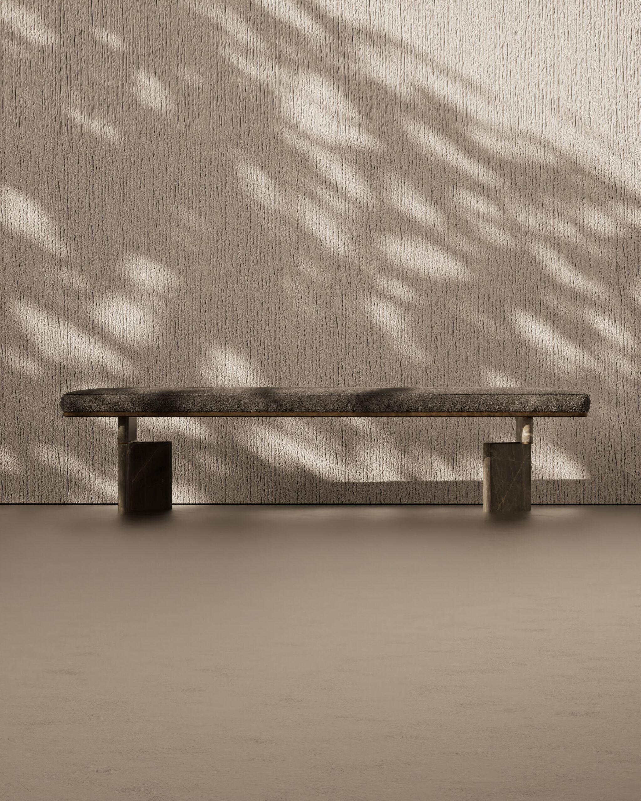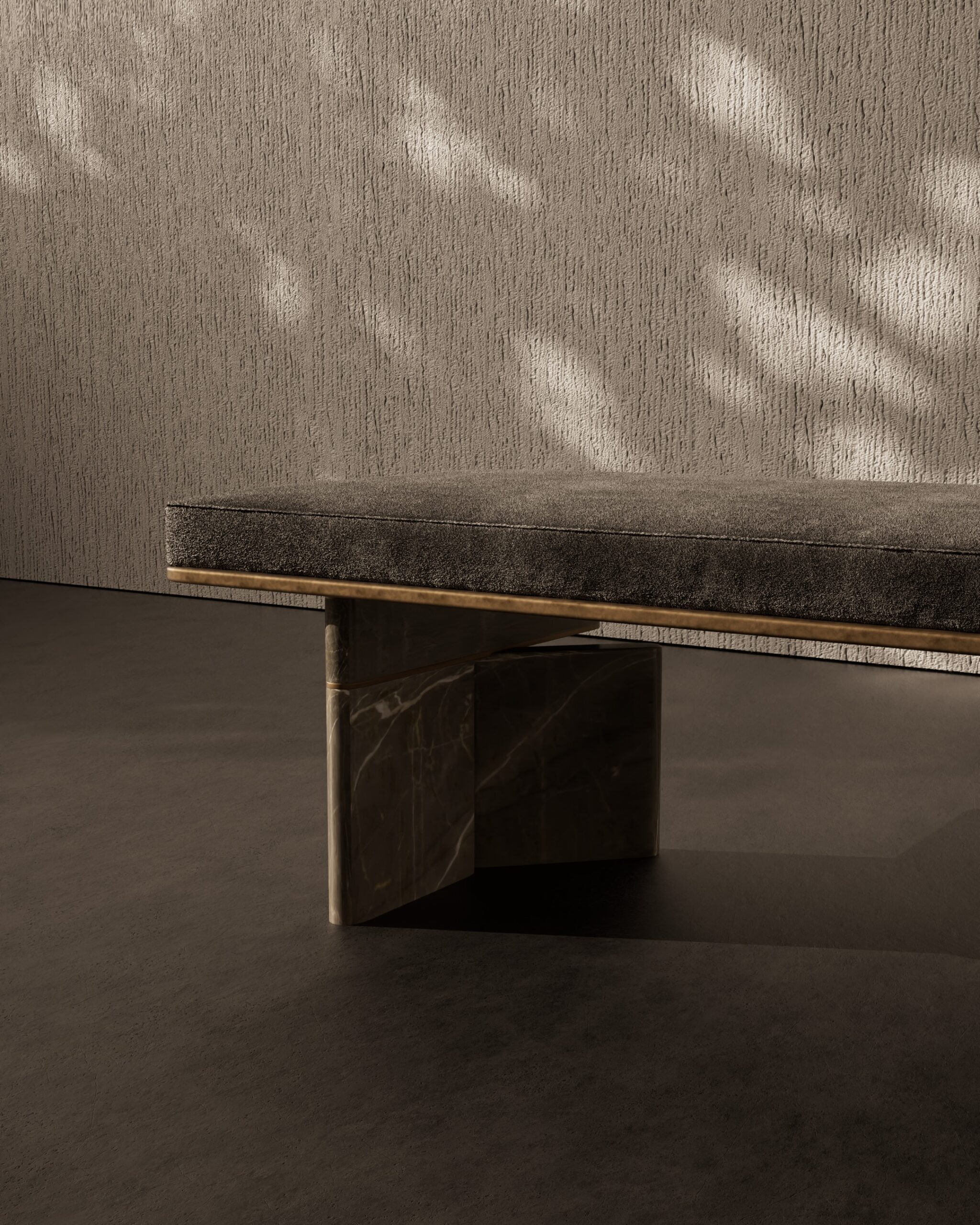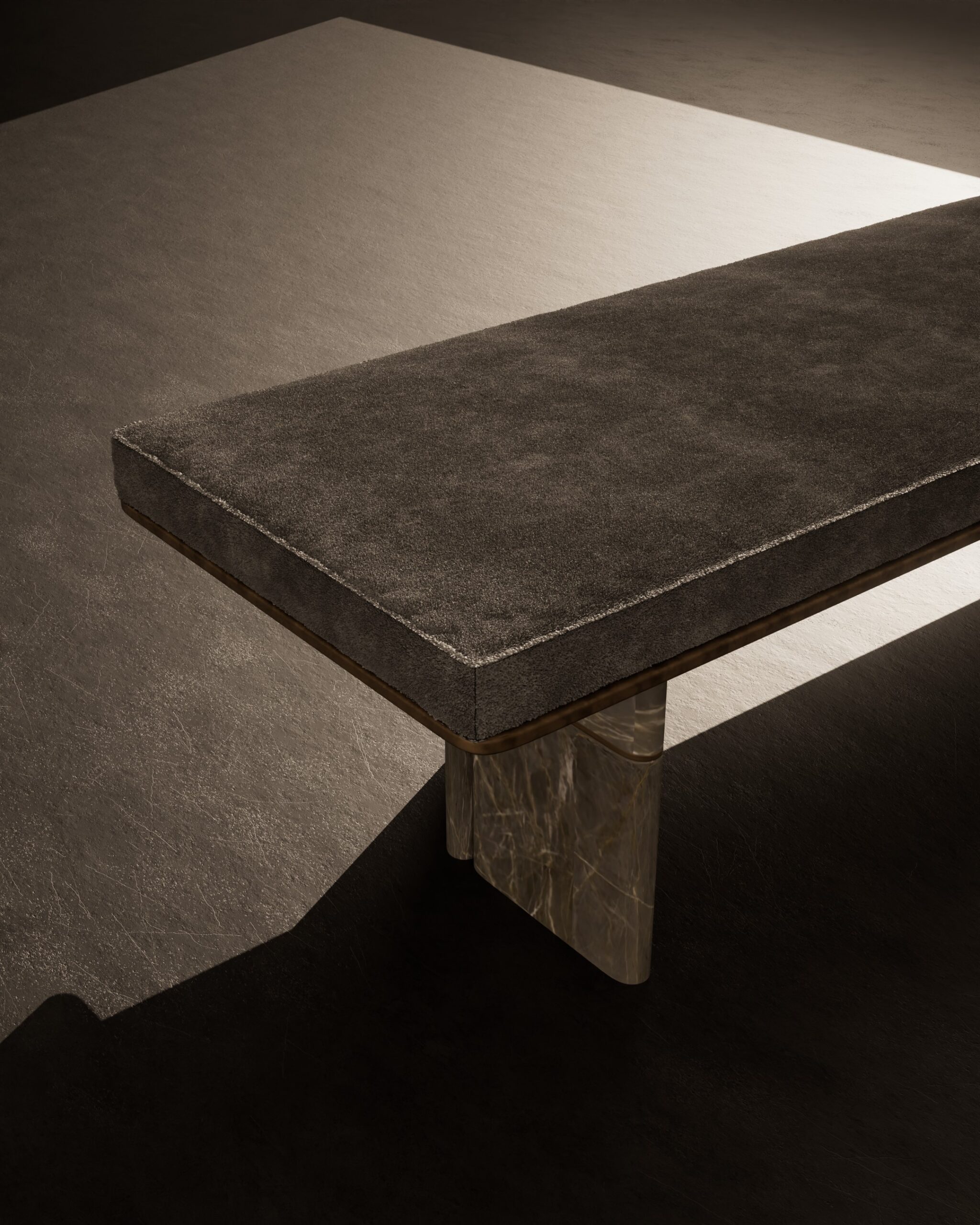 The ONYX bench is a moody masterpiece of architectural furniture, defined by its monochromatic palette and rigorous geometry. The design is anchored by two striking, cruciform legs crafted from solid black marble, featuring dramatic white veining that cuts through the darkness of the stone. Resting atop these heavy, sculptural pillars is a slim, rectangular seat upholstered in a deep charcoal textile with a soft, suede-like hand. A subtle ribbon of brushed bronze runs along the underside of the seat, creating a refined “waistline” that visually separates the plush comfort above from the rigid, monolithic stone below.