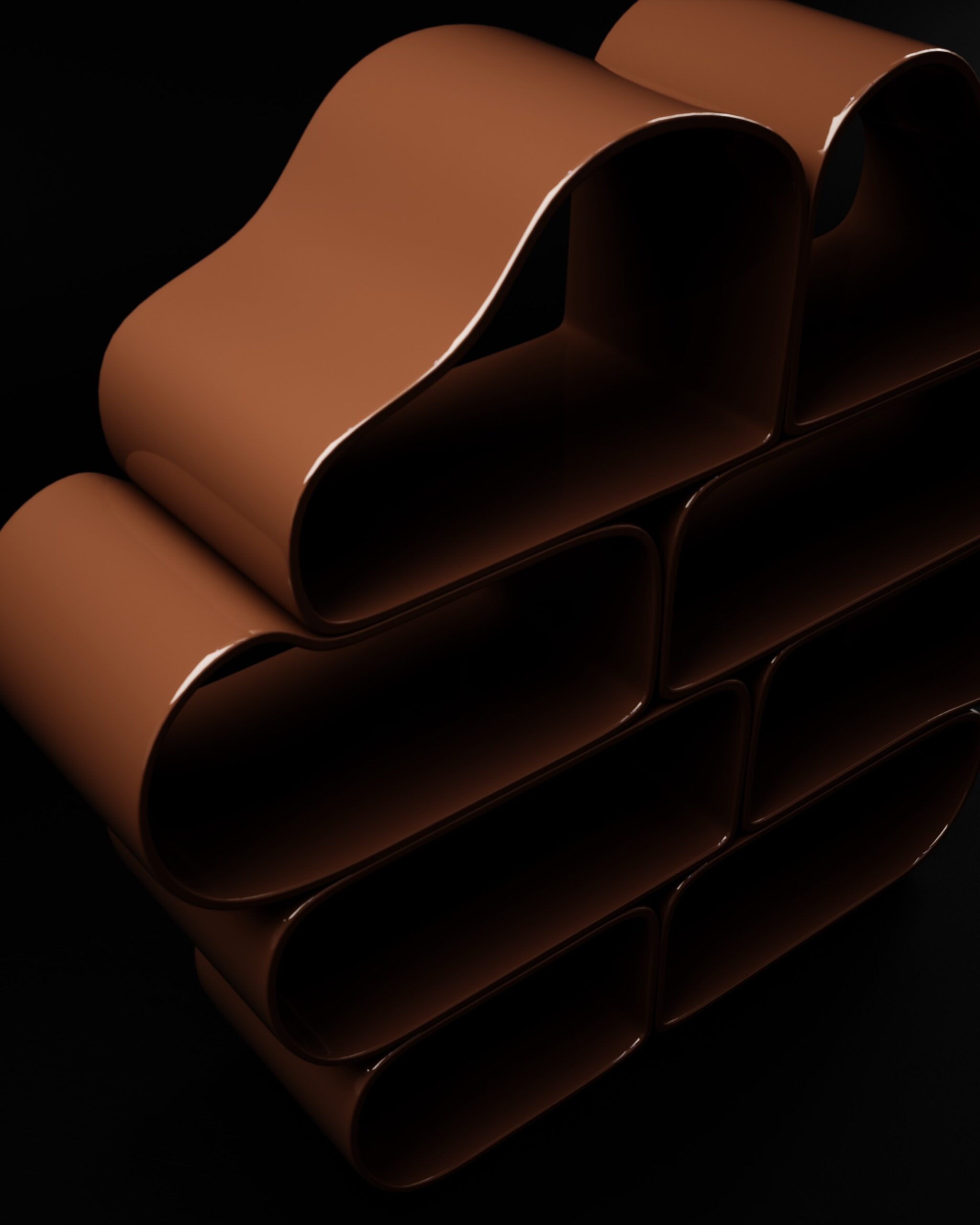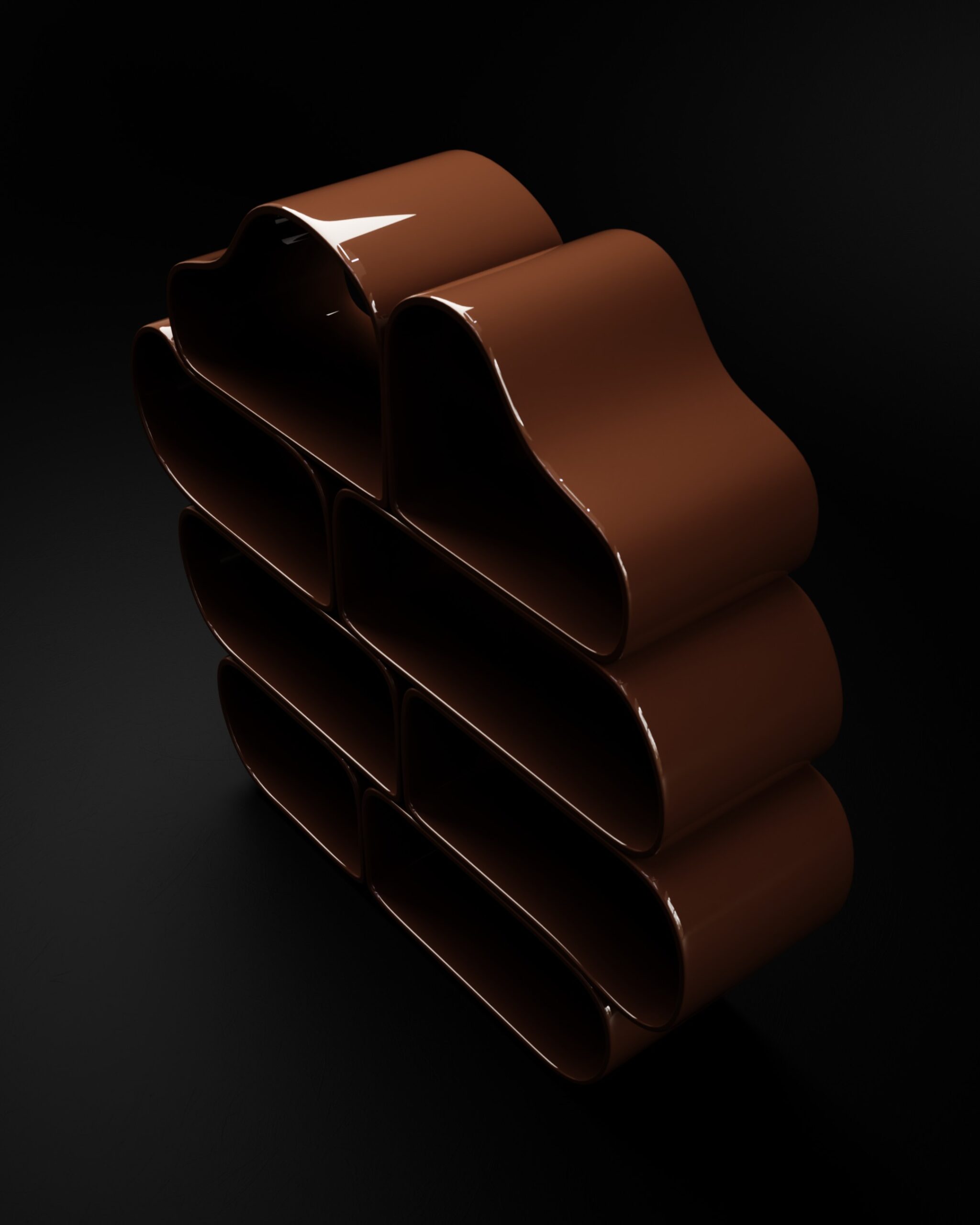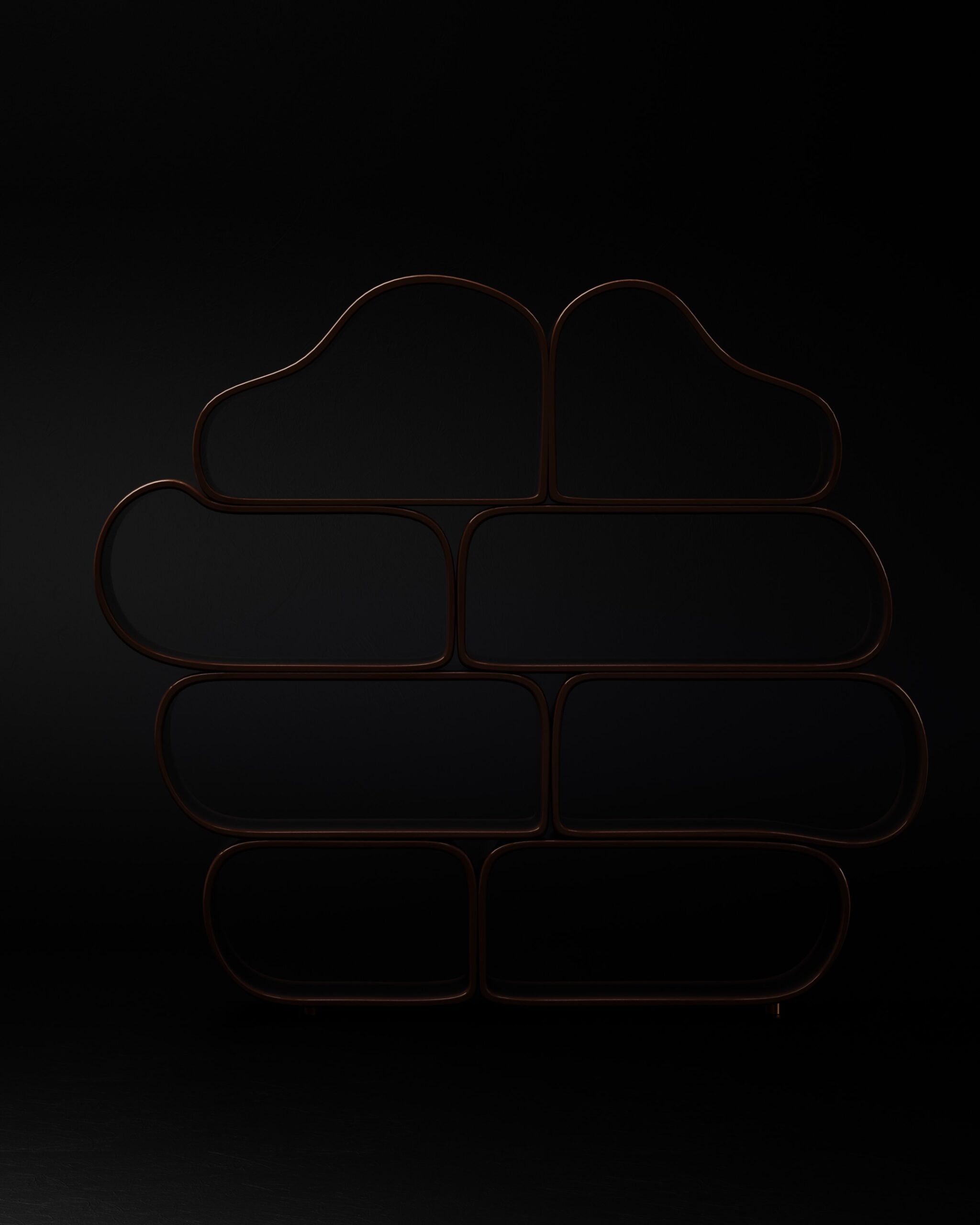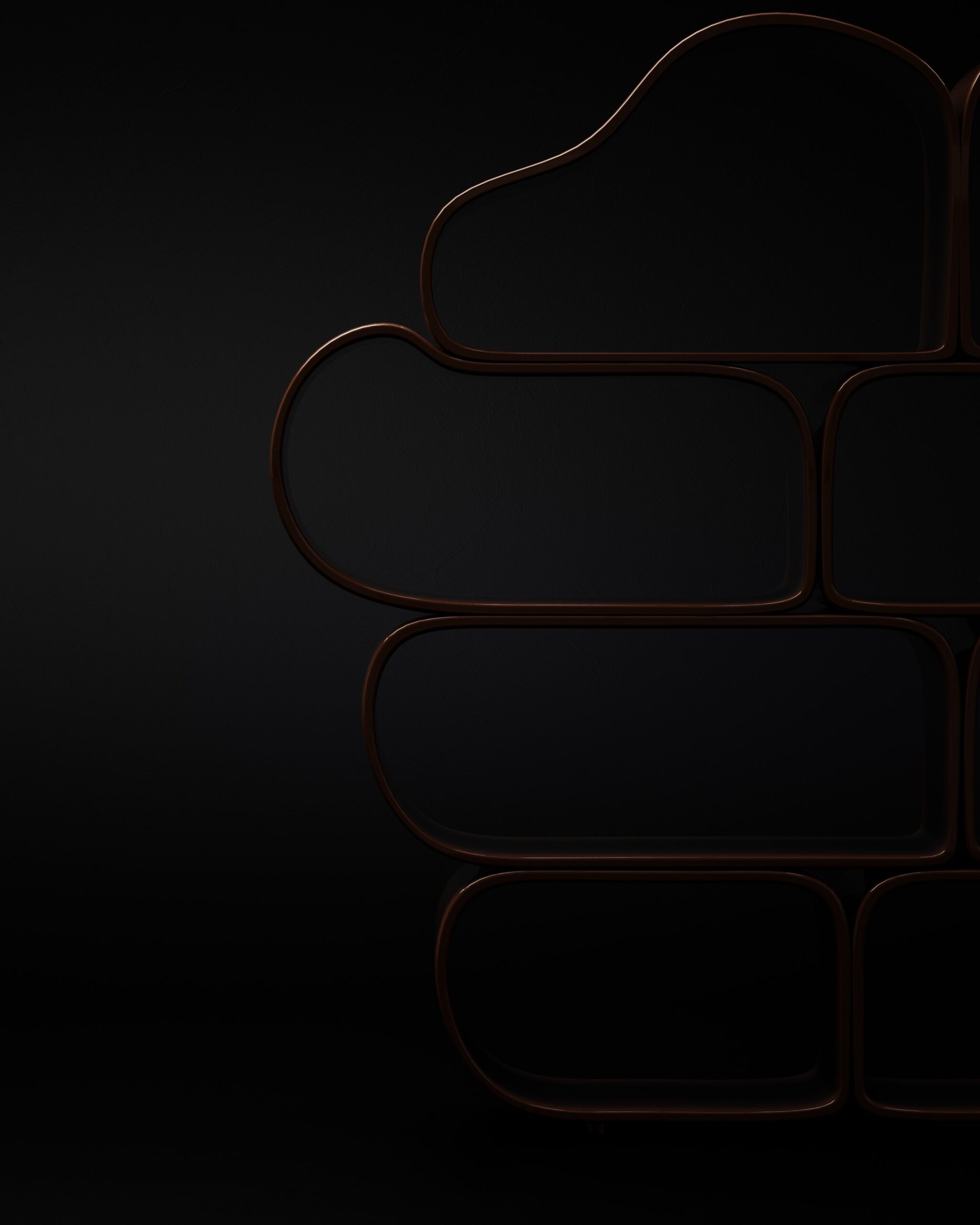 The OVALIS bookshelf is an exploration of repetitive geometry and soft-volume storage. Part of our Design Studio Collection, the piece is composed of several interlocking, pill-shaped modules that create a rhythmic, stacked silhouette. Finished in a deep, high-gloss chocolate lacquer, the surface reflects light across its continuous curves, emphasizing the fluid transitions between the vertical and horizontal planes. The asymmetrical arrangement of the rounded cells creates an organic “cloud” profile, offering a playful yet sophisticated organizational grid for contemporary libraries or as a standalone sculptural divider.