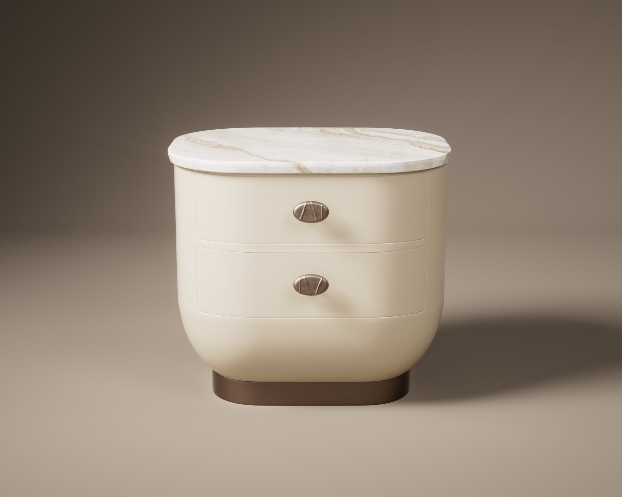 The PILLAR bedside table is a study in monolithic softness and material layering. It features a substantial, matte cream body with a continuous, curved base that transitions into a recessed antique bronze plinth. The design is crowned with a polished beige marble top, set flush within the frame to highlight the intersection of cool stone and warm lacquer. Two deep drawers are punctuated by textured, coin-style bronze pulls, providing a tactile, artisanal finish to the clean, architectural form.