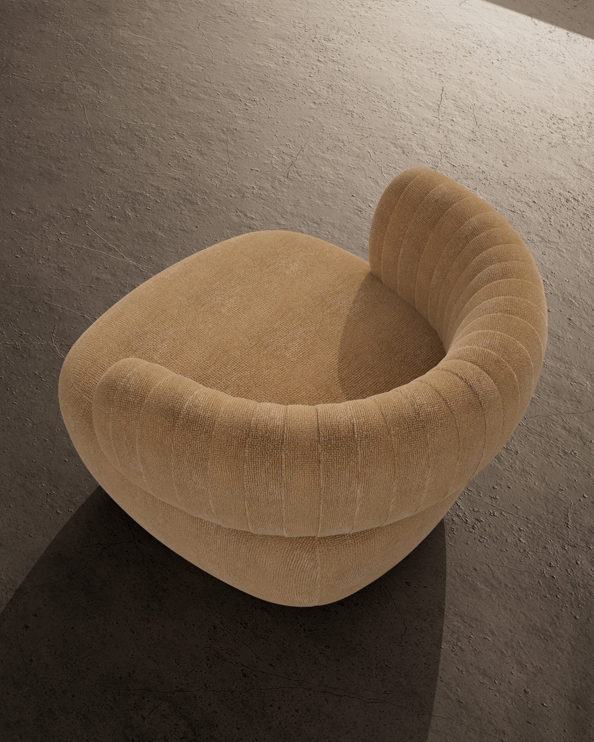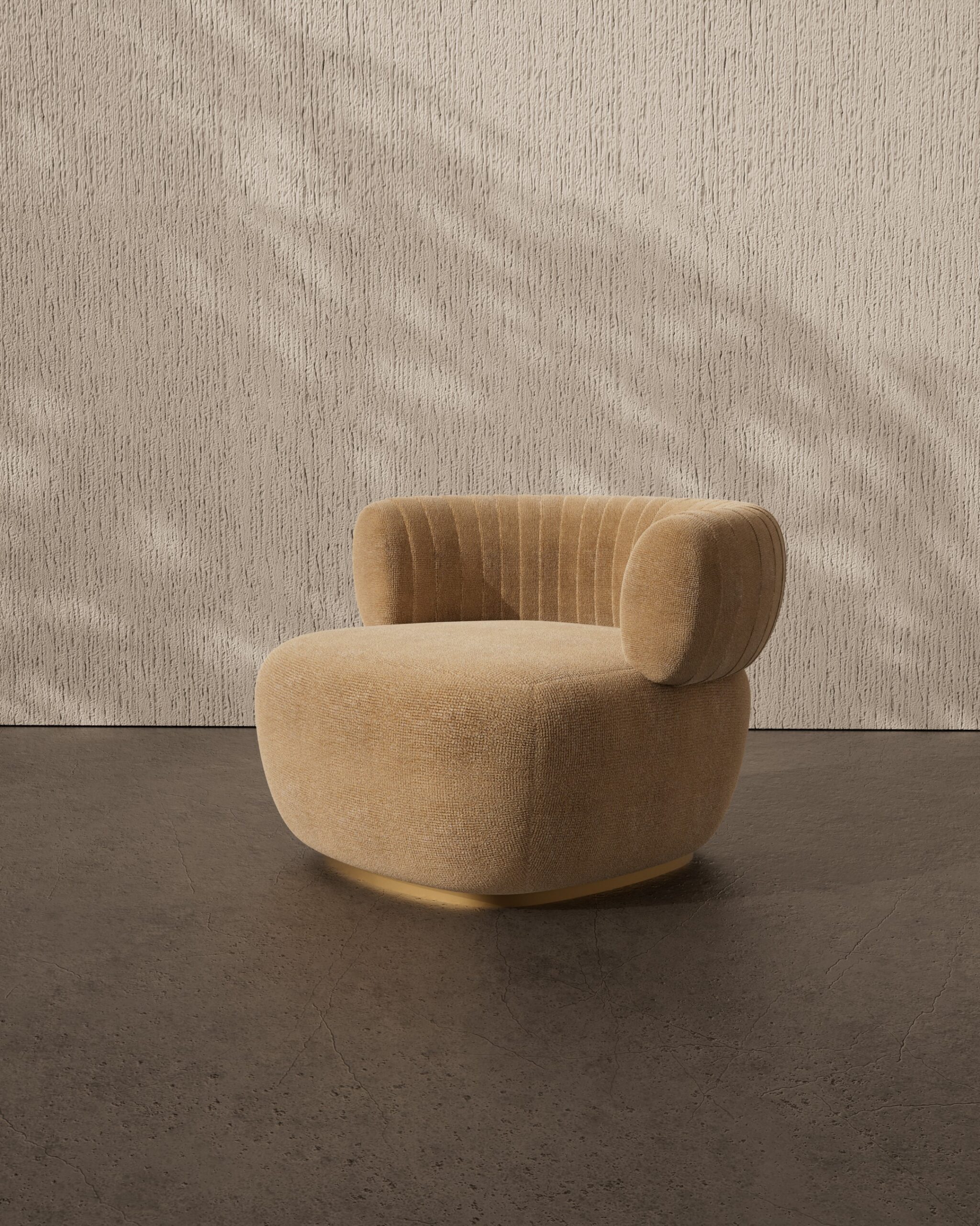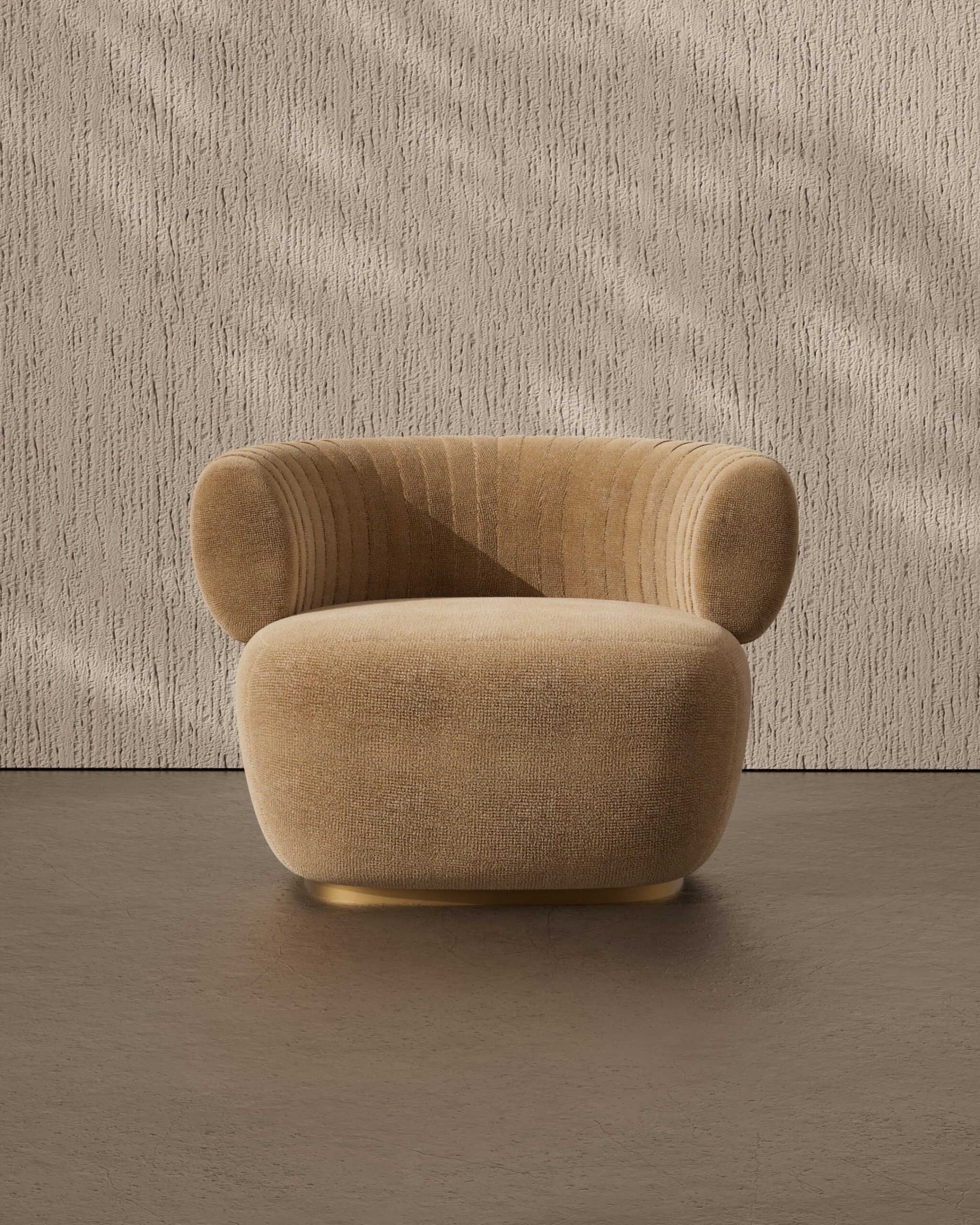 The PIPE armchair is a luxurious study in rhythm and texture. Its defining feature is the deep vertical channel tufting that wraps around the entire back and armrest, creating a ribbed, pipe-like structure that gives the chair its name. Upholstered in a lustrous beige velvet that catches the light on its curves, the organic, rounded form rests on a subtle gold plinth base, adding a final touch of grounded glamour.