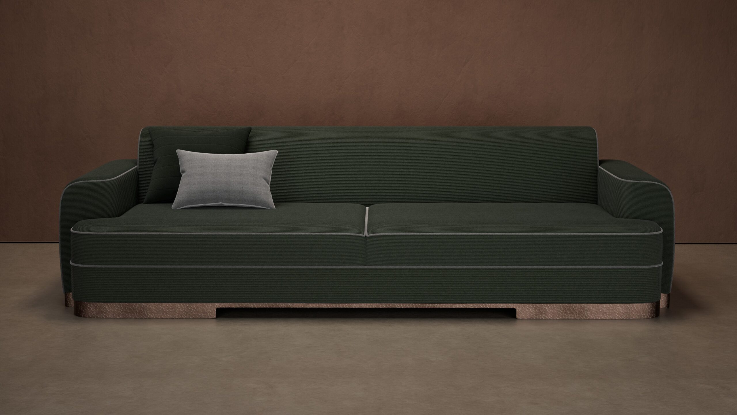 The PIPERIO exudes a dark, sophisticated glamour. Wrapped in a luxurious, deep charcoal velvet that absorbs light to create a moody ambiance, its clean, modern silhouette features gently curved arms that soften the rectangular form. The design is grounded by a stunning hammered brass plinth base, adding a flash of artisanal metallic texture that elevates the piece from simple seating to a work of art.