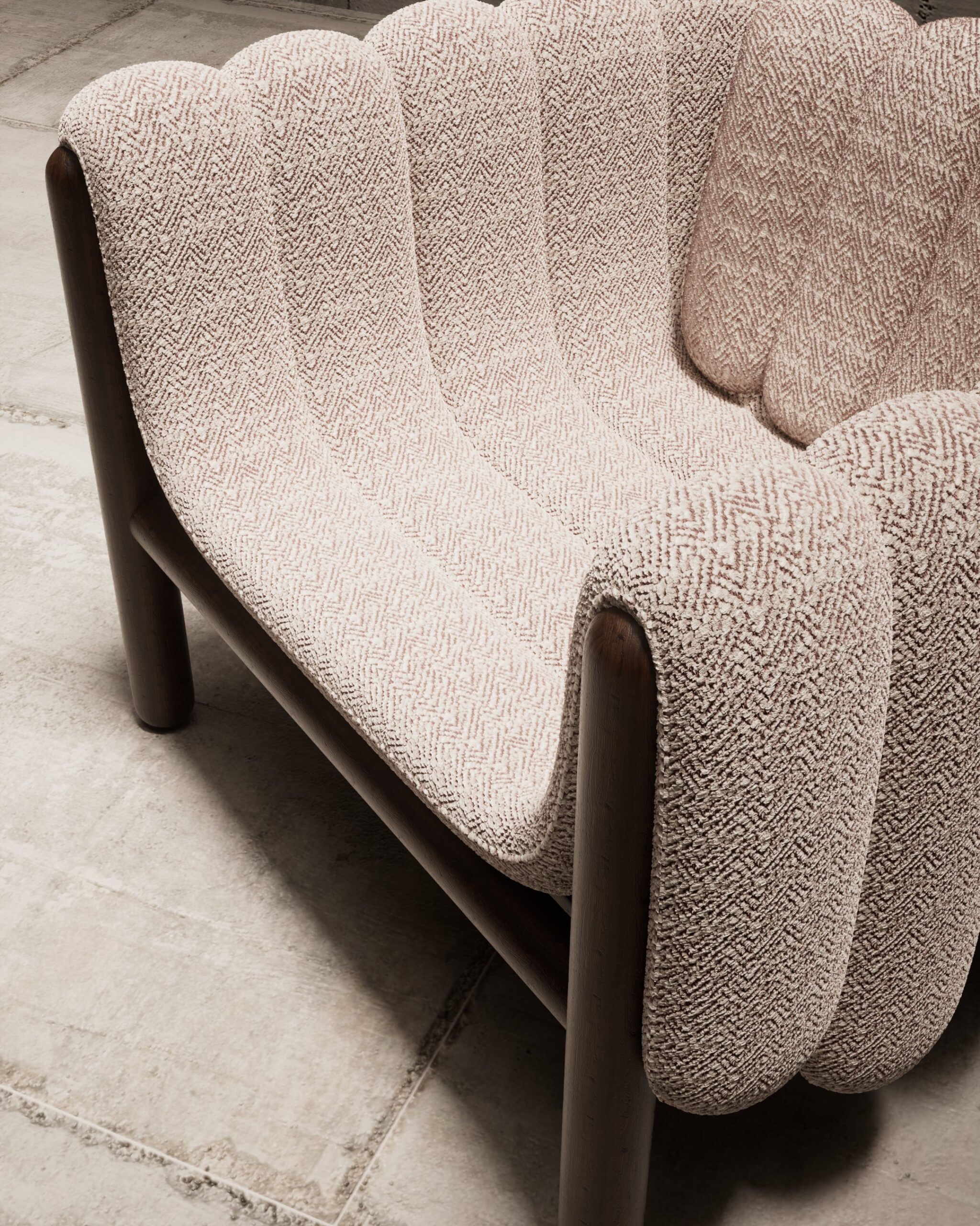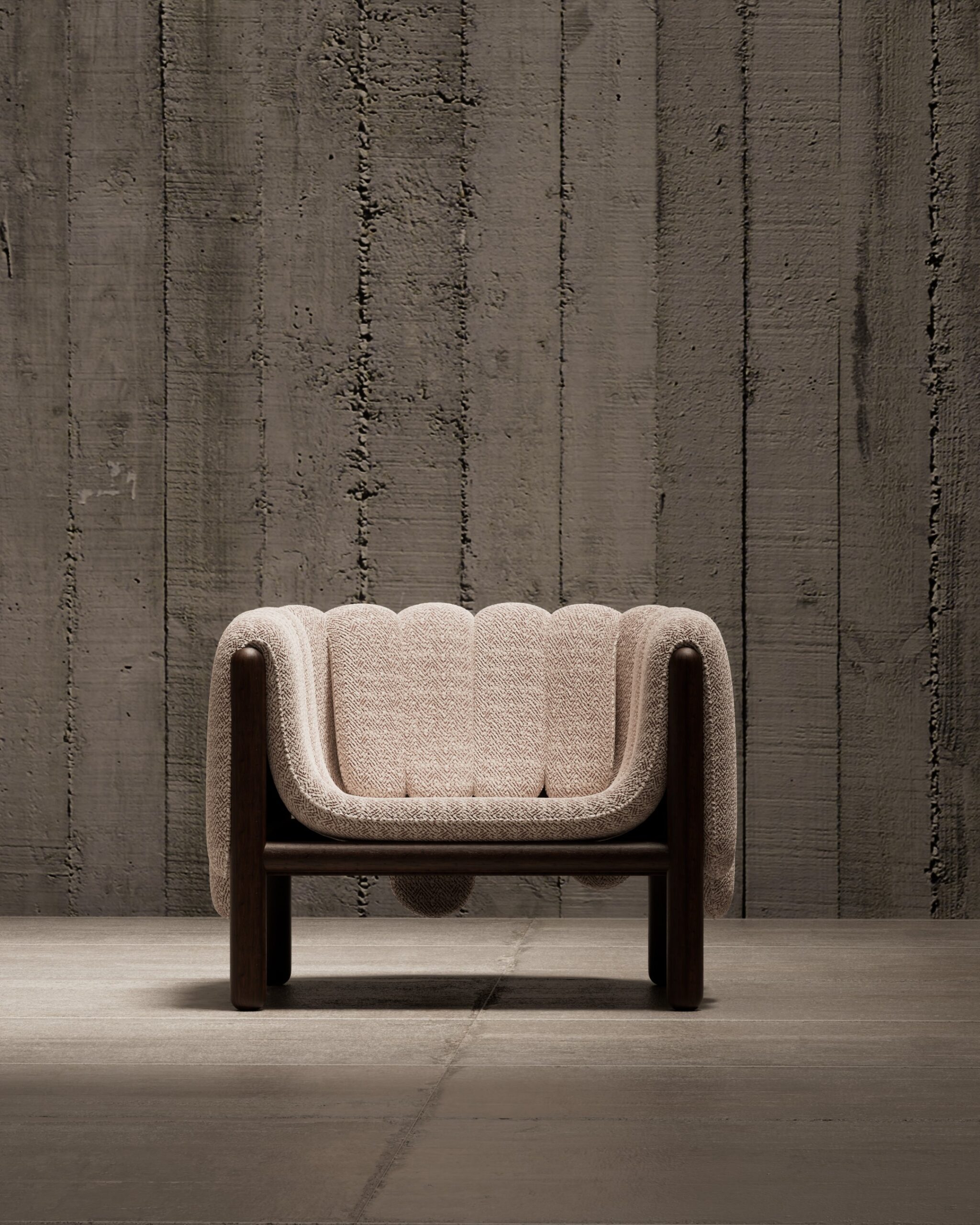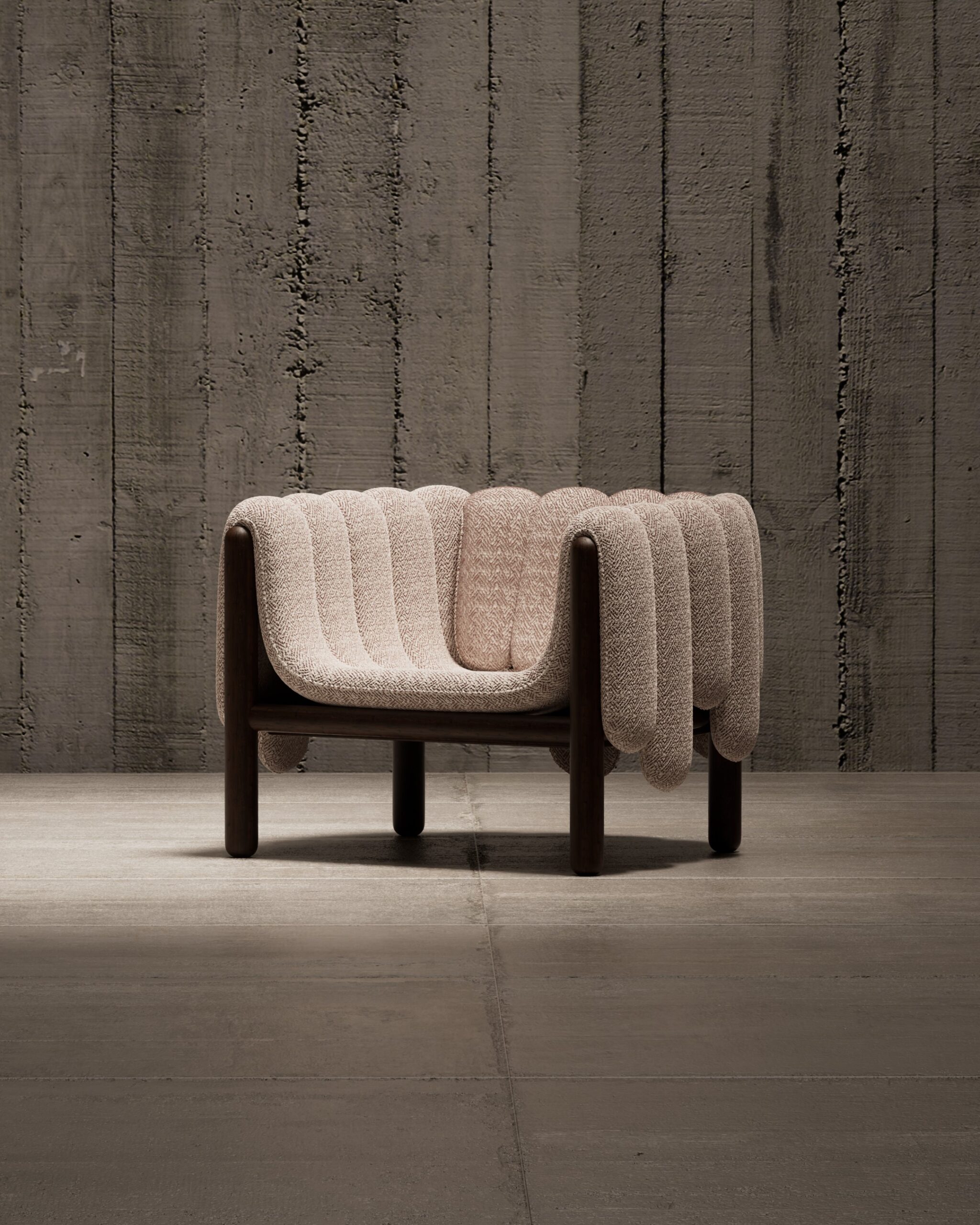 The PIPERO armchair is a playful yet sophisticated study in volume and structure. Its defining feature is the plush, vertically segmented upholstery that appears to drape effortlessly over the sturdy dark wood frame like a heavy blanket. The tactile, woven fabric adds depth and warmth, creating a cozy, inviting nest that contrasts beautifully with the clean, cylindrical lines of the exposed timber base.