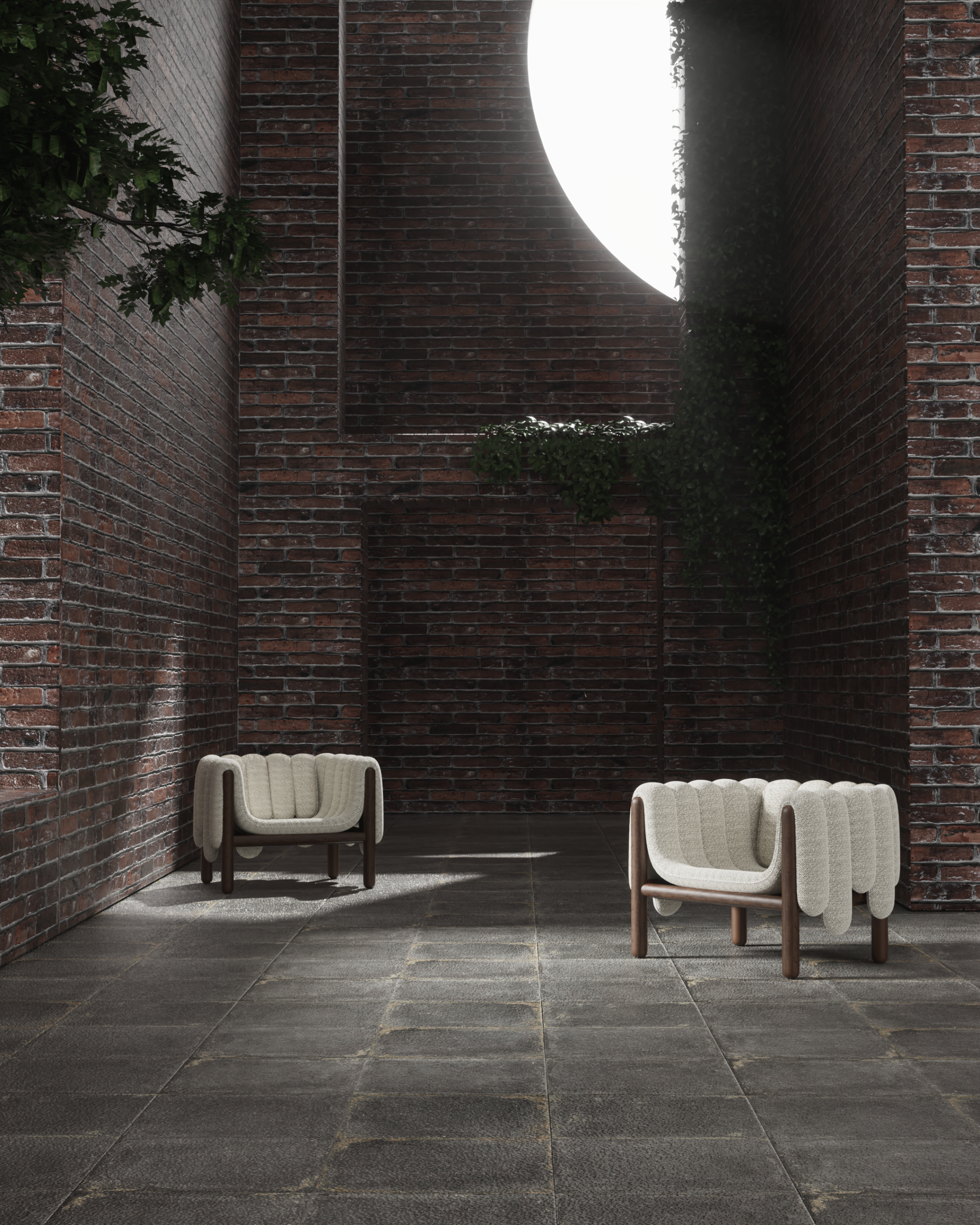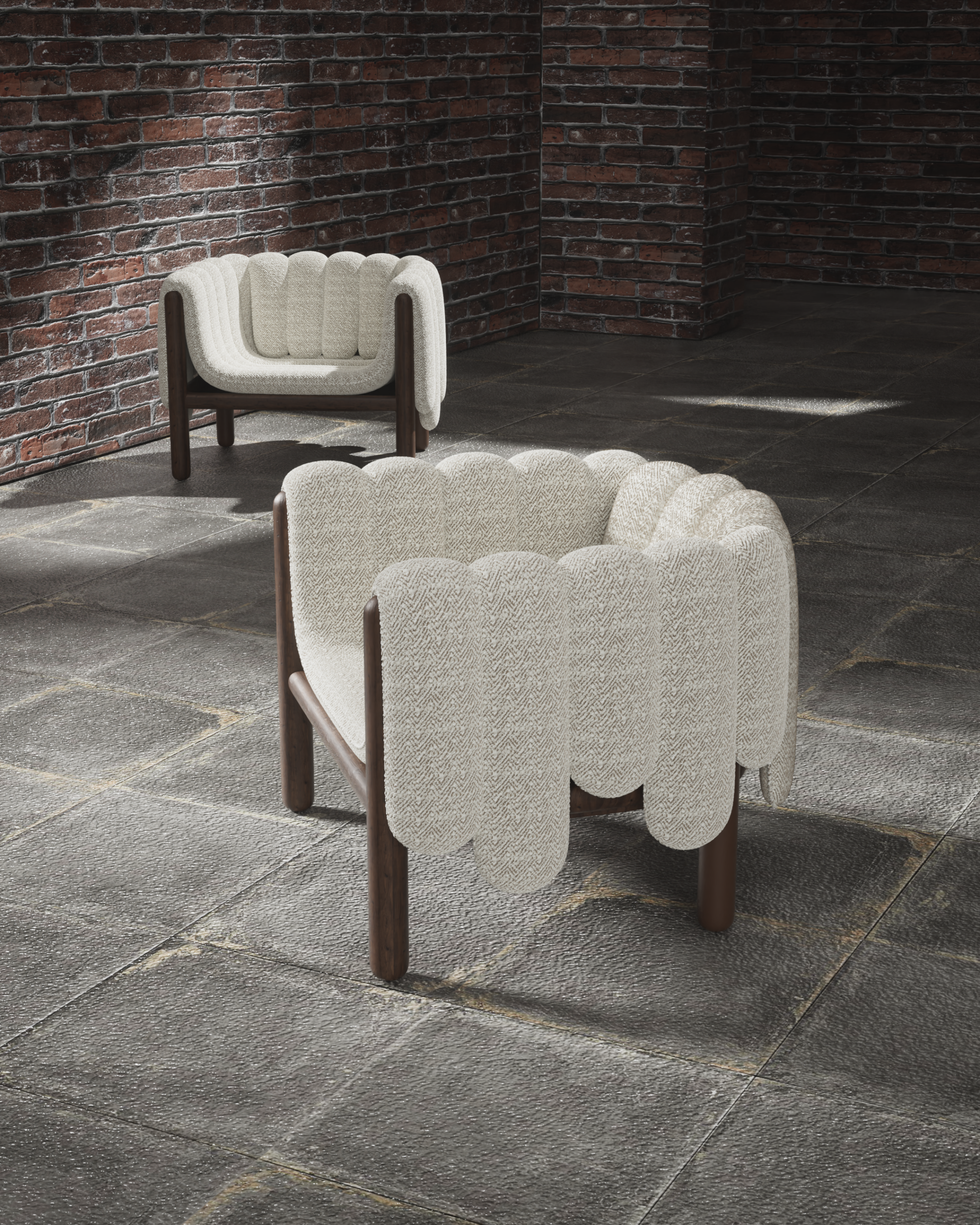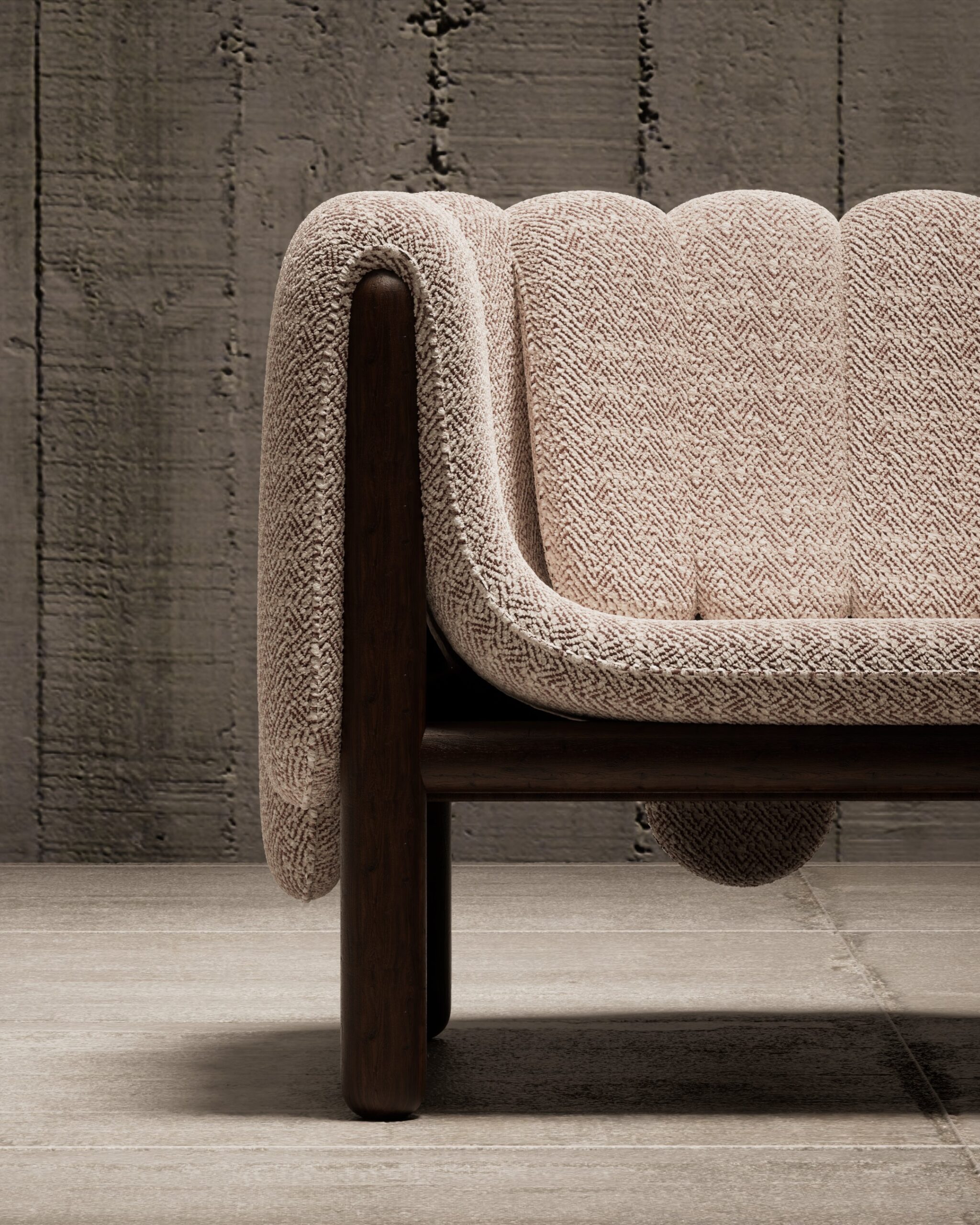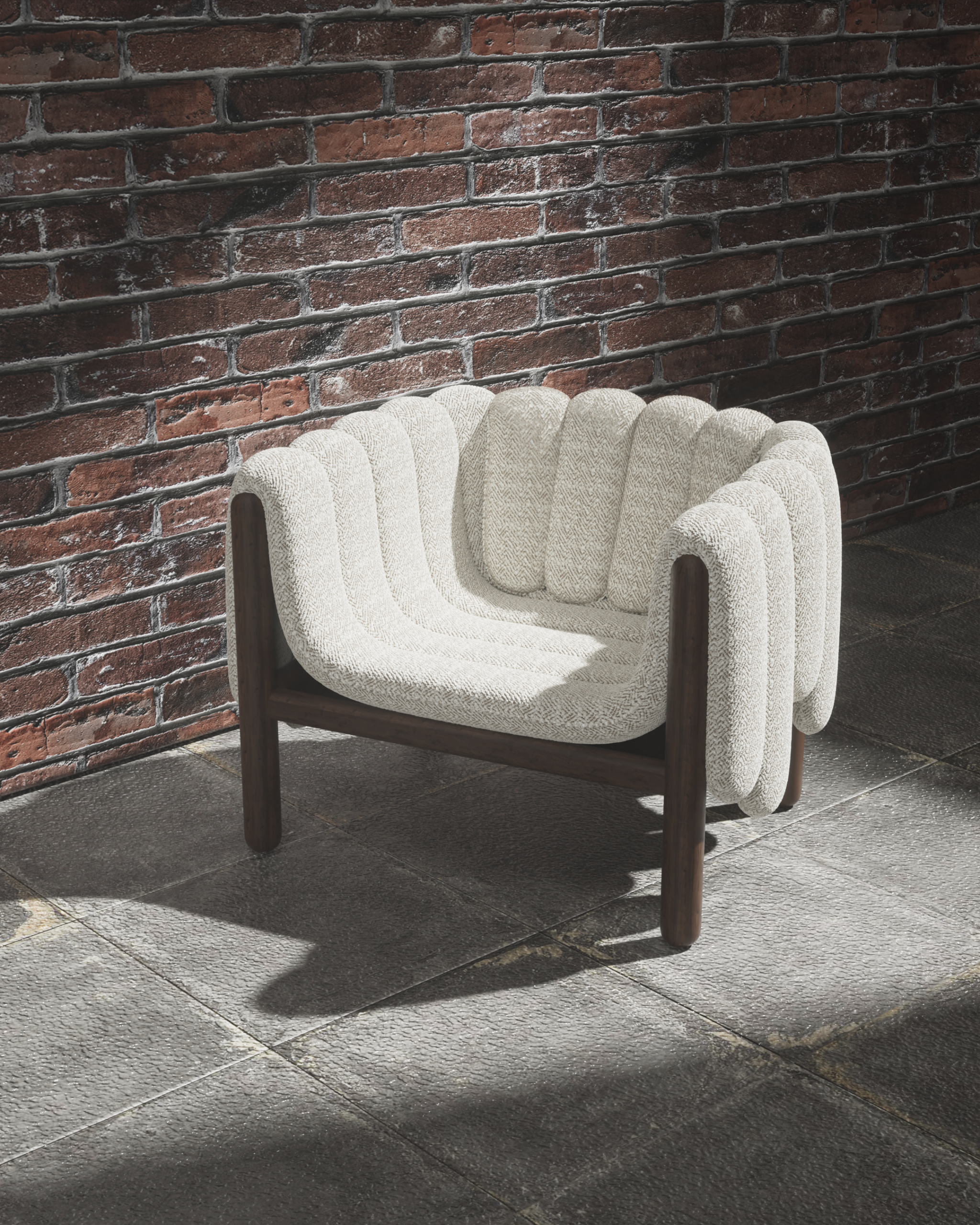 The PIPERO armchair is a playful yet sophisticated study in volume and structure. Its defining feature is the plush, vertically segmented upholstery that appears to drape effortlessly over the sturdy dark wood frame like a heavy blanket. The tactile, woven fabric adds depth and warmth, creating a cozy, inviting nest that contrasts beautifully with the clean, cylindrical lines of the exposed timber base.