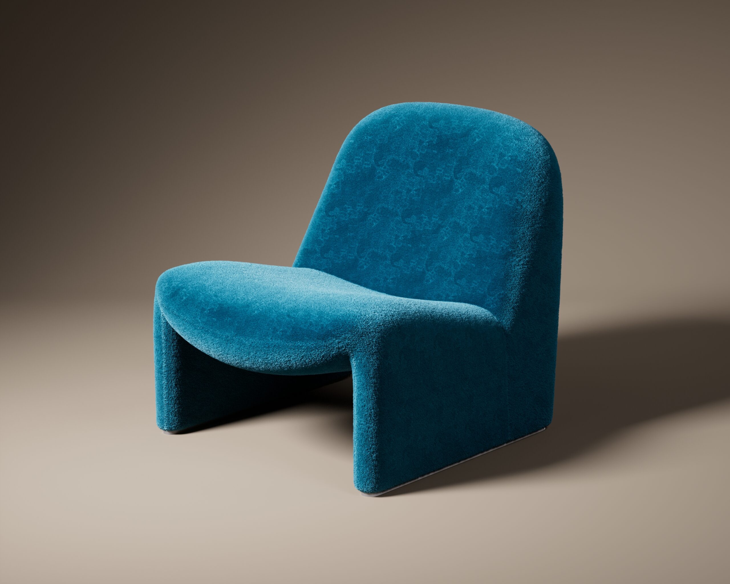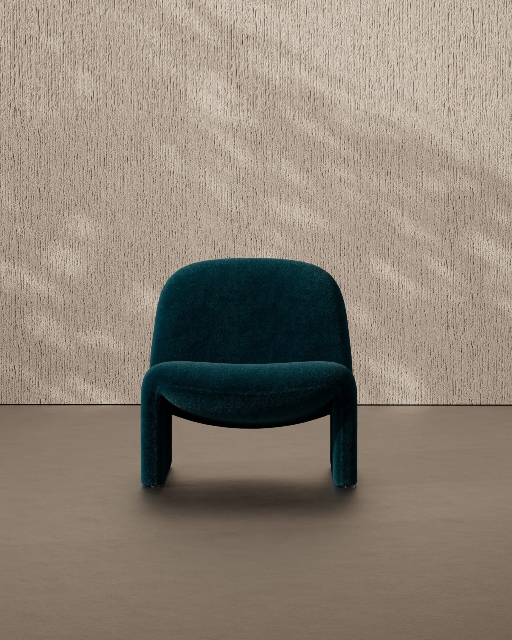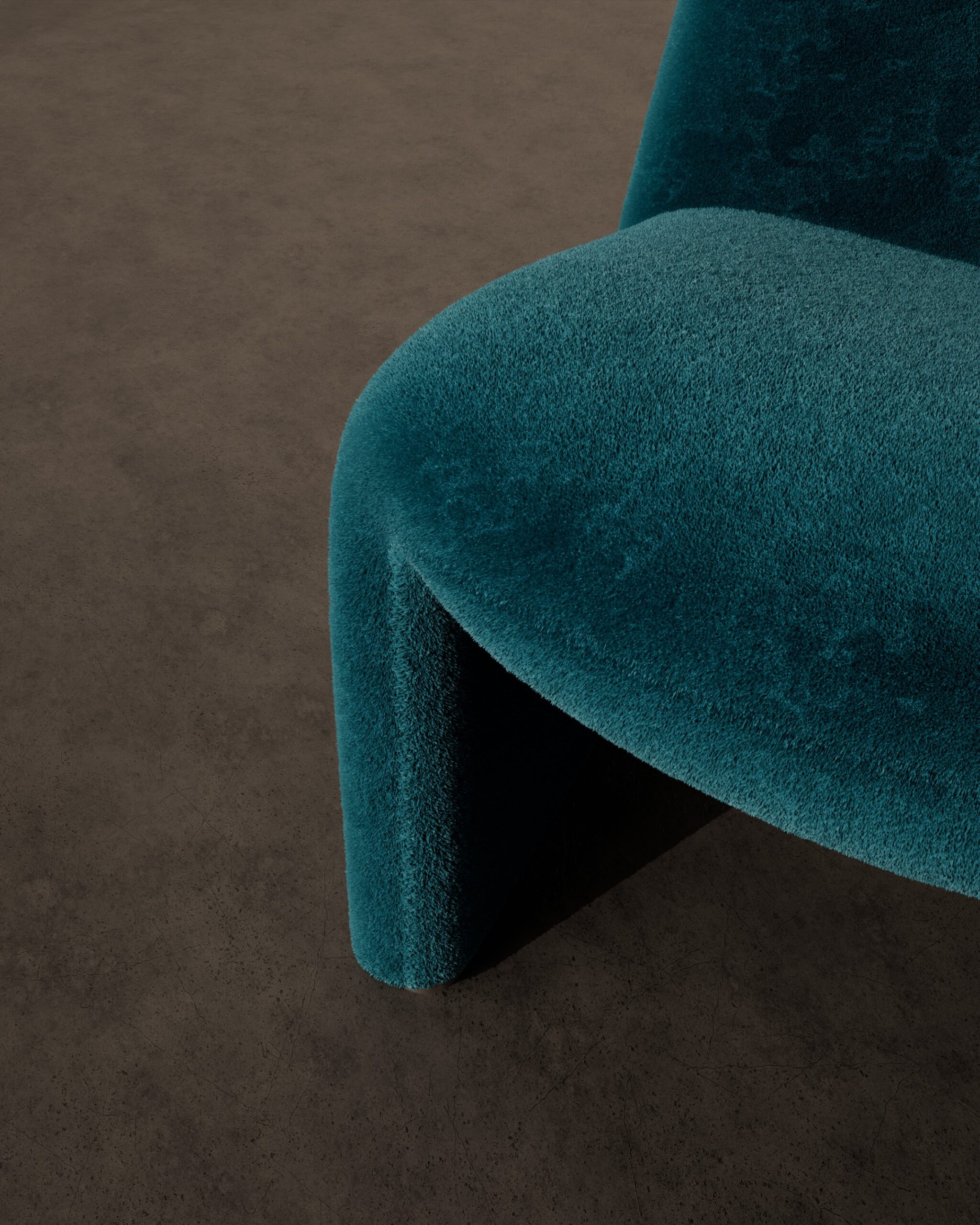 Continuous “folded ribbon” silhouette, seamless fully-upholstered frame, organic monolithic form
