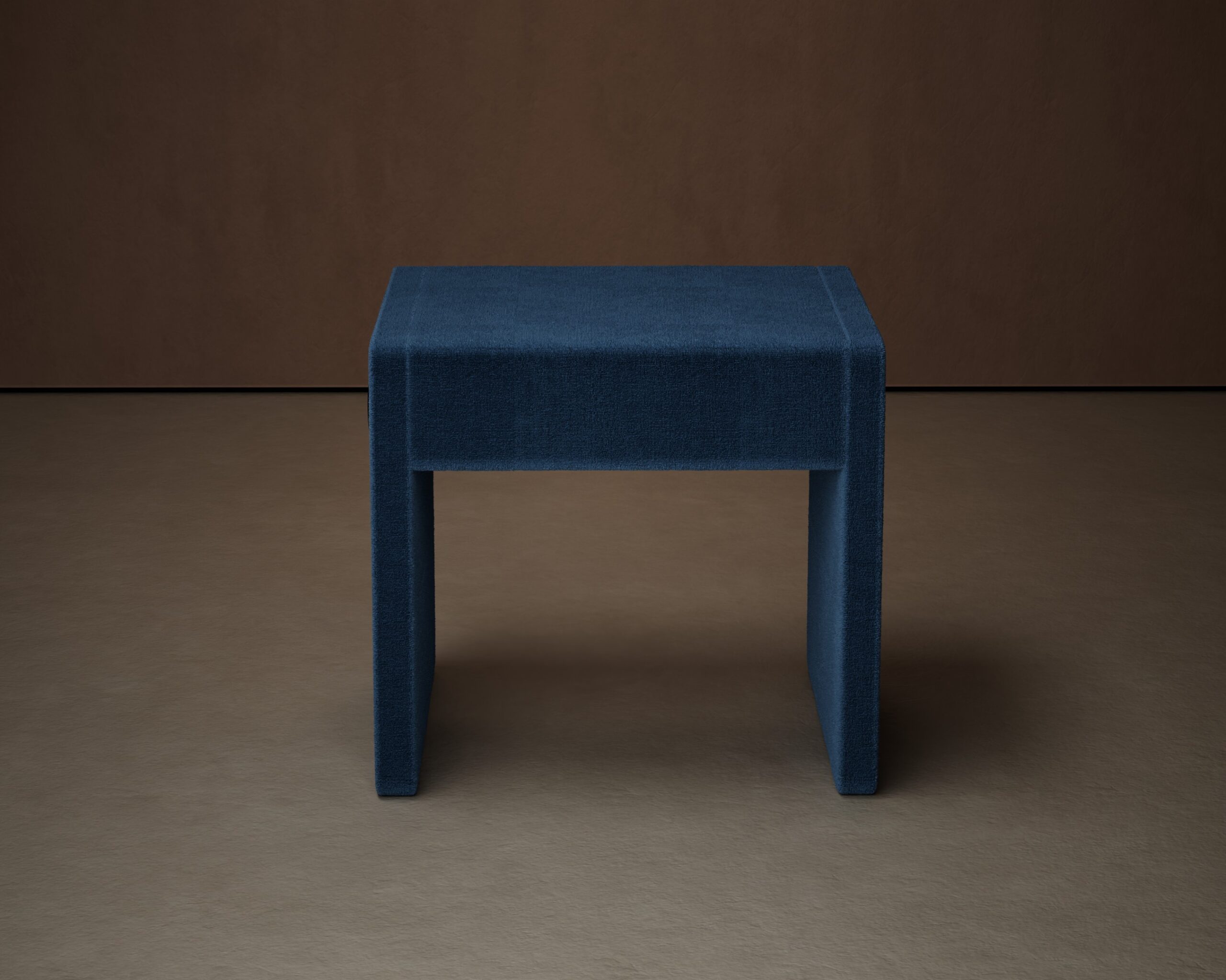 The PORTAL pouf is a study in architectural geometry and monolithic softness. Part of our Design Studio Collection, the piece features a bold, U-shaped silhouette that mimics the structural clarity of a bridge or a portal. Completely upholstered in a vibrant, deep ocean blue textured textile, the design balances its rigid, angular form with a soft, inviting tactile quality. The wide, planar supports provide a sense of grounded stability, while two recessed metallic circular accents on the side panels offer a refined, industrial touch. This interplay of heavy suspension and plush materiality creates a versatile sculptural accent that serves as both a functional seat and a striking visual anchor in contemporary spaces.