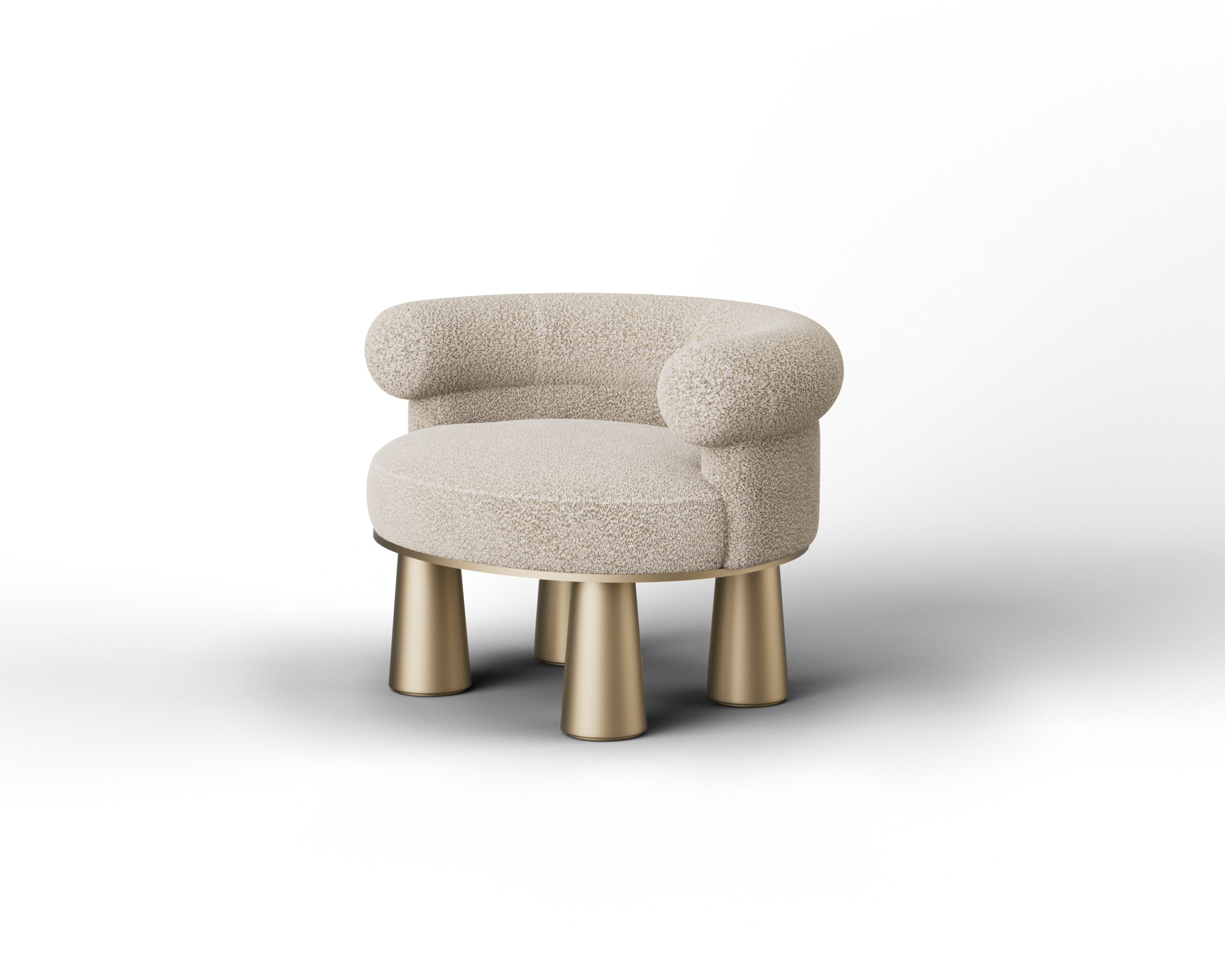The PUFF armchair is a study in volumetric soft-minimalism and playful architectural scale. As a standout piece in our Luxury Collection, it reimagines functional seating as a series of intersecting geometric volumes. The design is anchored by a substantial, deep-cushioned circular seat upholstered in a premium cloud cream bouclé, offering a rich, multi-tonal texture that is both soft and durable.
