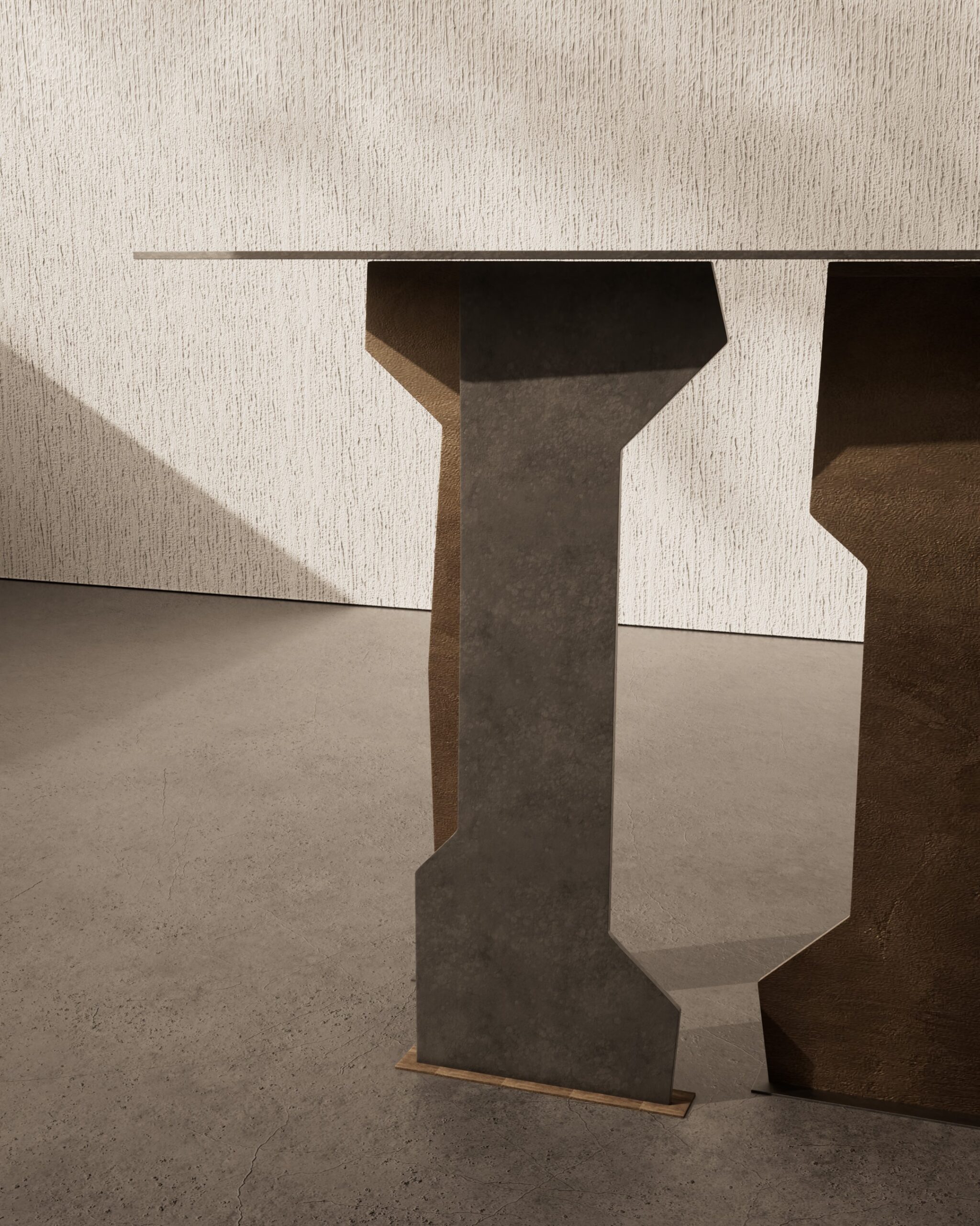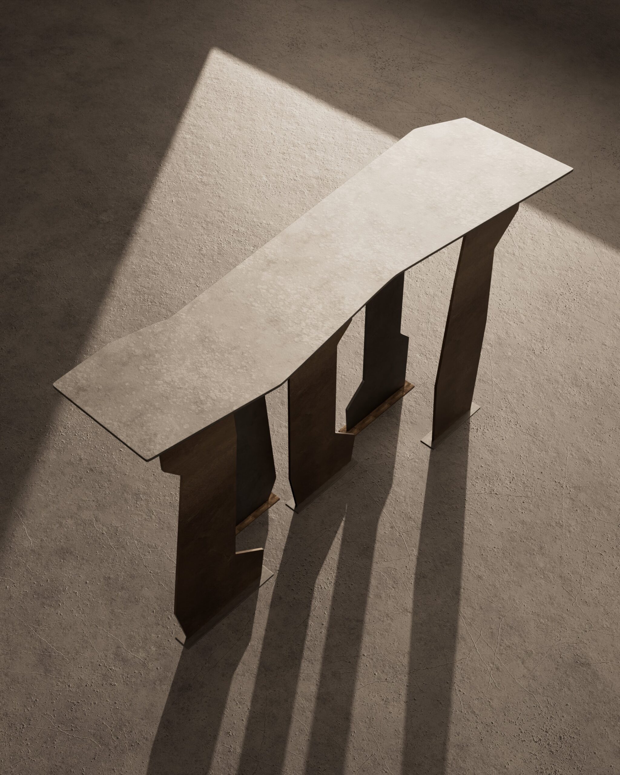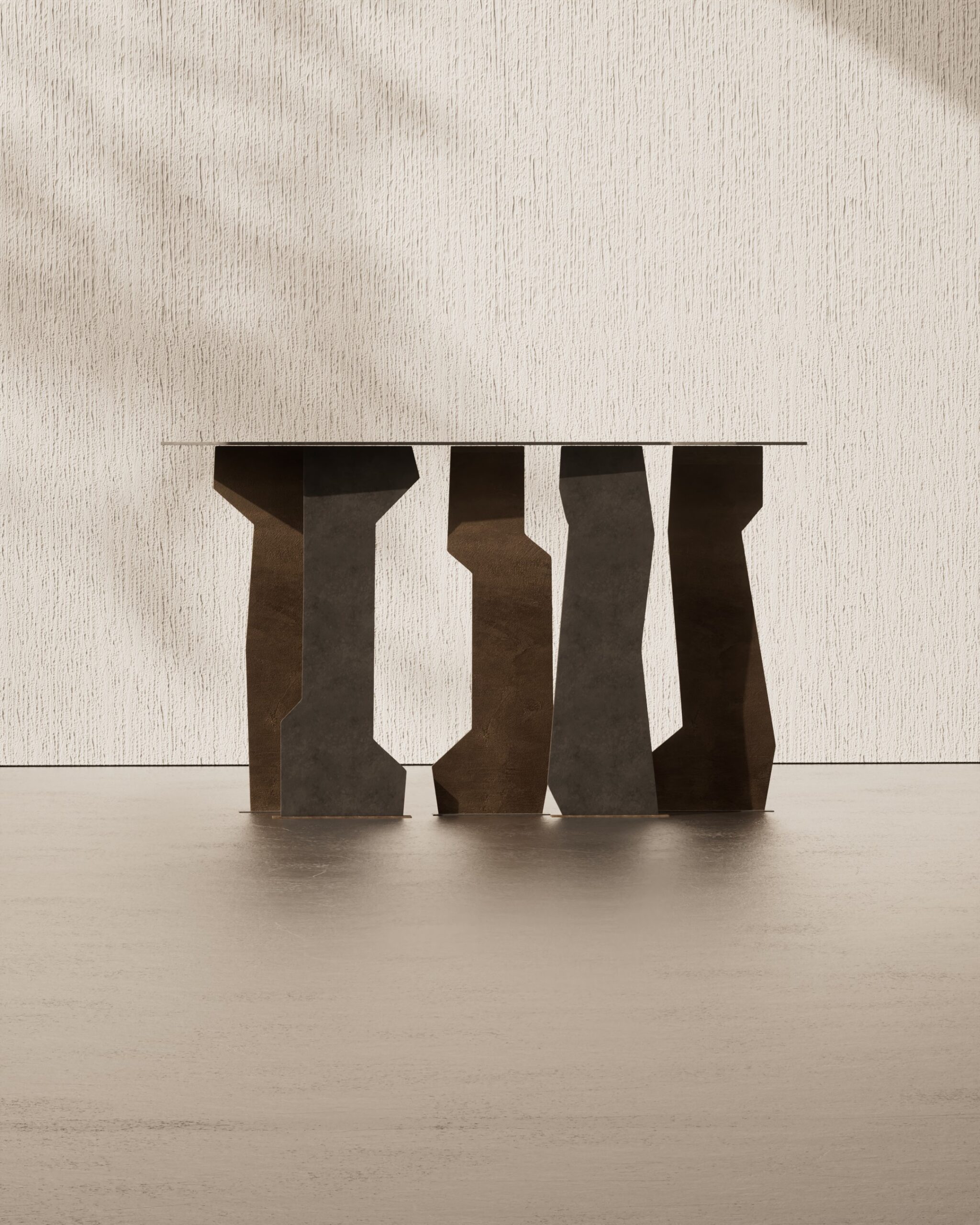 The PUZZLE console is an exploration of fragmented rhythm and negative space. Part of our Design Studio Collection, the piece is defined by its complex architectural base, composed of several vertical panels that appear as a series of interlocking, irregular gears or puzzle pieces. These supports are finished in a multi-tonal palette of charcoal and umber, featuring a rugged, matte texture that emphasizes their staggered, “sawtooth” top-lines. This dense, rhythmic foundation supports an ultra-thin floating top, creating a striking contrast between the heavy, tectonic movement of the base and the minimalist clarity of the surface.