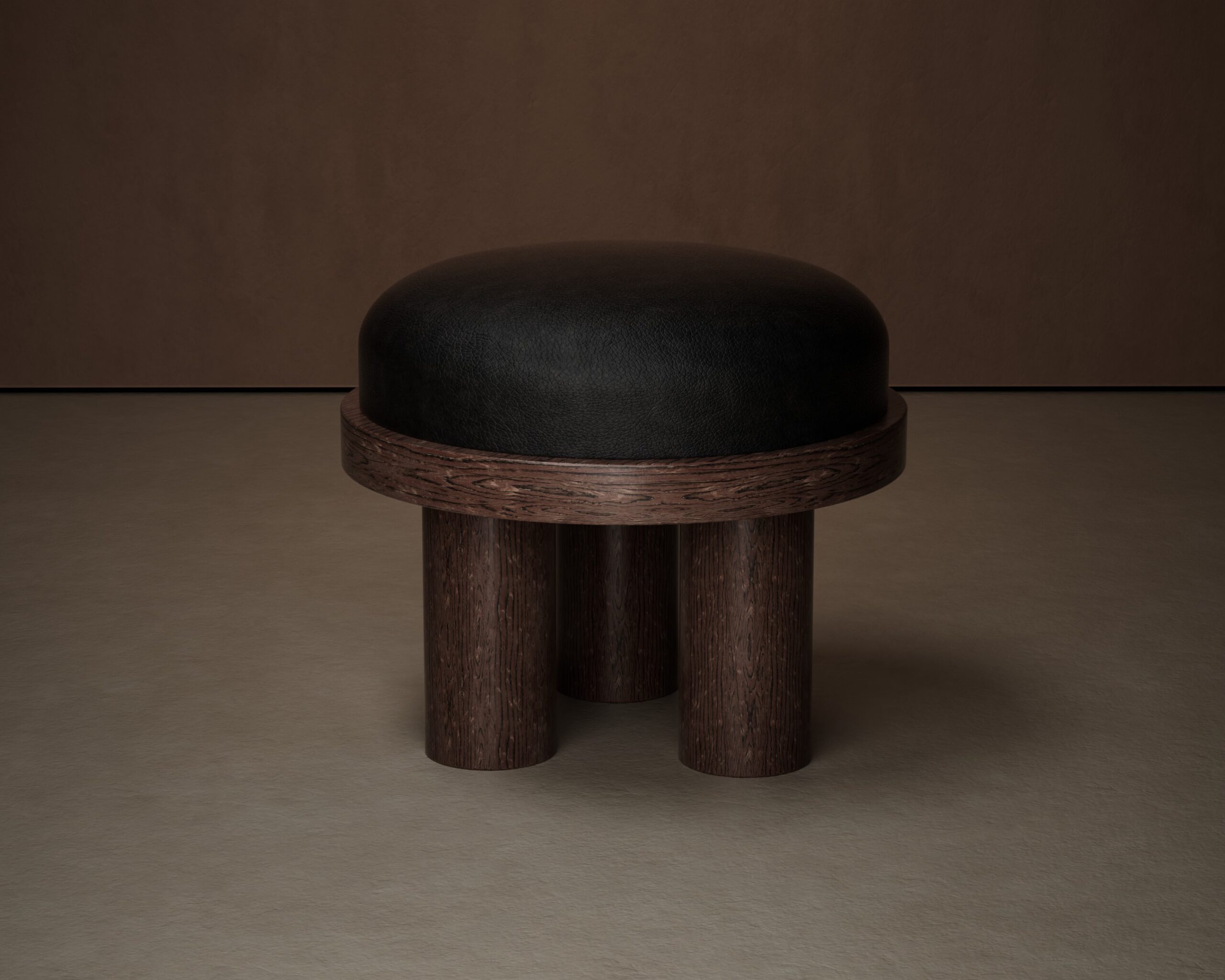 The QUAD pouf is a study in grounded luxury and architectural layering. Part of our Design Studio Collection, the piece is characterized by its generous, square seat upholstered in a premium deep chocolate leather that showcases a refined, natural grain. This plush volume is uniquely cradled by a heavy, textured charcoal wood base that follows the perimeter of the leather to create a bold, tiered effect. Supported by an integrated tripod-style pedestal base, the QUAD balances substantial visual weight with clean, contemporary lines, offering a versatile seating option that functions as a sculptural anchor in modern interiors.