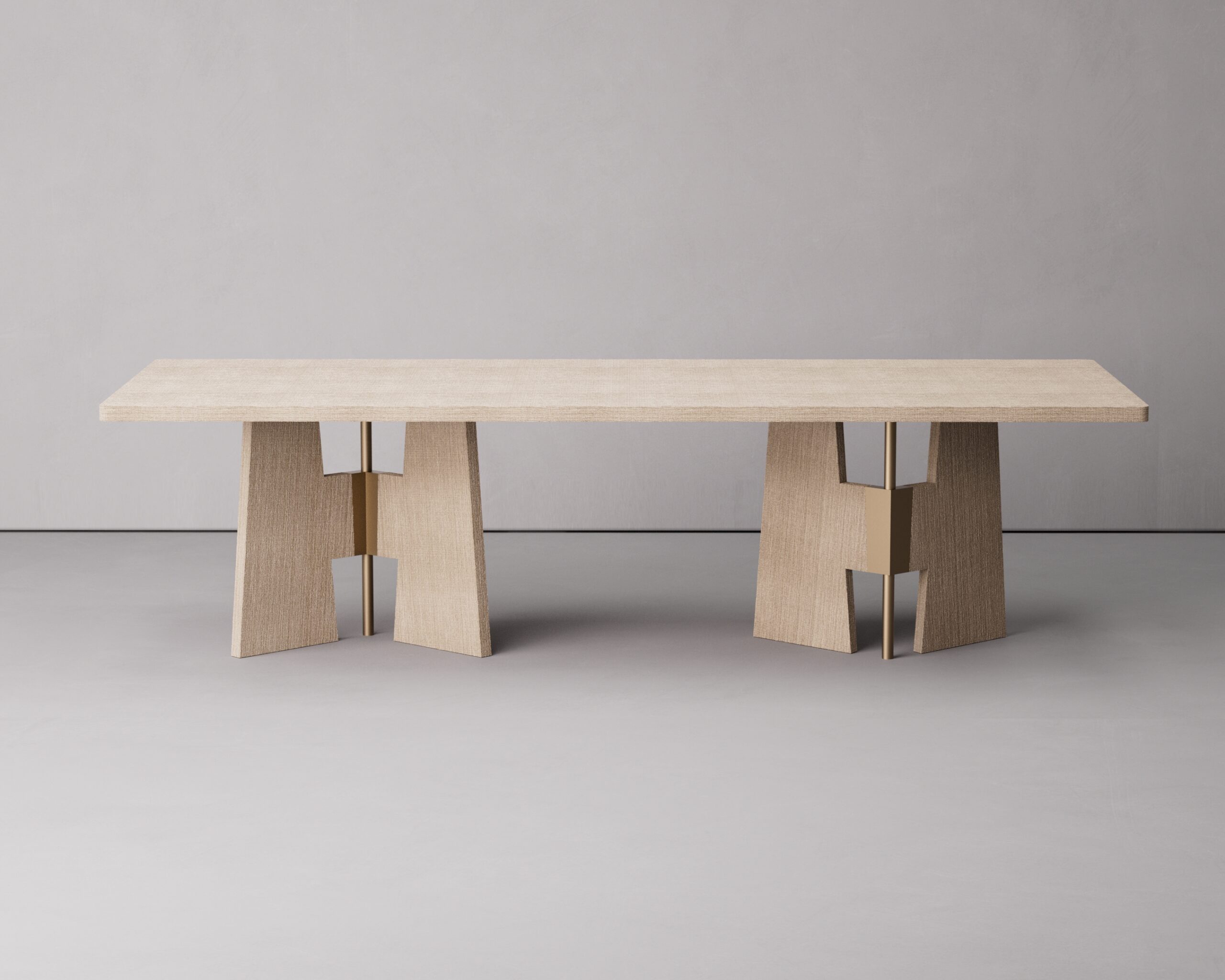 The visual narrative is defined by its two monumental pedestal supports. Each base features a unique, H-shaped profile clad in matching raffia, which is bisected by a satin brass metallic pillar and central bracket. This structural detailing creates a rhythmic play of light and shadow, highlighting the contrast between the organic, matte weave of the stone and the polished precision of the metal. The RAFFIA balances a commanding, wide-format presence with a refined artisanal soul, serving as a sophisticated focal point for high-end residential dining environments and coastal-inspired gallery spaces.