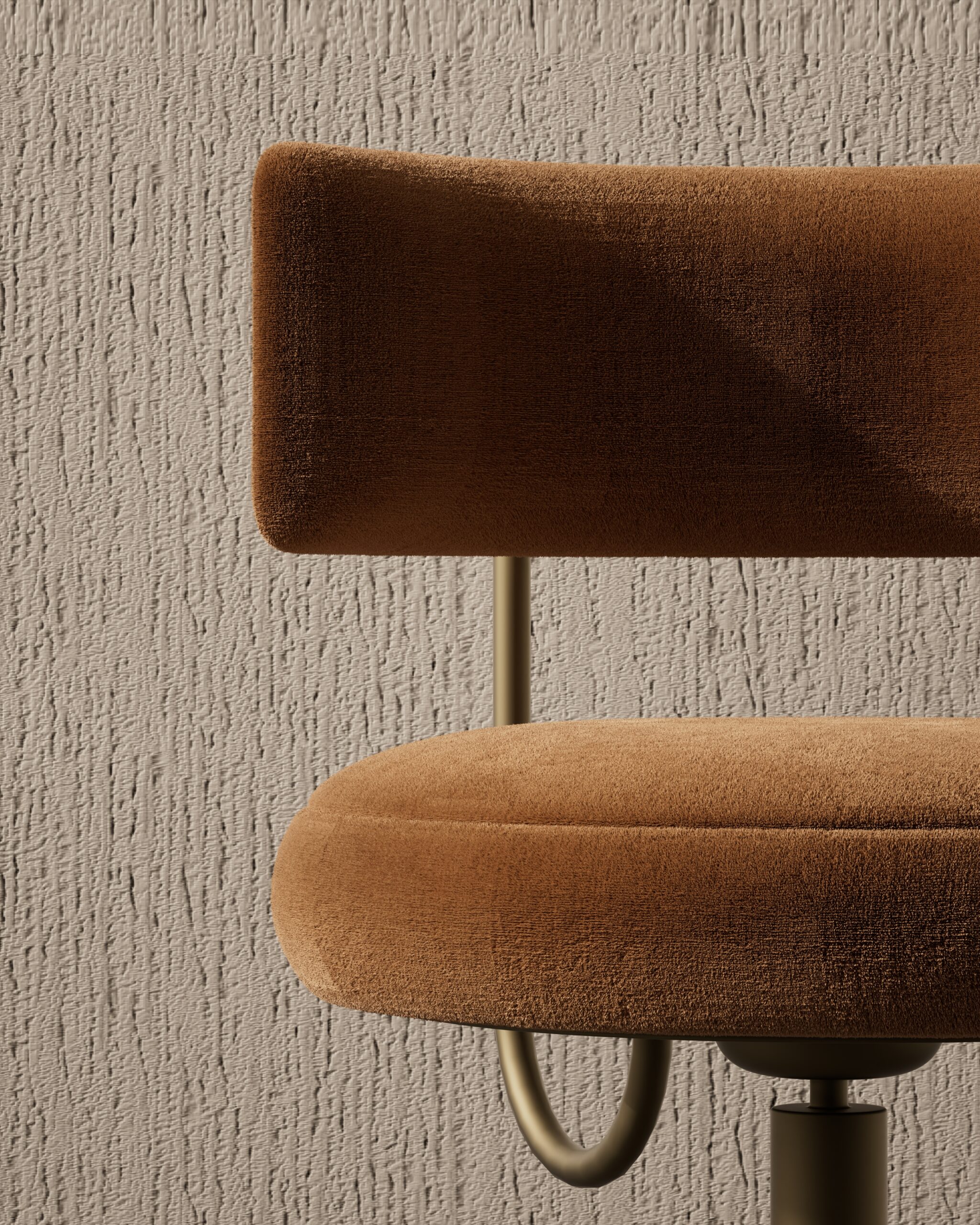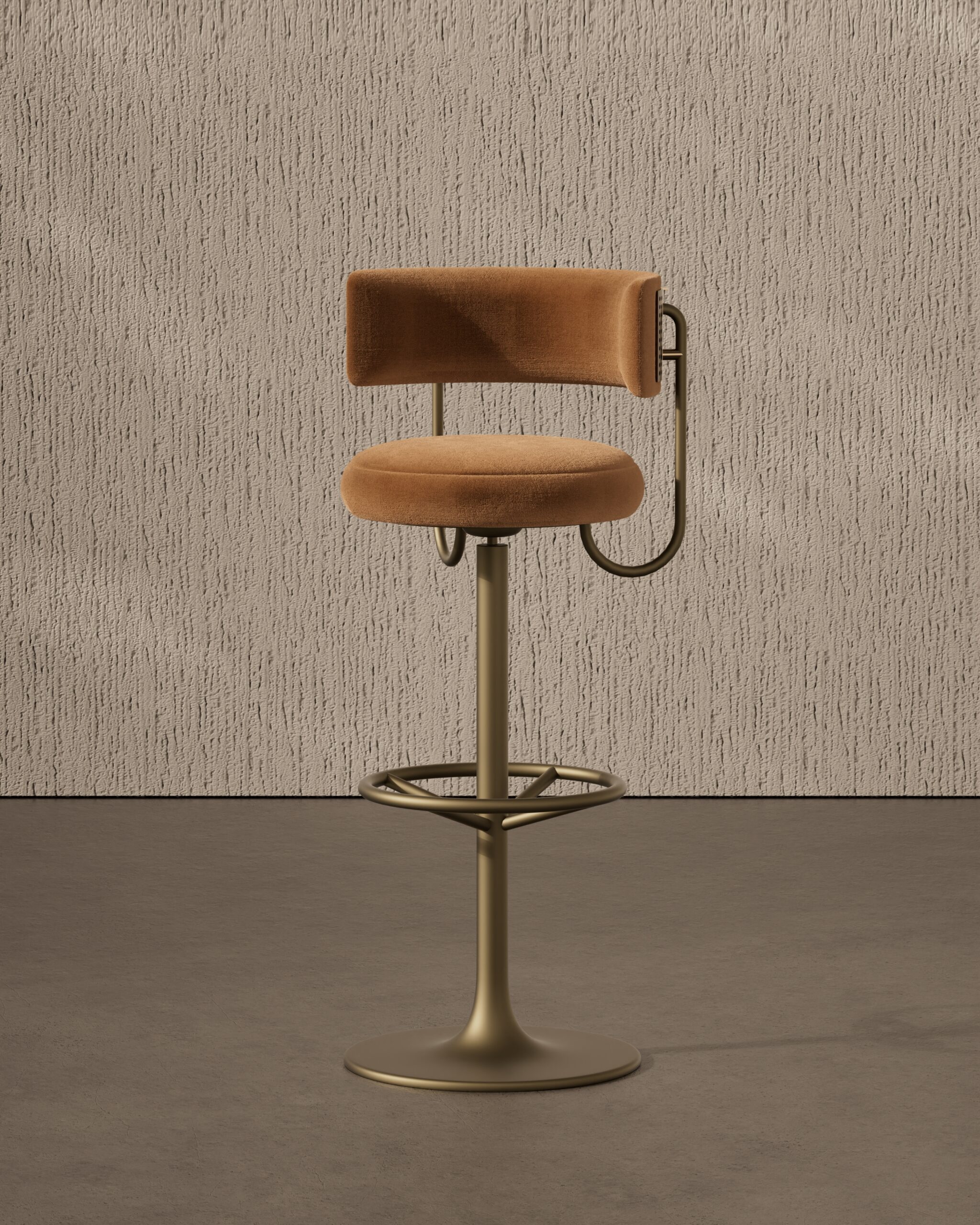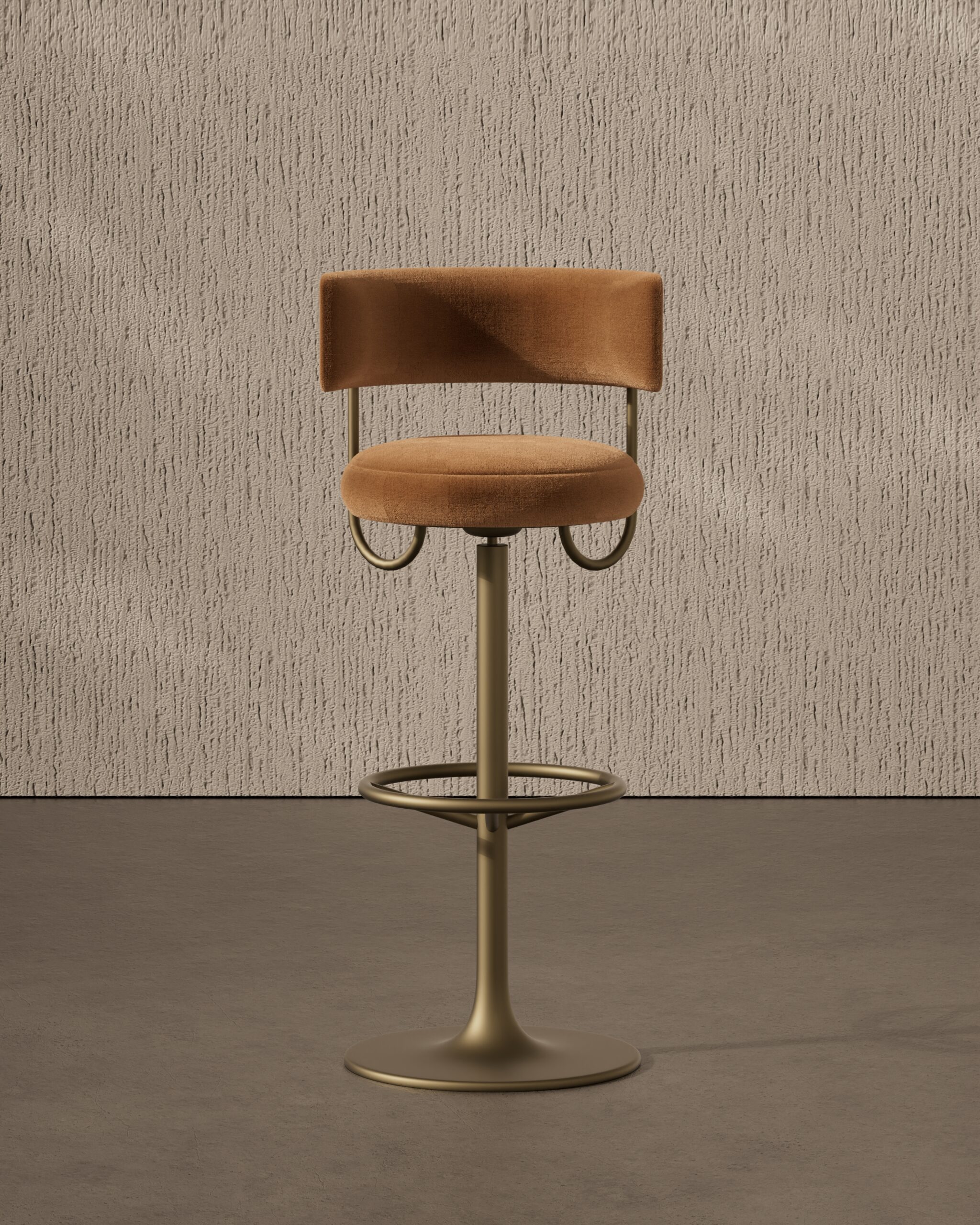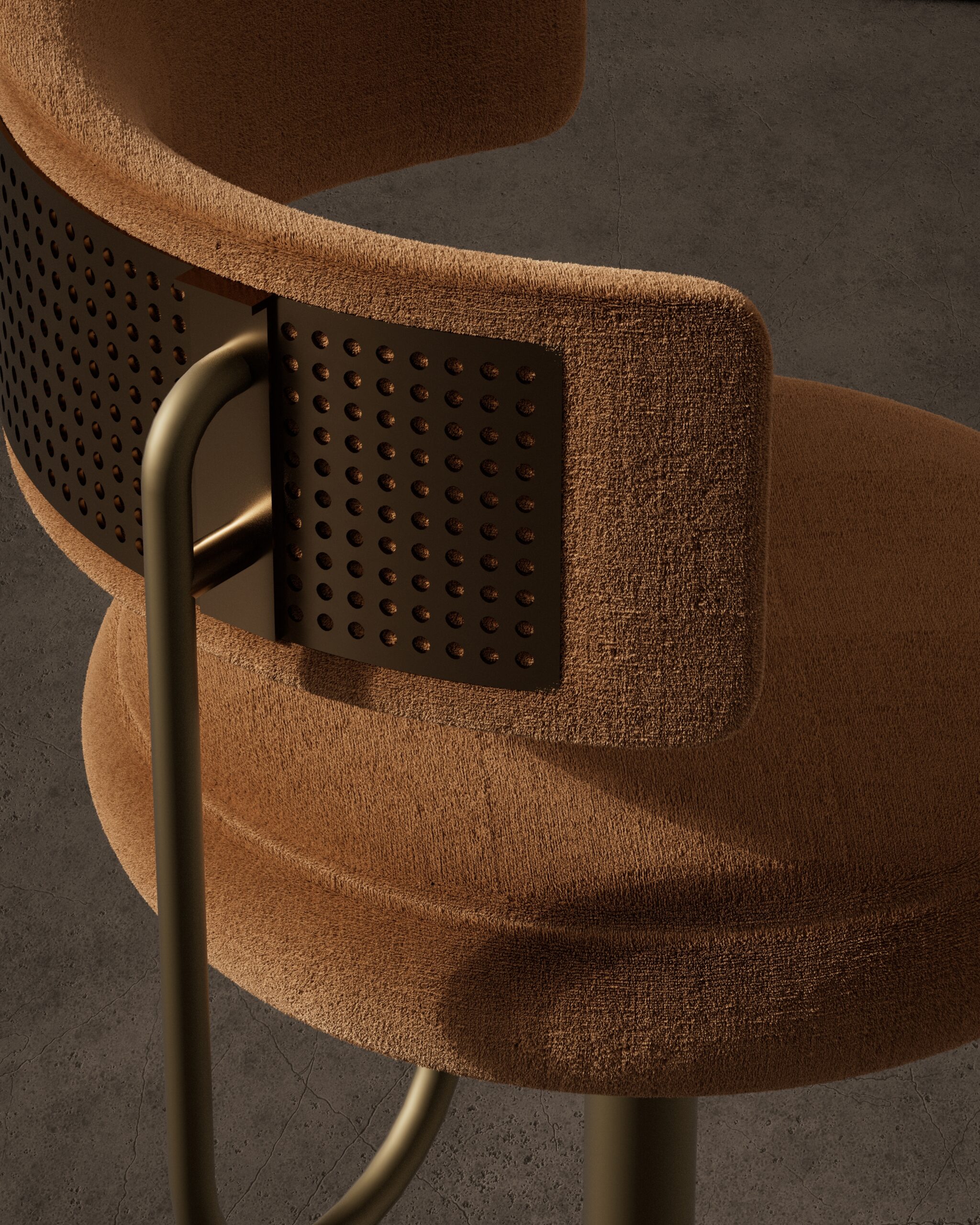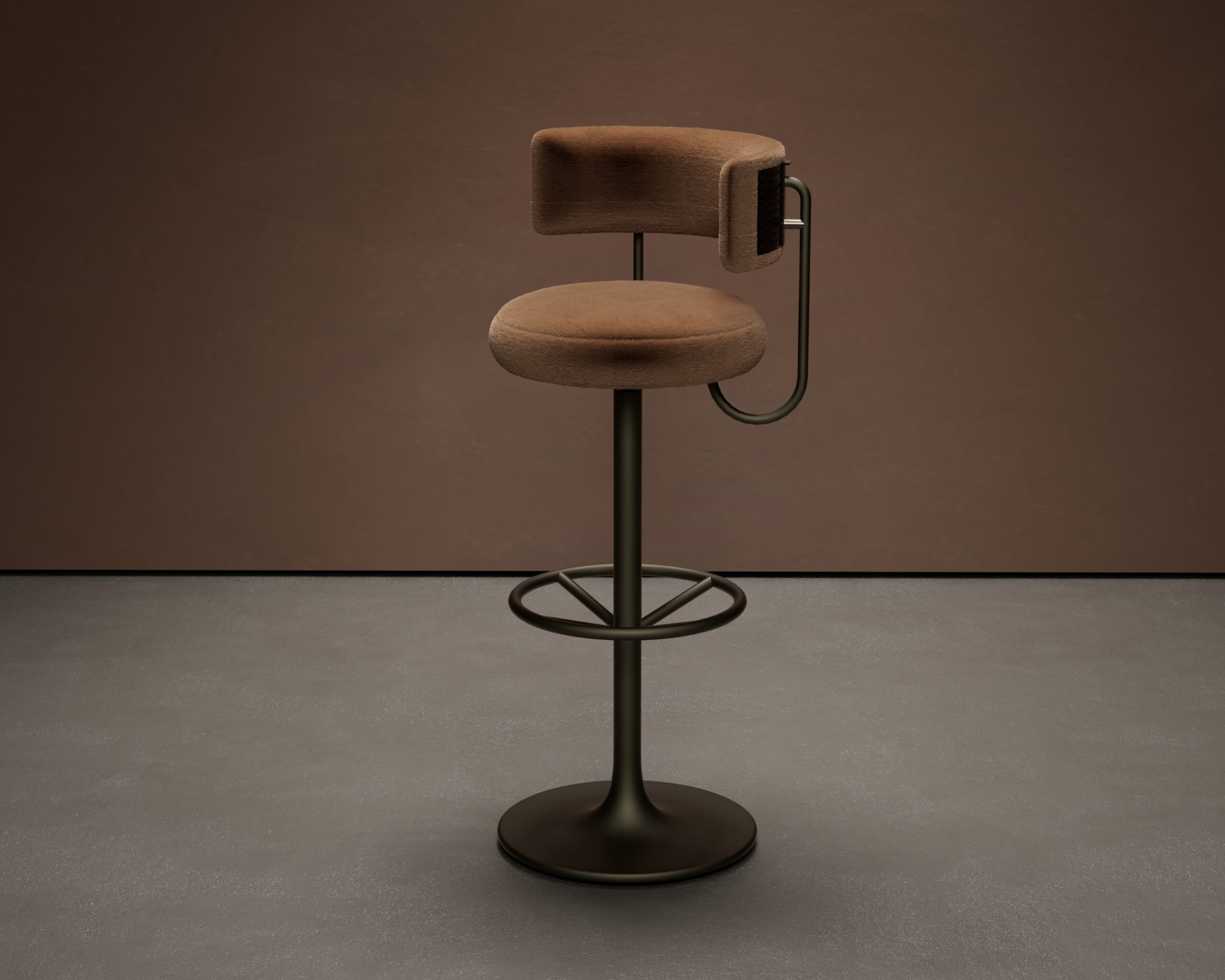 The REGAL bar stool is a study in modern glamour and industrial refinement. Part of our Design Studio Collection, it features a plush, rounded seat and a low-profile caramel bouclé backrest that appears to float behind the sitter. The design is defined by its signature perforated metallic detail on the rear of the backrest, which is supported by a slender, satin champagne frame. This interplay between soft, nubby textiles and the precise, geometric lines of the trumpet-style base creates a sophisticated silhouette that offers a elevated, jewel-like presence at any bar counter.
