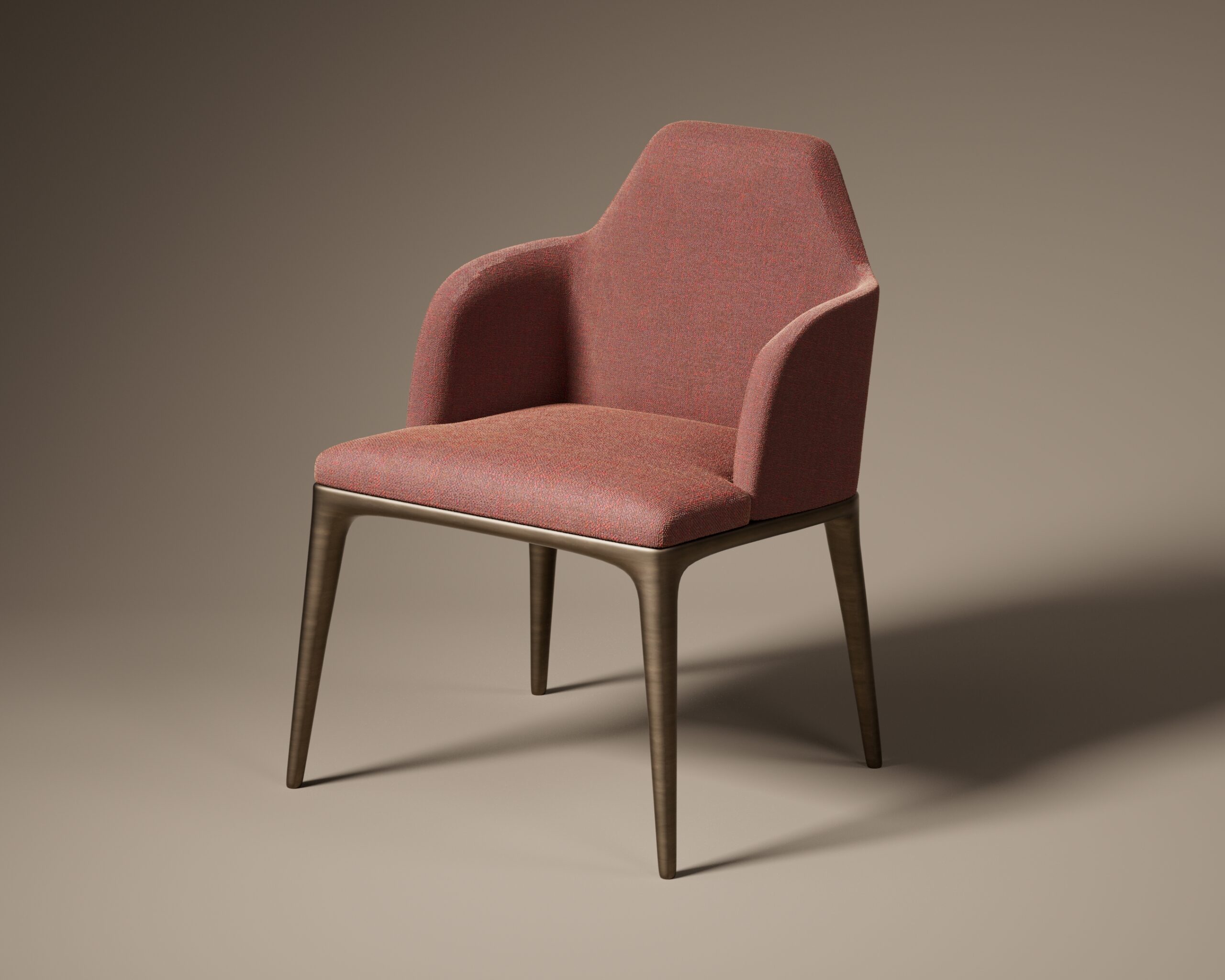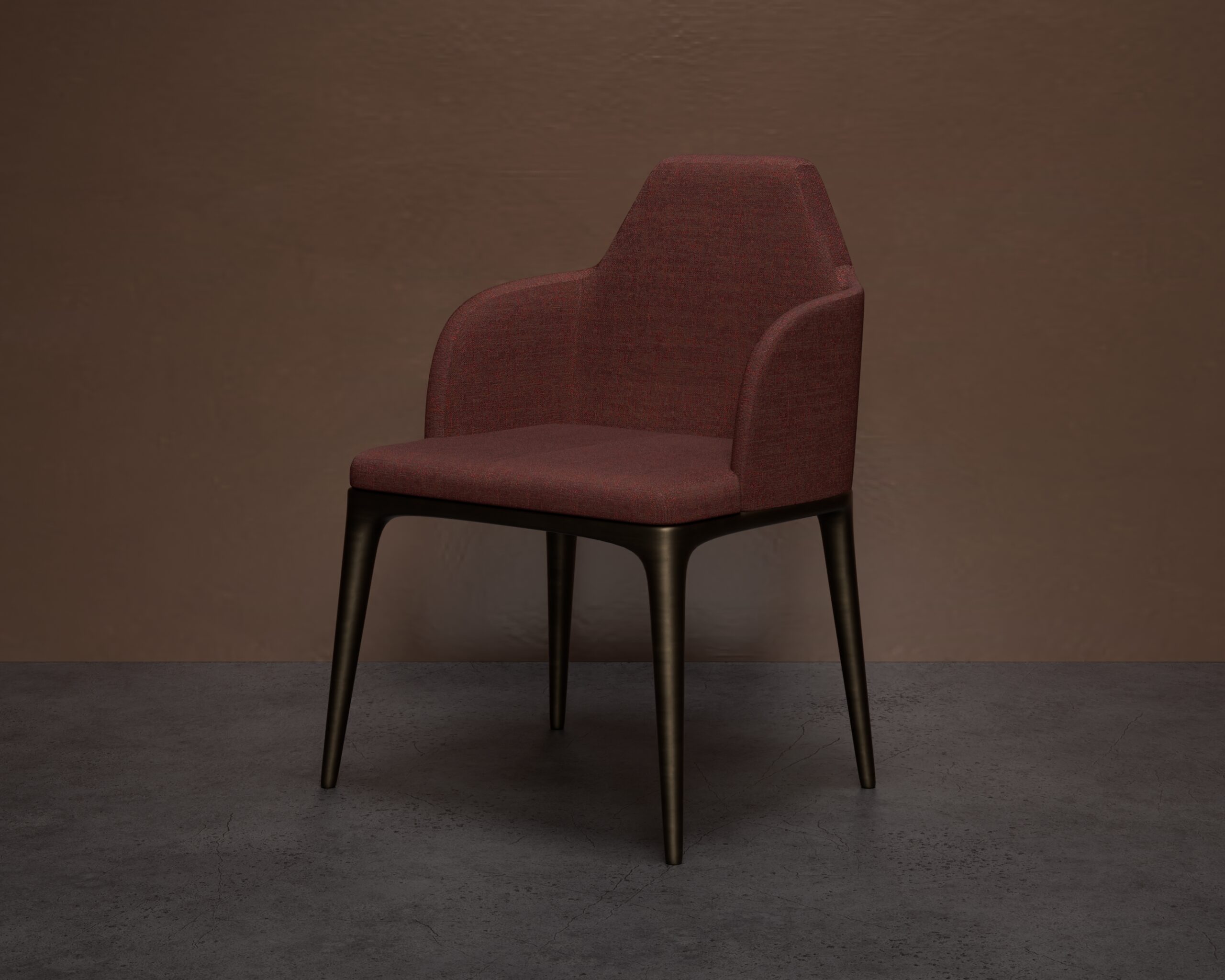 The RENZO dining chair is a study in sculptural geometry and warm material contrast. Part of our Design Studio Collection, it features a distinctive trapezoidal backrest and integrated arms upholstered in a tactile rust-toned performance textile. The chair is defined by its substantial satin bronze frame, which creates a continuous, gleaming line around the base of the seat before tapering into four sharp, architectural legs. This interplay between the sharp, clean lines of the metallic skeleton and the soft, organic warmth of the upholstery gives the RENZO a sophisticated, monolithic presence.