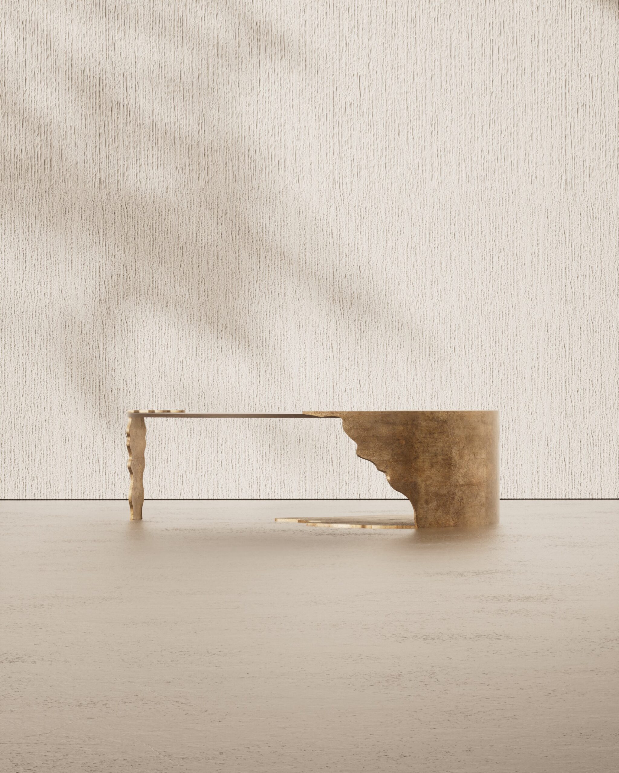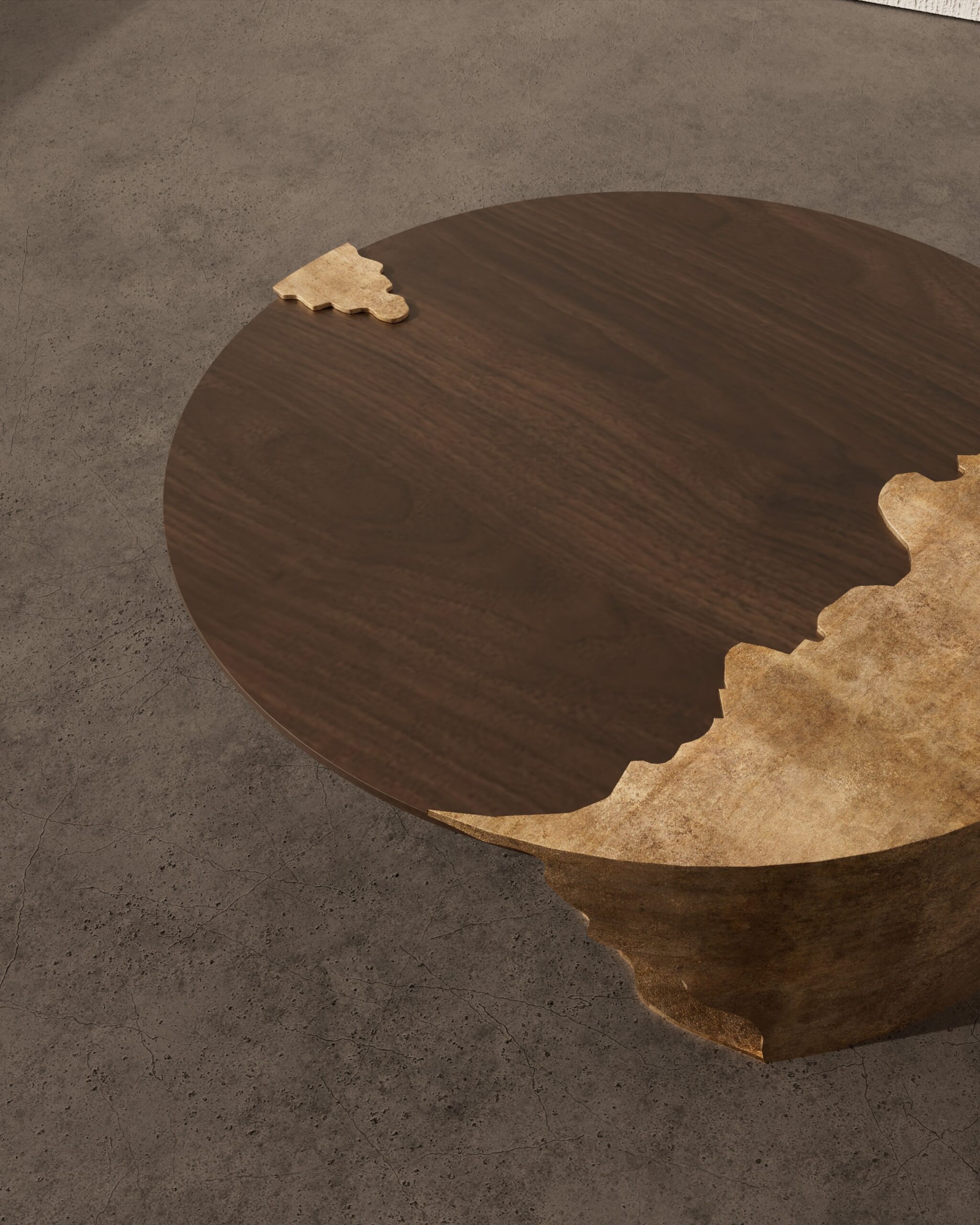The RIFT center table is an exploration of material tension and fractured geometry. Part of our Design Studio Collection, the piece is characterized by its circular deep walnut surface that appears to be partially consumed by a heavy, antique gold pedestal. This transition is defined by a jagged, “rift” edge that showcases the interplay between the smooth, organic grain of the wood and the raw, weathered texture of the metallic base. The design is further elevated by delicate, asymmetrical metallic inlays that resemble puzzle pieces, bridging the two distinct materials and creating a bold, sculptural presence that serves as a conversation piece in any modern interior.